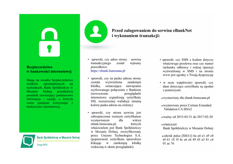 Przed zalogowaniem do serwisu eBankNet i wykonaniem transakcji: Bezpieczeństwo w bankowości internetowej • sprawdź, czy adres strony serwisu transakcyjnego został wpisany prawidłowo: https://ebank.bsmszana.pl Mając na uwadze bezpieczeństwo środków zgromadzonych na rachunkach, Bank Spółdzielczy w Mszanie Dolnej przedstawia poradnik zawierający podstawowe informacje i zasady, o których warto pamiętać korzystając z bankowości internetowej. • sprawdź, czy na pasku adresu strony została wyświetlona zamknięta kłódka, oznaczająca nawiązanie szyfrowanego połączenia z Bankiem (nowoczesne przeglądarki internetowe sygnalizują certyfikaty SSL rozszerzonej walidacji zmianą koloru paska adresu na zielony) • sprawdź, czy strona serwisu jest zabezpieczona ważnym certyfikatem wystawionym dla witryn ebank.bsmszana.pl, których właścicielem jest Bank Spółdzielczy w Mszanie Dolnej, zweryfikowany przez Unizeto Technologies S.A. (poprawność certyfikatu sprawdzisz klikając w zamkniętą kłódkę widoczną w oknie przeglądarki) • sprawdź, czy SMS z kodem dotyczy właściwego przelewu oraz czy numer rachunku odbiorcy i rodzaj operacji wyświetlonej w SMS i na stronie www jest zgodny z Twoją dyspozycją • w razie wątpliwości sprawdź, czy dane dotyczące certyfikatu są zgodne z poniższymi: wystawiony dla ebank.bsmszana.pl ► ► ► ► wystawiony przez Certum Extended Validation CA SHA2 ważny od 2015-03-31 do 2017-03-30 właściciel: Bank Spółdzielczy w Mszanie Dolnej odcisk palca [SHA1] 6a a4 e1 a9 c0 6f 61 18 3f 4c e6 cb 49 45 a3 81 c4 01 ac 76 ► Zasady bezpiecznego dostępu i wykonywania transakcji: ●połączenie z Internetem musi być bezpieczne (unikaj łączenia się z publicznej sieci WiFi) ●trzeba uważać na fałszywe certyfikaty bezpieczeństwa np. rozsyłane przy pomocy poczty elektronicznej ●należy zawsze korzystać z aktualnych wersji systemu operacyjnego, oprogramowania antywirusowego i przglądarki internetowej ●system pocztowy powinien być chroniony przed przychodzącym spamem. Wiadomości e-mail to jedna z najpopularnieszych dróg, jaką mogą do systemu pocztowego trafić wirusy i informacje, których celem jest wyłudzenie poufnych danych ●nie należy logować się do systemu eBankNet korzystając z odnośników otrzymanych pocztą elektroniczną lub znajdujących się na stronach nienależących do Banku ●należy unikać logowania z komputerów, do których dostęp mają również inne osoby (np. w kawiarenkach lub u znajomych) ●zalecane jest ręczne wpisywanie danych do zlecenia przelewu np. numerów rachunków, należy unikać wprowadzania numerów rachunków stosowania metody kopiuj/wklej ●nie należy instalować oprogramowania pochodzącego z nieznanych źródeł na komputerze, na którym korzysta się z bankowości internetowej ●należy zawsze kończyć pracę z systemem bankowości internetowej na komputerze korzystając z polecenia – wyloguj ●w przypadku wątpliwości co do prawidłowego działania bankowości internetowej lub stwierdzenia utraty środków należy niezwłocznie skontaktować się z Bankiem Pamiętaj, że Bank nigdy nie prosi o: instalację certyfikatów na komputerach i telefonach komórkowych ► podanie danych kart płatniczych i kredytowych (numer karty, kod PIN) oraz danych dotyczących Twojego telefonu (numer i model) ► udział w testowaniu funkcjonalności transakcyjnego ► nowych serwisu wykonanie przelewów testowych ani zwrot środków na rachunki innych klientów ► Dlaczego zabezpieczenia są tak ważne? Poziom bezpieczeństwa komunikacji pomiędzy witryną internetową, a jej Klientem zależy od poziomu bezpieczeństwa każdego z elementów uczestniczących w tej komunikacji. Zabezpieczenia po stronie Banku spełniają wysokie standardy i są cyklicznie testowane i audytowane. Dlatego działania cyberprzestępców ukierunkowane są na zabezpieczenia po stronie Klienta. Bezpieczeństwo korzystania z serwisu bankowości internetowej zależy również od jego użytkowników, w tym także świadomości z obszaru zabezpieczeń własnego komputera. Niezabezpieczony komputer jest narażony na ataki z użyciem złośliwego oprogramowania, a nawet całkowite przejęcie nad nim kontroli. W takiej sytuacji cyberprzestępca, mając do dyspozycji wykradzione dane uwierzytelniające (login, hasło, SMS potwierdzający transakcję) będzie usiłował zrealizować utworzony przez siebie przelew. W celu zachowania bezpieczeństwa środków zdeponowanych na rachunku bankowym staraj się odpowiednio zabezpieczyć komputer oraz stosuj podstawowe zasady bezpieczeństwa. Śledź na bieżąco informacje zamieszczone na stronie Banku https://bsmszana.pl/ dotyczące nowych zagrożeń w bankowości internetowej. Aktualne ostrzeżenia, komunikaty i poradniki dla Klientów banków publikuje również Związek Banków Polskich na stronach internetowych: http://zbp.pl/dlakonsumentów Przypominamy, że bezpieczeństwo transakcji realizowanych w serwisach bankowości internetowej zależy również od Ciebie oraz od zabezpieczeń urządzeń, za pomocą których łączysz się z Bankiem. W przypadku wątpliwości dotyczących bezpieczeństwa transakcji poprzez system eBankNet powinieneś niezwłocznie skontaktować się z helpdesk Banku Spółdzielczego w Mszanie Dolnej 183319222