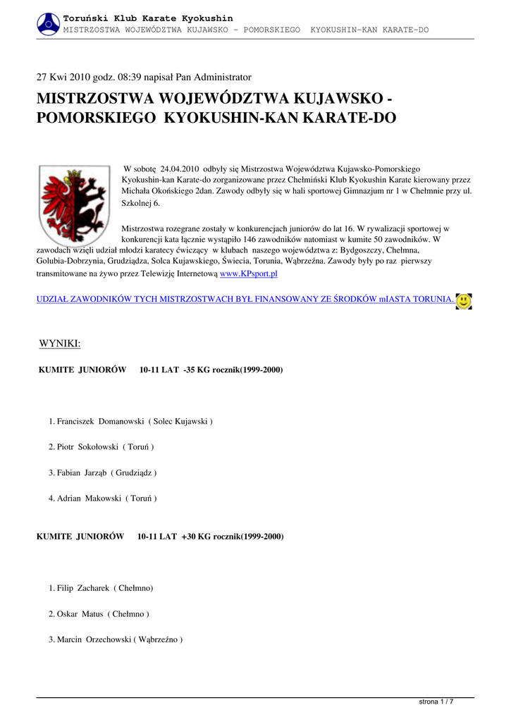 Toruński Klub Karate Kyokushin MISTRZOSTWA WOJEWÓDZTWA KUJAWSKO - POMORSKIEGO KYOKUSHIN-KAN KARATE-DO 27 Kwi 2010 godz. 08:39 napisał Pan Administrator MISTRZOSTWA WOJEWÓDZTWA KUJAWSKO POMORSKIEGO KYOKUSHIN-KAN KARATE-DO W sobotę 24.04.2010 odbyły się Mistrzostwa Województwa Kujawsko-Pomorskiego Kyokushin-kan Karate-do zorganizowane przez Chełmiński Klub Kyokushin Karate kierowany przez Michała Okońskiego 2dan. Zawody odbyły się w hali sportowej Gimnazjum nr 1 w Chełmnie przy ul. Szkolnej 6. Mistrzostwa rozegrane zostały w konkurencjach juniorów do lat 16. W rywalizacji sportowej w konkurencji kata łącznie wystąpiło 146 zawodników natomiast w kumite 50 zawodników. W zawodach wzięli udział młodzi karatecy ćwiczący w klubach naszego województwa z: Bydgoszczy, Chełmna, Golubia-Dobrzynia, Grudziądza, Solca Kujawskiego, Świecia, Torunia, Wąbrzeźna. Zawody były po raz pierwszy transmitowane na żywo przez Telewizję Internetową www.KPsport.pl UDZIAŁ ZAWODNIKÓW TYCH MISTRZOSTWACH BYŁ FINANSOWANY ZE ŚRODKÓW mIASTA TORUNIA. WYNIKI: KUMITE JUNIORÓW 10-11 LAT -35 KG rocznik(1999-2000) 1. Franciszek Domanowski ( Solec Kujawski ) 2. Piotr Sokołowski ( Toruń ) 3. Fabian Jarząb ( Grudziądz ) 4. Adrian Makowski ( Toruń ) KUMITE JUNIORÓW 10-11 LAT +30 KG rocznik(1999-2000) 1. Filip Zacharek ( Chełmno) 2. Oskar Matus ( Chełmno ) 3. Marcin Orzechowski ( Wąbrzeźno ) strona 1 / 7 Toruński Klub Karate Kyokushin MISTRZOSTWA WOJEWÓDZTWA KUJAWSKO - POMORSKIEGO KYOKUSHIN-KAN KARATE-DO 4. Kewin Pawłowski ( Grudziądz ) KUMITE JUNIOREK 10-11 LAT OPEN rocznik(1999-2000) 1. Emilia Januszewska ( Wąbrzeźno ) 2. Martyna Filipiak ( Solec Kujawski ) 3. Marta Talarek ( Toruń ) 4. Karina Tylmanowska ( Wąbrzeźno ) KUMITE JUNIORÓW 12-13 LAT -40 KG rocznik(1997-1998) 1. Daniel Bieńkowski ( Solec Kujawski ) 2. Karol Spiczonek ( Solec Kujawski ) 3. Emil Januszewski ( Wąbrzeźno ) 4. Oskar Okoński ( Chełmno ) KUMITE JUNIORÓW 12-13 LAT +40 KG rocznik(1997-1998) 1. Maciej Paszkot ( Chełmno ) 2. Adam Ziółkowski ( Solec Kujawski ) 3. Norbert Ostrowski ( Wąbrzeźno ) 4. Piotr Oskwarek ( Wąbrzeźno ) KUMITE JUNIOREK 12-13 LAT OPEN rocznik(1997-1998) strona 2 / 7 Toruński Klub Karate Kyokushin MISTRZOSTWA WOJEWÓDZTWA KUJAWSKO - POMORSKIEGO KYOKUSHIN-KAN KARATE-DO 1. Katarzyna Socha ( Toruń ) 2. Dominika Lewandowska ( Grudziądz ) 3. Marcelina Grabowska ( Toruń ) 4. Nikola Chalecka ( Toruń ) KUMITE JUNIORÓW 14-15 LAT -50 KG rocznik(1995-1996) 1. Michał Hubner ( Solec Kujawski ) 2. Bartek Zaleśkiewicz ( Wąbrzeźno ) 3. Adam Owsiński ( Solec Kujawski ) KUMITE JUNIORÓW 14-15 LAT +50 KG rocznik(1995-1996 1. Krzysztof Paszkot ( Chełmno ) 2. Arkadiusz Półgęsek ( Chełmno ) 3. Norbert Wiemann ( Solec Kujawski ) 4. Mariusz Grabowski ( Chełmno ) KUMITE JUNIOREK 14-15 LAT OPEN rocznik(1995-1996) 1. Dominika Figurska ( Wąbrzeźno ) 2. Katarzyna Kobusińska ( Chełmno ) 3. Dominika Hapka ( Grudziądz ) DRUŻYNOWO KUMITE strona 3 / 7 Toruński Klub Karate Kyokushin MISTRZOSTWA WOJEWÓDZTWA KUJAWSKO - POMORSKIEGO KYOKUSHIN-KAN KARATE-DO 1. Solec Kujawski - 17 punktów 2. Chełmno – 15 punktów 3. Wąbrzeźno – 11 punktów 4. Toruń – 7 punktów 5. Grudziądz – 4 punkty KATA PIERWSZY KROK DO 10 LAT rocznik 2000 ( Chłopcy - Dziewczęta ) 1. Helena Garside ( Toruń ) 2. Zuzanna Mowińska ( Toruń ) 3. Patryk Witkowski ( Wąbrzeźno ) 4. Jędrzej Poczwardowski ( Toruń ) KATA DO 10 LAT rocznik 2000 ( Chłopcy) - Dziewczęta ) 1. Hubert Rokoszewski ( Chełmno ) 2. Marta Talarek ( Toruń ) 3. Mikołaj Wilento ( Toruń ) 4. Julia Kalinowska ( Golub-Dobrzyń ) KATA DO 12 LAT rocznik 1998-1999 ( Chłopcy) - Dziewczęta ) 1. Franciszek Domanowski ( Solec Kujawski ) strona 4 / 7 Toruński Klub Karate Kyokushin MISTRZOSTWA WOJEWÓDZTWA KUJAWSKO - POMORSKIEGO KYOKUSHIN-KAN KARATE-DO 2. Patrycja Siwicka ( Świecie ) 3. Dominika Lewandowska ( Golub-Dobrzyń ) 4. Piotr Sokołowski ( Toruń ) KATA DO 14 LAT rocznik 1996-1997 ( Chłopcy) - Dziewczęta ) 1. Martyna Wiemann ( Solec Kujawski ) 2. Daniel Bieńkowski ( Solec Kujawski ) 3. Oskar Okoński ( Chełmno ) 4. Adrian Kowalski ( Chełmno ) KATA DO 16 LAT rocznik 1994-1995 ( Chłopcy) - Dziewczęta ) 1. Marcelina Grabowska ( Toruń ) 2. Weronika Krajewska ( Toruń ) 3. Arkadiusz Półgęsek ( Chełmno ) 4. Piotr Oskwarek ( Wąbrzeźno ) DRUŻYNOWO KATA: 1. Toruń – 21 punktów 2. Solec Kujawski – 11 punktów 3. Chełmno 9 - punktów 4. Wąbrzeźno, Golub - Dobrzyń, Świecie po 3- punkty strona 5 / 7 Toruński Klub Karate Kyokushin MISTRZOSTWA WOJEWÓDZTWA KUJAWSKO - POMORSKIEGO KYOKUSHIN-KAN KARATE-DO Mistrzostwa zorganizowane były przy wsparciu: Urzędu Marszałkowskiego Województwa Kujawsko-Pomorskiego, Urzędu Miasta Chełmna, Starostwa Powiatu Chełmińskiego oraz sponsorów: Firma Midar -Dariusz Piekarczyk, Firma Prodomo -Marcin Laszuk, Firma Forum -Pan Piotr Kaźmierczak, Firma Prodomo Prim -Paulina Wojciechowska. Organizatorzy składają podziękowania dla Pani Moniki Smól z Gazety Pomorskiej za wsparcie medialne i dla Pana Piotra z portalu internetowego. Gościem specjalnym był Poseł na Sejm Rzeczpospolitej Pan Janusz Dzięcioł – miłośnik kyokushin karate i sztuk walki oraz shihan Bogusław Jeremicz 5dan prezes Polskiej Federacji Kyokushin-kan Karate-do. Sędzią Głównym był sensei Artur Wilento 4dan, który również prowadził cały turniej. Poszczególne konkurencje oceniali sędziowie na co dzień instruktorzy i doświadczeni zawodnicy min: Sławomir Kłosiński – wielokrotny Mistrz Polski w Kumite do 70kg i reprezentant Polski, Andrzej Poczwardowski - wielokrotny Mistrz Polski Kumite do 80kg i reprezentant Polski, Anna Urbańska – Mistrzyni Polski w kata, Sylwia Reichel – reprezentantka Polski w kumite oraz Tomasz Wrzesień, Dorota Zawadzka, Dawid Jędryka, Marcin Czajkowski, Piotr Horoszkiewicz, Łukasz Jóźwiak, Artur Aniołowski, Jarosław Grabowski. Serdecznie dziekujemy rodzicom 