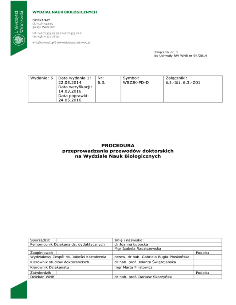 Załącznik nr. 1 do Uchwały RW WNB nr 94/2014 Wydanie: 6 Data wydania 1: 22.05.2014 Data weryfikacji: 14.03.2016 Data poprawki: 24.05.2016 Nr: 6.3. Symbol: WSZJK-PD-D Załączniki: 6.3.-I01, 6.3.-Z01 PROCEDURA przeprowadzania przewodów doktorskich na Wydziale Nauk Biologicznych Sporządził: Pełnomocnik Dziekana ds. dydaktycznych Imię i nazwisko: dr Joanna Łubocka Mgr Izabela Radziszewska Zaopiniował: Wydziałowy Zespół ds. Jakości Kształcenia przew. dr hab. Gabriela Bugla-Płoskońska Podpis: Kierownik studiów doktoranckich dr hab. prof. Jolanta Świętojańska Kierownik Dziekanatu mgr Marta Filistowicz Zatwierdził: Dziekan WNB dr hab. prof. Dariusz Skarżyński Podpis: 1 1. Cel i zakres procedury Procedura przeprowadzania przewodów doktorskich na Wydziale Nauk Biologicznych. 2. Odpowiedzialność Dziekan – przygotowanie wniosku do Rady WNB o powołanie Komisji ds. przeprowadzania przewodów doktorskich (na czas trwania kadencji). Rada WNB – powołanie Wydziałowych komisji ds. przeprowadzania przewodów doktorskich, uchwalenie regulaminu ich działania, podjęcie uchwał przedmiotowych w sprawie: a) wszczęcia (lub odmowy) przewodu doktorskiego, b) wyznaczenia promotora lub promotora i promotora pomocniczego (ewentualnie kopromotora w przypadku przewodów prowadzonych wspólnie z jednostką zagraniczną), c) wyznaczenia recenzentów (lub odmowy), d) określenia zakresu egzaminów doktorskich, e) powołania Komisji przeprowadzających egzaminy doktorskie i Komisji doktorskiej, nadania (lub odmowy) stopnia doktora, f) zamknięcia przewodu doktorskiego. Opiekun naukowy – niezbędna opieka merytoryczna i metodyczna nad pracą naukowo-badawczą kandydata, ocena postępów pracy, udział w prezentacji koncepcji rozprawy doktorskiej przez Komisją ds. przewodów doktorskich. Promotor rozprawy doktorskiej – opieka nad procesem planowania badań, ich realizacji i analizy wyników, pomoc w redagowaniu pracy, sporządzenie opinii na temat rozprawy doktorskiej przy kierowaniu jej do recenzji, uczestnictwo w pracach Komisji przeprowadzających egzaminy doktorskie (jeżeli powołano), i Komisji doktorskiej. Promotor pomocniczy – pomoc w opiece nad doktorantem, w tym w szczególności w procesie planowania badań, ich realizacji i analizy wyników, udział w Komisji doktorskiej bez prawa głosu (jeżeli powołano) Recenzent rozprawy doktorskiej – przygotowanie recenzji rozprawy doktorskiej wraz z uzasadnioną oceną spełniania przez rozprawę doktorską warunków określonych w art. 13 ust. 1 Ustawy o stopniach i tytule, oceną indywidualnego wkładu kandydata w powstanie rozprawy (jeżeli stanowi ona część pracy zbiorowej), wnioskami dotyczącymi uzupełnienia lub poprawienia rozprawy (jeżeli są konieczne). Wydziałowa komisja ds. przeprowadzania przewodów doktorskich zwana dalej komisją ds. przewodów doktorskich – przyjmowanie wniosków o wszczęcie przewodu doktorskiego oraz innych związanych z przeprowadzeniem przewodu, wyznaczenie terminu i miejsca prezentacji koncepcji rozprawy doktorskiej przez kandydata, opiniowanie i kierowanie do Rady WNB wniosków o: wszczęcie przewodu doktorskiego, wyznaczenie promotora (promotora pomocniczego), wyznaczenie recenzentów rozprawy doktorskiej, powołanie Komisji przeprowadzającej egzaminy doktorskie oraz wyznaczenie przedmiotów objętych egzaminami i zaproponowanie terminów ich przeprowadzenia, wyznaczenie recenzentów, powołanie Komisji doktorskiej, przedstawienie Radzie Wydziału wyciągów protokołów z posiedzeń, wywieszenie ogłoszeń o obronie doktorskiej. Komisje do przeprowadzenia egzaminów doktorskich – przeprowadzenie egzaminów doktorskich w terminach uzgodnionych z Komisją ds. przewodów doktorskich, sporządzenie protokołów egzaminów doktorskich. Komisja doktorska: - podjęcie uchwał przedmiotowych w sprawie: a) przyjęcia (lub odmowy przyjęcia) rozprawy doktorskiej i dopuszczenie (lub odmowa) do publicznej obrony. Przekazanie kandydatowi i promotorowi wniosków dotyczących uzupełnienia (poprawienia) rozprawy doktorskiej, przyjęcie uzupełnionej (poprawionej) rozprawy. Przygotowanie protokołu z posiedzenia oraz uchwały wg obowiązującego wzoru. b) przyjęcia (lub odmowy) publicznej obrony rozprawy doktorskiej. Przygotowanie protokołu dopuszczenia do publicznej obrony rozprawy doktorskiej oraz uchwały wg obowiązującego wzoru. 2 - przeprowadzenie publicznej obrony rozprawy, przygotowanie protokołu z publicznej obrony rozprawy doktorskiej, przygotowanie projektu uchwały dla Rady Wydziału w sprawie nadania stopnia doktora. Pracownik Dziekanatu: - sporządzenie uchwał RW w sprawie wszczęcia przewodu doktorskiego, wyznaczenie promotora lub promotora i promotora pomocniczego (odmowy), określenia zakresu egzaminów doktorskich, wyznaczenia recenzentów (odmowy), powołania Komisji do przeprowadzenia egzaminów doktorskich oraz nadania, wyróżnienia rozprawy doktorskiej (odmowy), - zamieszczanie ww. uchwał na stronie internetowej wydziału oraz wprowadzanie danych do systemu USOS, - przyjmowanie rozpraw doktorskich wraz z opinią promotora o pracy, oświadczeniami, streszczeniem rozprawy w języku polskim i angielskim, - przygotowanie umów za promotorstwo/sporządzenie recenzji, - wysyłanie rozprawy doktorskiej promotorowi/recenzentom wraz z umowami, - zamieszczenie na stronie WNB streszczenia oraz recenzji rozprawy doktorskiej oraz wysłanie informacji do Centralnej Komisji, - zawiadamianie kandydata o wpłynięciu recenzji, - sporządzenie zawiadomienia o nadaniu stopnia naukowego doktora oraz informacji dotyczącej osoby, której nadano stopień doktora oraz przekazywanie wraz z Kartą Synaba do Działu Badań Naukowych UWr, - przygotowanie dyplomu doktora, - przygotowanie uroczystej promocji doktorskiej, - archiwizowanie dokumentacji przewodu doktorskiego i przekazanie do archiwum UWr 3. Opis postępowania 3.1. Terminy Tematy rozpraw doktorskich, zaproponowane przez samodzieln