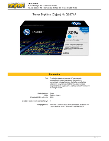 DEVCOM II Al. Korfantego 81 - Katowice 40-161 Tel. 32 259 27 19 - Serwis: 32 259 22 60 - Fax: 32 258 05 53 Toner Błękitny (Cyjan) 4k Q2671A Parametry Opis Oryginalne kasety z tonerem HP zapewniają oszczędność czasu i pieniędzy. Mechanizmy komunikacji między kasetą a drukarką umożliwiają ustawienie optymalnej jakość druku, zapewniając bezproblemowe uzyskiwanie profesjonalnych wydruków za każdym razem. Rodzaj wkładu Toner Kolor Błękitny (cyan) Wydajność (5% pokrycie) 4000 Liczba w opakowaniu jednostkowym 1 Kompatybilność HP Color LaserJet 3500 / HP Color LaserJet 3500n HP Color LaserJet 3550 / HP Color LaserJet 3550n 1/1 Powered by TCPDF (www.tcpdf.org)