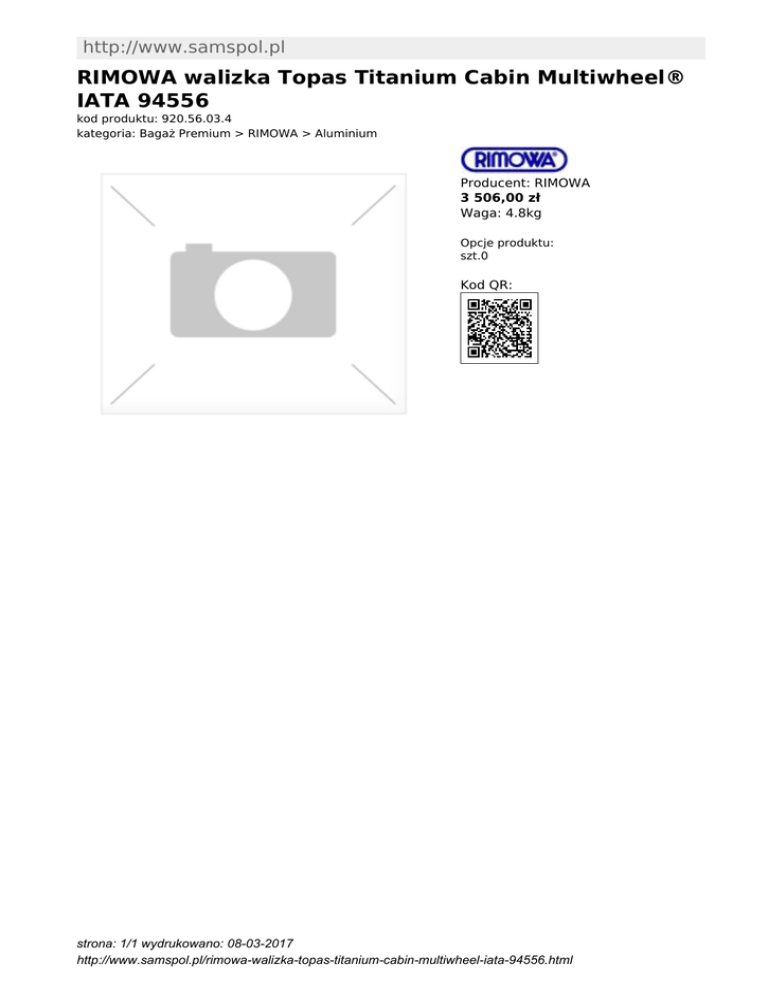 http://www.samspol.pl RIMOWA walizka Topas Titanium Cabin Multiwheel® IATA 94556 kod produktu: 920.56.03.4 kategoria: Bagaż Premium > RIMOWA > Aluminium Producent: RIMOWA 3 506,00 zł Waga: 4.8kg Opcje produktu: szt.0 Kod QR: strona: 1/1 wydrukowano: 08-03-2017 http://www.samspol.pl/rimowa-walizka-topas-titanium-cabin-multiwheel-iata-94556.html