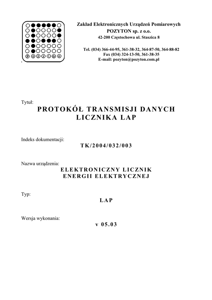 Zakład Elektronicznych Urządzeń Pomiarowych POZYTON sp. z o.o. 42-200 Częstochowa ul. Staszica 8 Tel. (034) 366-44-95, 361-38-32, 364-87-50, 364-88-82 Fax (034) 324-13-50, 361-38-35 E-mail: [email protected] , Tytuł: PRO TO KÓ Ł TRANSM I SJI DANYCH LI CZNI K A LAP Indeks dokumentacji: TK/2004/032/003 Nazwa urządzenia: ELEKTRONICZNY LICZNIK ENERGII ELEKTRYCZNEJ Typ: LAP Wersja wykonania: v 05.03 Protokół transmisji danych licznika LAP Wersja wykonania: v 05.03 Indeks dokumentacji: TK/2004/032/003 Spis treści 1 Ogólne cechy transmisji danych.......................................................................................................3 2 Łącza komunikacyjne licznika.........................................................................................................3 2.1 Optozłącze zgodne ze standardem PN-EN 62056-21 – łącze 1................................................3 2.2 Optozłącze dla modułów dodatkowych – łącze 2.....................................................................3 3 Protokół transmisji............................................................................................................................4 3.1 Obliczanie sumy kontrolnej......................................................................................................4 3.2 Nawiązanie transmisji...............................................................................................................4 3.3 Tryb pracy łącza komunikacyjnego..........................................................................................4 3.3.1 Odczyt zestawu danych.....................................................................................................5 3.3.2 Wejście w tryb rejestrowy.................................................................................................5 3.4 Tryb rejestrowy.........................................................................................................................6 3.4.1 Ogólna postać rozkazu trybu rejestrowego.......................................................................6 3.4.2 Wyjście z trybu rejestrowego............................................................................................6 3.5 Rozkazy trybu rejestrowego.....................................................................................................6 3.5.1 Dane podstawowe.............................................................................................................6 3.5.2 Odczyt wielkości mierzonych...........................................................................................7 4 Opis rejestrów...................................................................................................................................8 Wyłącznie do użytku wewnętrznego Strona 2 z 10 Żadna część tej publikacji nie może być reprodukowana lub kopiowana w jakiejkolwiek postaci elektronicznej jak i mechanicznej włączając fotokopie oraz mikrofilm bez pisemnego zezwolenia firmy ZEUP Pozyton Protokół transmisji danych licznika LAP Wersja wykonania: v 05.03 Indeks dokumentacji: TK/2004/032/003 1 Ogólne cechy transmisji danych Liczniki LAP posiadają dwa łącza komunikacyjne: ● łącze 1 (podstawowe) – optozłącze zgodne ze standardem PN-EN 62056-21; ● łącze 2 (dodatkowe/opcjonalne) – optozłącze dla modułów dodatkowych umieszczonych w pokrywie listwy zaciskowej licznika. Licznik prowadzi nasłuch obydwu łącz komunikacji i potrafi komunikować się po nich jednocześnie. 2 Łącza komunikacyjne licznika 2.1 Optozłącze zgodne ze standardem PN-EN 62056-21 – łącze 1 parametry transmisji: prędkość początkowa 300 bitów/sekundę ilość bitów danych 7 ilość bitów stopu 1 kontrola parzystości Even protokół transmisji: tekstowy spełniający zalecenia normy PN-EN 62056-21 (patrz rozdział: 3). Uwaga: prędkość transmisji na łączu 1 może być zmieniona na wyższą po nawiązaniu komunikacji pomiędzy urządzeniem odczytowym a licznikiem 2.2 Optozłącze dla modułów dodatkowych – łącze 2 parametry transmisji: prędkość początkowa programowalna ilość bitów danych 7 ilość bitów stopu 1 kontrola parzystości Even protokół transmisji: tekstowy spełniający zalecenia normy PN-EN 62056-21 (patrz rozdział: 3). Uwaga: prędkość transmisji na łączu 2 jest stała (ustalana podczas konfiguracji/programowania licznika), nie ma możliwości zmiany jej po nawiązaniu komunikacji pomiędzy urządzeniem odczytowym a licznikiem, zaleca się stosowanie prędkości: 1200, 2400 i 4800 [bitów/sekundę]. Wyłącznie do użytku wewnętrznego Strona 3 z 10 Żadna część tej publikacji nie może być reprodukowana lub kopiowana w jakiejkolwiek postaci elektronicznej jak i mechanicznej włączając fotokopie oraz mikrofilm bez pisemnego zezwolenia firmy ZEUP Pozyton Protokół transmisji danych licznika LAP Wersja wykonania: v 05.03 Indeks dokumentacji: TK/2004/032/003 3 Protokół transmisji 3.1 Obliczanie sumy kontrolnej Suma kontrolna liczona jest według wzoru: BCC = BCC xor znak Jeżeli w bloku danych występuje znak [SOH], to suma kontrolna liczona jest od następującego po nim znaku, w przeciwnym wypadku od pierwszego po znaku [STX]. Ostatnim znakiem wliczanym do sumy jest [ETX]. 3.2 Nawiązanie transmisji Prowadzenie transmisji wymaga nawiązania łączności na prędkości początkowej /łącze 1, na łączu 2 – prędkość jest stała/. Nawiązanie transmisji z licznikiem następuje po wysłaniu do licznika polecenia (1) lub (2) /tylko łącze 1/. (1) /?nnn nnnnnnn![CR][LF] (2) /?![CR][LF] nnn nnnnnnn – numer licznika (licznik odpowiada także na numer 000 0000000); Licznik w odpowiedzi przesyła swój identyfikator (3) oraz proponuje przejście na wyższą prędkość transmisji /tylko łącze 1/: (3) /POZbLAP-VPvv.vv*[CR][LF] POZ – skrótowe oznaczenie producenta (ZEUP „Pozyton”); b – identyfikator prędkości transmisji (z