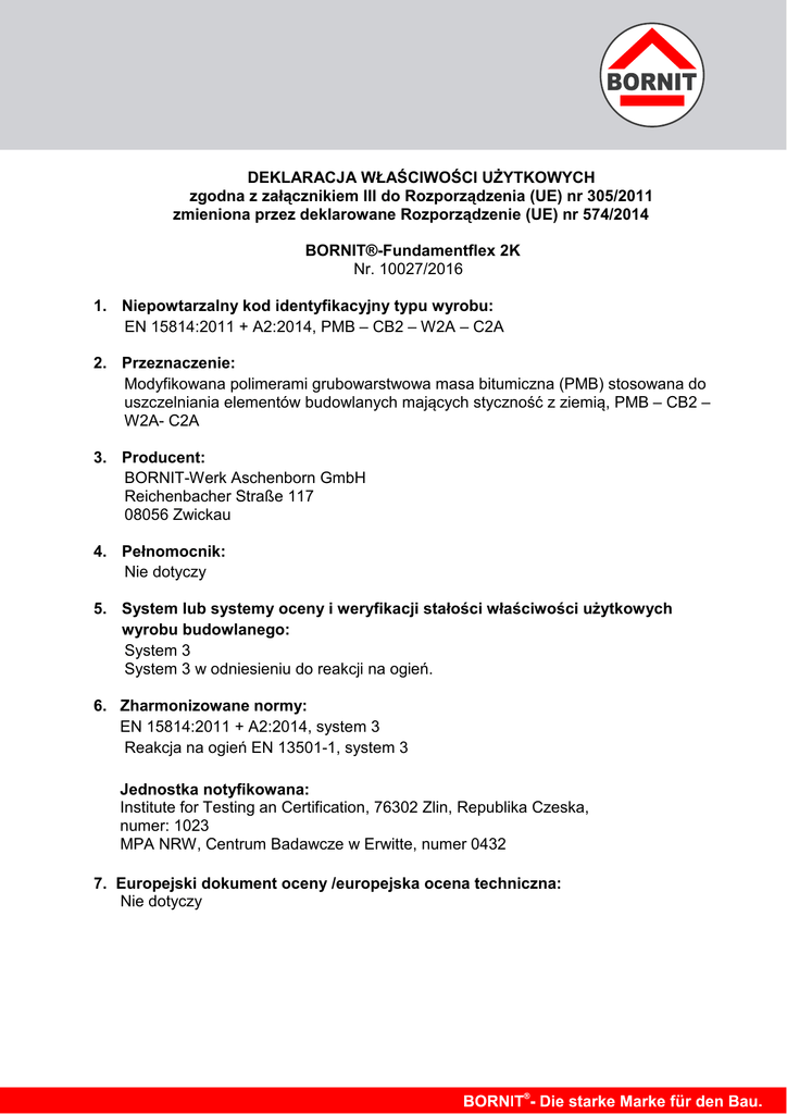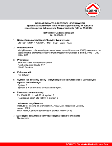 DEKLARACJA WŁAŚCIWOŚCI UŻYTKOWYCH zgodna z załącznikiem III do Rozporządzenia (UE) nr 305/2011 zmieniona przez deklarowane Rozporządzenie (UE) nr 574/2014 BORNIT®-Fundamentflex 2K Nr. 10027/2016 1. Niepowtarzalny kod identyfikacyjny typu wyrobu: EN 15814:2011 + A2:2014, PMB – CB2 – W2A – C2A 2. Przeznaczenie: Modyfikowana polimerami grubowarstwowa masa bitumiczna (PMB) stosowana do uszczelniania elementów budowlanych mających styczność z ziemią, PMB – CB2 – W2A- C2A 3. Producent: BORNIT-Werk Aschenborn GmbH Reichenbacher Straße 117 08056 Zwickau 4. Pełnomocnik: Nie dotyczy 5. System lub systemy oceny i weryfikacji stałości właściwości użytkowych wyrobu budowlanego: System 3 System 3 w odniesieniu do reakcji na ogień. 6. Zharmonizowane normy: EN 15814:2011 + A2:2014, system 3 Reakcja na ogień EN 13501-1, system 3 Jednostka notyfikowana: Institute for Testing an Certification, 76302 Zlin, Republika Czeska, numer: 1023 MPA NRW, Centrum Badawcze w Erwitte, numer 0432 7. Europejski dokument oceny /europejska ocena techniczna: Nie dotyczy 8. Deklarowane właściwości użytkowe Zasadnicze charakterystyki Właściwości użytkowe Wodoszczelność Klasa W2A Zdolność przenoszenia zarysowań Klasa CB2 Odporność na działanie wody Nie barwi wody, nie występuje odwarstwianie od wkładki brak pęknięć Elastyczność w niskich temperaturach Stabilność wymiarowa w wysokich temperaturach Zharmonizowan a specyfikacja techniczna EN 15814:2011 + A2:2014 brak obsuwania się i ściekania Reakcja na ogień klasa E Wytrzymałość na ściskanie klasa C2A Substancje niebezpieczne NPD Zachowanie wodoszczelności i reakcji na ogień spełnia wymagania 9. Właściwości użytkowe wyrobu są zgodne z deklarowanymi właściwościami użytkowymi Niniejsza deklaracja właściwości użytkowych wydana zostaje zgodnie z rozporządzeniem (UE) nr 305/2011 i na wyłączną odpowiedzialność wyżej określonego producenta Za producenta i w imieniu producenta podpisał(-a): Deklaracja właściwości użytkowych została sporządzona elektronicznie i jest ważna również bez podpisu. F. Metzner Prezes Zwickau, dnia 25.07.2016 r. H. Modes Kierownik laboratorium