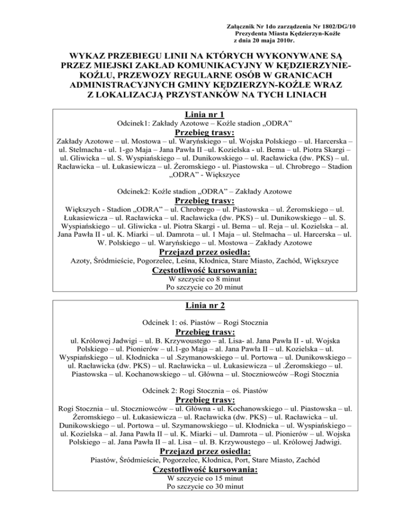 Załącznik Nr 1do zarządzenia Nr 1802/DG/10 Prezydenta Miasta Kędzierzyn-Koźle z dnia 20 maja 2010r. WYKAZ PRZEBIEGU LINII NA KTÓRYCH WYKONYWANE SĄ PRZEZ MIEJSKI ZAKŁAD KOMUNIKACYJNY W KĘDZIERZYNIEKOŹLU, PRZEWOZY REGULARNE OSÓB W GRANICACH ADMINISTRACYJNYCH GMINY KĘDZIERZYN-KOŹLE WRAZ Z LOKALIZACJĄ PRZYSTANKÓW NA TYCH LINIACH Linia nr 1 Odcinek1: Zakłady Azotowe – Koźle stadion „ODRA” Przebieg trasy: Zakłady Azotowe – ul. Mostowa – ul. Waryńskiego – ul. Wojska Polskiego – ul. Harcerska – ul. Stelmacha - ul. 1-go Maja – Jana Pawła II –ul. Kozielska - ul. Bema – ul. Piotra Skargi – ul. Gliwicka – ul. S. Wyspiańskiego – ul. Dunikowskiego – ul. Racławicka (dw. PKS) – ul. Racławicka – ul. Łukasiewicza – ul. Żeromskiego - ul. Piastowska – ul. Chrobrego – Stadion „ODRA” - Większyce Odcinek2: Koźle stadion „ODRA” – Zakłady Azotowe Przebieg trasy: Większych - Stadion „ODRA” – ul. Chrobrego – ul. Piastowska – ul. Żeromskiego – ul. Łukasiewicza – ul. Racławicka – ul. Racławicka (dw. PKS) – ul. Dunikowskiego – ul. S. Wyspiańskiego – ul. Gliwicka - ul. Piotra Skargi - ul. Bema – ul. Reja – ul. Kozielska – al. Jana Pawła II - ul. K. Miarki – ul. Damrota – ul. 1 Maja – ul. Stelmacha – ul. Harcerska – ul. W. Polskiego – ul. Waryńskiego – ul. Mostowa – Zakłady Azotowe Przejazd przez osiedla: Azoty, Śródmieście, Pogorzelec, Leśna, Kłodnica, Stare Miasto, Zachód, Większyce Częstotliwość kursowania: W szczycie co 8 minut Po szczycie co 20 minut Linia nr 2 Odcinek 1: oś. Piastów – Rogi Stocznia Przebieg trasy: ul. Królowej Jadwigi – ul. B. Krzywoustego – al. Lisa- al. Jana Pawła II - ul. Wojska Polskiego – ul. Pionierów – ul.1-go Maja – al. Jana Pawła II – ul. Kozielska – ul. Wyspiańskiego – ul. Kłodnicka – ul .Szymanowskiego – ul. Portowa – ul. Dunikowskiego – ul. Racławicka (dw. PKS) – ul. Racławicka – ul. Łukasiewicza – ul .Żeromskiego – ul. Piastowska – ul. Kochanowskiego – ul. Główna – ul. Stoczniowców –Rogi Stocznia Odcinek 2: Rogi Stocznia – oś. Piastów Przebieg trasy: Rogi Stocznia – ul. Stoczniowców – ul. Główna - ul. Kochanowskiego – ul. Piastowska – ul. Żeromskiego – ul. Łukasiewicza – ul. Racławicka (dw. PKS) – ul. Racławicka – ul. Dunikowskiego – ul. Portowa – ul. Szymanowskiego – ul. Kłodnicka – ul. Wyspiańskiego – ul. Kozielska – al. Jana Pawła II – ul. K. Miarki – ul. Damrota – ul. Pionierów – ul. Wojska Polskiego – al. Jana Pawła II – al. Lisa – ul. B. Krzywoustego – ul. Królowej Jadwigi. Przejazd przez osiedla: Piastów, Śródmieście, Pogorzelec, Kłodnica, Port, Stare Miasto, Zachód Częstotliwość kursowania: W szczycie co 15 minut Po szczycie co 30 minut Linia nr 3 Odcinek 1: Kuźniczka – Elektrownia Blachownia Przebieg trasy: Kuźniczka Cmentarz - ul. Gajowa – ul. Spokojna – ul. Grunwaldzka – ul. Głowackiego – al. Jana Pawła II – ul. K. Miarki – ul. Damrota – ul. Pionierów – ul Wojska Polskiego – al. Jana Pawła II – al. Lisa – ul. B. Krzywoustego – ul. Królowej Jadwigi – al. Jana Pawła II – ul. Przyjaźni – ul. Tuwima – ul. Zwycięstwa – ul. Szkolna – ul. Przyjaźni – ul. Energetyków Elektrownia Blachownia. Odcinek 2: Elektrownia Blachownia - Kuźniczka Przebieg trasy: Elektrownia Blachownia – ul. Energetyków – ul. Przyjaźni – ul. Szkolna – ul. Zwycięstwa – ul. Tuwima – ul. Przyjaźni – al. Jana Pawła II – ul. Królowej Jadwigi – ul. B. Krzywoustego – al. Lisa – al. Jana Pawła II – ul Wojska Polskiego – ul. Pionierów – ul. Damrota – ul. K. Miarki – ul. Grunwaldzka – ul. Spokojna - ul. Gajowa - Kuźniczka Cmentarz. Przejazd przez osiedla: Kuźniczka, Śródmieście, Piastów, Lenartowice, Blachownia Częstotliwość kursowania (średnio): W szczycie co 30 minut Po szczycie co 60 minut Linia nr 4 Odcinek 1: Kędzierzyn dw. PKP- Koźle dw. PKP Przebieg trasy: Kędzierzyn dw. PKP – ul. Kozielska – ul. Wyspiańskiego – ul. Kłodnicka – ul. Krasickiego – ul. Jagiellońska – ul. M. Helwiga – ul. Leśna – ul. Agrestowa – ul. Jagiellońska – ul. Krasickiego – ul. Kłodnicka – ul. Szymanowskiego – ul. Portowa – ul. Dunikowskiego – ul. Racławicka – ul. Racławicka (dw. PKS) – ul. Łukasiewicza – ul. Żeromskiego – ul. Piastowska – ul. Gazowa – ul. Łukasiewicza – ul. Kochanowskiego – Koźle dw. PKP Odcinek 2: Koźle dw. PKP - Kędzierzyn plac Wolności Przebieg trasy: Koźle dw. PKP - ul. Kochanowskiego – ul. Łukasiewicza – ul. Gazowa – ul. Piastowska – ul. Żeromskiego – ul. Łukasiewicza – ul. Racławicka (dw. PKS) - ul. Racławicka – ul. Dunikowskiego – ul. Portowa – ul. Szymanowskiego – ul. Kłodnicka – ul. Krasickiego – ul. Jagiellońska – ul. Agrestowa – ul. Leśna – ul. M. Helwiga Krasickiego – ul. Jagiellońska – ul. Krasickiego – ul. Kłodnicka – ul. Wyspiańskiego – ul. Kozielska – ul. Karola Miarki – Plac Wolności Przejazd przez osiedla: Śródmieście, Pogorzelec, Kłodnica, Żabieniec, Port, Stare Miasto, Zachód Częstotliwość kursowania (średnio): W szczycie co 80 minut Po szczycie co 90 minut Linia nr 5 Odcinek 1: Pogorzelec ul. Orzeszkowej – Sławięcice bar „Danka” Przebieg trasy: ul. Orzeszkowej – ul. Piotra Skargi – ul. J. Bema – ul. M. Reja - ul. Kozielska - ul. K. Miarki 2 – ul. Damrota – ul. Pionierów – ul Wojska Polskiego – al. Jana Pawła II – ul. Przyjaźni – ul. Tuwima – ul. Zwycięstwa – ul. Szkolna – ul. Przyjaźni – ul. Strzelecka – ul. Sławięcicka – Ujazd - bar „Danka” Odcinek 2: Sławięcice bar „Danka” – ul. Piotra Skargi III Przebieg trasy: Ujazd - Bar „Danka” – ul. Sławięcicka – ul. Strzelecka – ul. Przyjaźni – ul. Szkolna – ul. Zwycięstwa – ul. Tuwima – ul