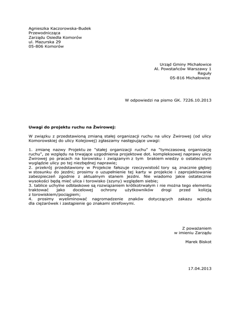 Agnieszka Kaczorowska-Budek Przewodnicząca Zarządu Osiedla Komorów ul. Mazurska 29 05-806 Komorów Urząd Gminy Michałowice Al. Powstańców Warszawy 1 Reguły 05-816 Michałowice W odpowiedzi na pismo GK. 7226.10.2013 Uwagi do projektu ruchu na Żwirowej: W związku z przedstawioną zmianą stałej organizacji ruchu na ulicy Żwirowej (od ulicy Komorowskiej do ulicy Kolejowej) zgłaszamy następujące uwagi: 1. zmianę nazwy Projektu ze "stałej organizacji ruchu" na "tymczasową organizację ruchu", ze względu na trwające uzgodnienia projektowe dot. kompleksowej naprawy ulicy Żwirowej po pracach na torowisku i związanym z tym brakiem wiedzy o ostatecznym wyglądzie ulicy po tej niezbędnej naprawie; 2. przekrój przedstawiony w Projekcie fałszuje rzeczywistość tory są znacznie głębiej w stosunku do jezdni; prosimy o uzupełnienie tej karty w projekcie i zaprojektowanie zabezpieczeń zgodnie z aktualnym stanem jezdni. Nie wiadomo jakie ostatecznie wysokości będą mieć ulica i torowisko (szyny) względem siebie; 3. tablice uchylne odblaskowe są rozwiązaniem krótkotrwałym i nie można tego elementu traktować jako docelowej ochrony użytkowników drogi przed kolizją z torowiskiem/pociągiem; 4. prosimy wyeliminować nagromadzenie znaków dotyczących zakazu wjazdu dla ciężarówek i zastąpienie go znakami strefowymi. Z poważaniem w imieniu Zarządu Marek Biskot 17.04.2013