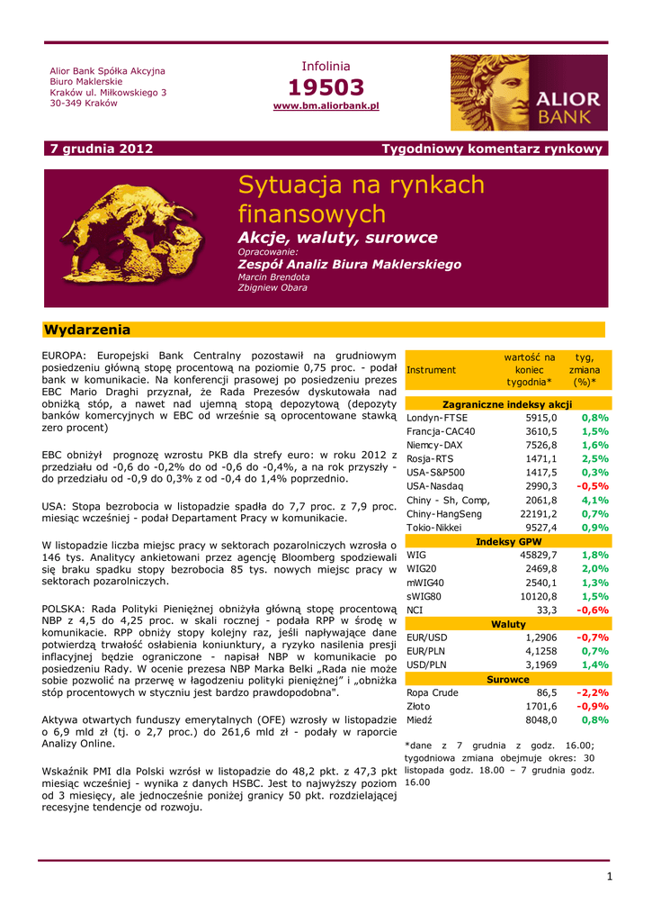 saW Alior Bank Spółka Akcyjna Biuro Maklerskie Kraków ul. Miłkowskiego 3 30-349 Kraków Infolinia 19503 www.bm.aliorbank.pl 7 grudnia 2012 Tygodniowy komentarz rynkowy Sytuacja na rynkach finansowych Akcje, waluty, surowce Opracowanie: Zespół Analiz Biura Maklerskiego Marcin Brendota Zbigniew Obara Wydarzenia EUROPA: Europejski Bank Centralny pozostawił na grudniowym wartość na tyg, posiedzeniu główną stopę procentową na poziomie 0,75 proc. - podał Instrument koniec zmiana bank w komunikacie. Na konferencji prasowej po posiedzeniu prezes tygodnia* (%)* EBC Mario Draghi przyznał, że Rada Prezesów dyskutowała nad obniżką stóp, a nawet nad ujemną stopą depozytową (depozyty Zagraniczne indeksy akcji banków komercyjnych w EBC od wrześnie są oprocentowane stawką Londyn-FTSE 5915,0 0,8% zero procent) Francja-CAC40 3610,5 1,5% Niemcy-DAX 7526,8 1,6% EBC obniżył prognozę wzrostu PKB dla strefy euro: w roku 2012 z Rosja-RTS 1471,1 2,5% przedziału od -0,6 do -0,2% do od -0,6 do -0,4%, a na rok przyszły USA-S&P500 1417,5 0,3% do przedziału od -0,9 do 0,3% z od -0,4 do 1,4% poprzednio. USA-Nasdaq 2990,3 -0,5% Chiny - Sh, Comp, 2061,8 4,1% USA: Stopa bezrobocia w listopadzie spadła do 7,7 proc. z 7,9 proc. Chiny-HangSeng 22191,2 0,7% miesiąc wcześniej - podał Departament Pracy w komunikacie. Tokio-Nikkei 9527,4 0,9% Indeksy GPW W listopadzie liczba miejsc pracy w sektorach pozarolniczych wzrosła o 45829,7 1,8% 146 tys. Analitycy ankietowani przez agencję Bloomberg spodziewali WIG 2469,8 2,0% się braku spadku stopy bezrobocia 85 tys. nowych miejsc pracy w WIG20 sektorach pozarolniczych. mWIG40 2540,1 1,3% sWIG80 10120,8 1,5% POLSKA: Rada Polityki Pieniężnej obniżyła główną stopę procentową NCI 33,3 -0,6% NBP z 4,5 do 4,25 proc. w skali rocznej - podała RPP w środę w Waluty komunikacie. RPP obniży stopy kolejny raz, jeśli napływające dane EUR/USD 1,2906 -0,7% potwierdzą trwałość osłabienia koniunktury, a ryzyko nasilenia presji EUR/PLN 4,1258 0,7% inflacyjnej będzie ograniczone - napisał NBP w komunikacie po USD/PLN 3,1969 1,4% posiedzeniu Rady. W ocenie prezesa NBP Marka Belki „Rada nie może Surowce sobie pozwolić na przerwę w łagodzeniu polityki pieniężnej” i „obniżka Ropa Crude 86,5 -2,2% stóp procentowych w styczniu jest bardzo prawdopodobna". Złoto 1701,6 -0,9% 8048,0 0,8% Aktywa otwartych funduszy emerytalnych (OFE) wzrosły w listopadzie Miedź o 6,9 mld zł (tj. o 2,7 proc.) do 261,6 mld zł - podały w raporcie Analizy Online. *dane z 7 grudnia z godz. 16.00; tygodniowa zmiana obejmuje okres: 30 Wskaźnik PMI dla Polski wzrósł w listopadzie do 48,2 pkt. z 47,3 pkt listopada godz. 18.00 – 7 grudnia godz. miesiąc wcześniej - wynika z danych HSBC. Jest to najwyższy poziom 16.00 od 3 miesięcy, ale jednocześnie poniżej granicy 50 pkt. rozdzielającej recesyjne tendencje od rozwoju. 1 Sytuacja na rynkach finansowych Zagraniczne giełdy akcji Wykres 1. Indeks S&P500 (USA) w układzie dziennym. SP500 (1,409.43, 1,413.95, 1,405.93, 1,413.94, +4.65991) 1500 1450 1400 1350 1300 1250 1200 1150 1100 Rynki akcji na świecie mają za sobą drugi z rzędu udany tydzień. Jedynie w przypadku indeksu spółek technologicznych Nasdaq w USA można mówić o słabszym zachowaniu, ale jest to efekt „spuszczania powietrza” z „balonu spekulacyjnego” na akcjach Apple (najdroższej spółki na świecie mającej blisko 20% udział w tym indeksie). W Europie trwają prace nad wspólnym nadzorem bankowym. Na przyszłotygodniowym posiedzeniu Eurogrupy (tym samym, na którym formalnie zatwierdzona zostanie kolejna transza pomocy finansowej niezbędnej dla utrzymania przez Grecję stanu wypłacalności), temat ten powróci. 1050 J J A S O N D 2012 M A M J J A S O N D Wykres 2. Indeks DAX (Niemcy) w układzie dziennym. DAX (7,469.54, 7,554.51, 7,461.19, 7,534.54, +79.9902) 7500 7000 6500 6000 5500 5000 J J A S O N D 2012 M A M J J A S O N D Wykres 3. Indeks Nikkei (Japonia) w układzie dziennym. NIKKEI (9,535.69, 9,565.43, 9,503.31, 9,545.16, +76.3203) 10000 Ogólnie nastroje inwestycyjne są coraz lepsze (strefa euro nie stanowi już w tej chwili raczej obszaru, który może wygenerować coś negatywnego, czego rynek w przeszłości nie dyskontował), inwestorzy powinni jednak pamiętać, że łagodniejący klimat wokół kwestii ograniczenia deficytu w USA i ewentualne porozumienie na tym polu Demokratów z mającymi większość w Kongresie Republikanami może zostać paradoksalnie negatywnie odebrane przez rynki. W grę wchodzi jeszcze podwyższenie progu zadłużenia, a ostatnia taka operacja miała miejsce po ciężkich politycznych bojach na początku sierpnia zeszłego roku i wiadomo jak się skończyła. W dłuższym terminie warto zwrócić natomiast uwagę na korzystny element krajobrazu rynków akcji, jakim jest coraz słabsze zachowanie szeregu rynków surowcowych. W obliczu spowolnienia gospodarczego i zwiększonej podaży, klasa surowcowa przestała być „safe haven” i stanowić konkurencję dla instrumentów udziałowych. Zarządzający coraz częściej przyznają, że znów liczy się przede wszystkim umiejętna selekcja akcji do portfela. Wykres 4. Indeks CAC40 (Francja) w układzie dziennym. 9500 CAC40 (3,602.88, 3,621.45, 3,585.33, 3,601.65, +11.1499) 4100 4000 3900 3800 3700 3600 3500 3400 3300 3200 3100 3000 2900 2800 2700 2600 9000 8500 8000 M J J A S O N D 2012 M A M J J A S O N D J J A S O N D 2012 M A M J J A S O N D 2 Sytuacja na rynkach finansowych Giełda Papierów Wartościowych w Warszawie Wykres 5. Indeks WIG20 w układzie dziennym. Wykres 8. Indeks WIG w układzie dziennym. WIG20 (2,475.10, 2,486.42, 2,461.77, 2,485.44, +16.5898) WIG (45,880.88, 46,019.97, 45,687.12, 46,019.97, +247.379) 2900 51000 50000 49000 2800 48000 2700 47000 2600 45000 46000 44000 2500 43000 42000 2400 41000 40000 2300 39000 38000 2200 37000 36000 2100 35000 2000 J J A S O N D 2012 M A M J J A S O N D J J A S O N D 2012 