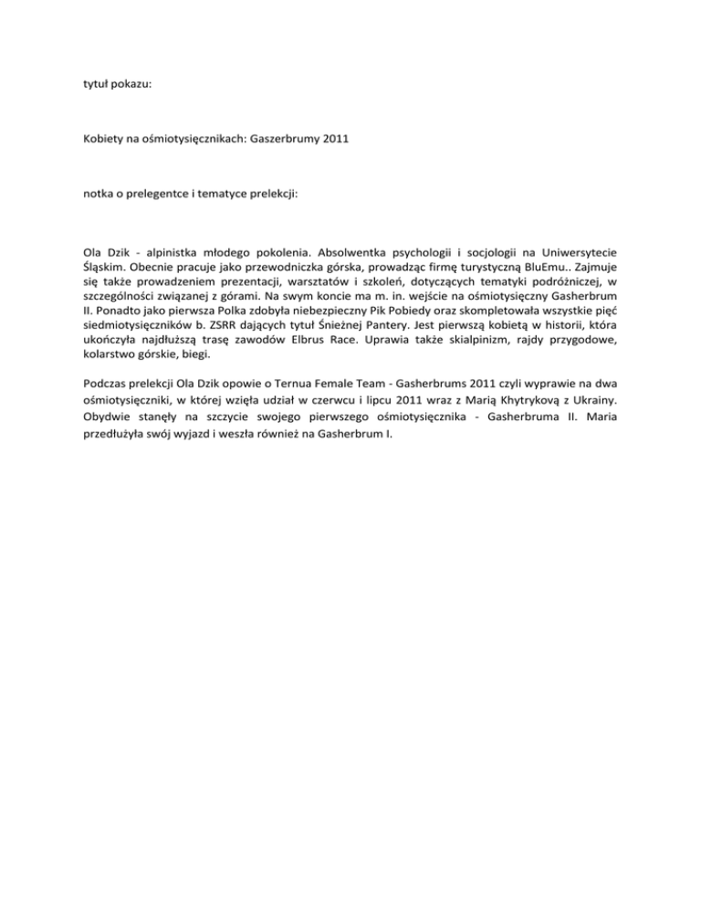 tytuł pokazu: Kobiety na ośmiotysięcznikach: Gaszerbrumy 2011 notka o prelegentce i tematyce prelekcji: Ola Dzik - alpinistka młodego pokolenia. Absolwentka psychologii i socjologii na Uniwersytecie Śląskim. Obecnie pracuje jako przewodniczka górska, prowadząc firmę turystyczną BluEmu.. Zajmuje się także prowadzeniem prezentacji, warsztatów i szkoleń, dotyczących tematyki podróżniczej, w szczególności związanej z górami. Na swym koncie ma m. in. wejście na ośmiotysięczny Gasherbrum II. Ponadto jako pierwsza Polka zdobyła niebezpieczny Pik Pobiedy oraz skompletowała wszystkie pięć siedmiotysięczników b. ZSRR dających tytuł Śnieżnej Pantery. Jest pierwszą kobietą w historii, która ukończyła najdłuższą trasę zawodów Elbrus Race. Uprawia także skialpinizm, rajdy przygodowe, kolarstwo górskie, biegi. Podczas prelekcji Ola Dzik opowie o Ternua Female Team - Gasherbrums 2011 czyli wyprawie na dwa ośmiotysięczniki, w której wzięła udział w czerwcu i lipcu 2011 wraz z Marią Khytrykovą z Ukrainy. Obydwie stanęły na szczycie swojego pierwszego ośmiotysięcznika - Gasherbruma II. Maria przedłużyła swój wyjazd i weszła również na Gasherbrum I.