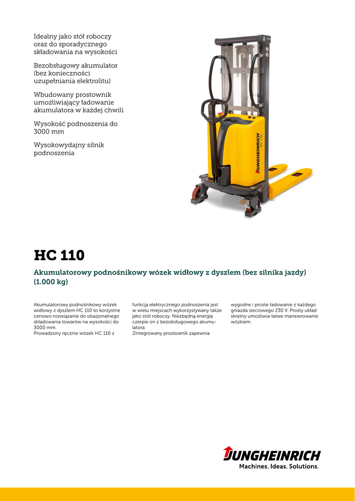 Idealny jako stół roboczy oraz do sporadycznego składowania na wysokości Bezobsługowy akumulator (bez konieczności uzupełniania elektrolitu) Wbudowany prostownik umożliwiający ładowanie akumulatora w każdej chwili Wysokość podnoszenia do 3000 mm Wysokowydajny silnik podnoszenia HC 110 Akumulatorowy podnośnikowy wózek widłowy z dyszlem (bez silnika jazdy) (1.000 kg) Akumulatorowy podnośnikowy wózek widłowy z dyszlem HC 110 to korzystne cenowo rozwiązanie do okazjonalnego składowania towarów na wysokości do 3000 mm. Prowadzony ręcznie wózek HC 110 z funkcją elektrycznego podnoszenia jest w wielu miejscach wykorzystywany także jako stół roboczy. Niezbędną energię czerpie on z bezobsługowego akumu latora. Zintegrowany prostownik zapewnia wygodne i proste ładowanie z każdego gniazda sieciowego 230 V. Prosty układ skrętny umożliwia łatwe manewrowanie wózkiem. HC 110 h4 h3 h1 l h14 c max. h14 min. s 951 l2 Q h13 y l1 e b1 b10 b11 b5 a W a 2 a 2 Ast Stan: 08/2009 1.1 Producent Jungheinrich 1.2 Typ HC 110 1.3 Napęd Ręczny 1.4 Obsługa wózka z pozycji operatora Idącego 1.5 Udźwig/ładunek Qt 1.6 Odległość środka ciężkości ładunku od czoła wideł cmm 1.9 Rozstaw osi kół mm 2.1.1 Masa własna wraz z akumulatorem (patrz poz. 6.5) kg 348 435 450 2.2 Nacisk na oś z ładunkiem przód/tył kg 400 / 948 443 / 992 454 / 996 2.3 Nacisk na oś bez ładunku przód/tył kg 242 / 106 306 / 129 323 / 127 3.1 Ogumienie 3.2 Wymiary kół przód mm Ø 180 x 50 3.3 Wymiary kół tył mm Ø 74 x 93 3.5 Liczba kół przód/tył (x = napęd) 2/2 3.6 Rozstaw kół przód b10mm 680 1 600 1210 N/V 3.7 Rozstaw kół tył b11mm 4.2 Wysokość wózka z masztem złożonym h1mm 1980 1830 400 2080 4.4 Wysokość podnoszenia h3mm 1600 2500 3000 4.5 Wysokość wózka z masztem wysuniętym h4mm 1980 3070 3570 4.9 Min./maks. wysokość dyszla w pozycji podczas jazdy h14mm 790 / 1156 Wysokość opuszczonych wideł h13mm 85 Długość całkowita l1mm 1720 620 4.20 Długość korpusu wózka l2mm 4.21 Szerokość całkowita b1/b2mm 777 4.22 Wymiary wideł s/e/lmm 60 / 180 / 1100 4.25 Zewn. rozstaw wideł b5mm 570 4.33 Szerokość korytarza roboczego dla palety 1000 x 1200 poprzecznie Astmm 2145 4.34 Szerokość korytarza roboczego dla palety 800 x 1200 wzdłuż Astmm 2175 4.35 Promień skrętu Wamm 1335 Osiągi 4.15 4.19 5.2 Prędkość podnoszenia z ładunkiem/bez ładunku m/s 0.08 / 0.11 5.3 Prędkość opuszczania z ładunkiem/bez ładunku m/s 0.19 / 0.13 5.11 Hamulec postojowy Silniki Wymiary Koła, układ jezdny Ciężary Dane ogólne Dane techniczne wg VDI 2198 6.2 Moc silnika podnoszenia (10%) kW 6.4 Pojemność akumulatora (znamionowa) K5 V/Ah 6.5 Masa akumulatora kg nożny 1.5 12 / 150 45 Niniejsza karta katalogowa zgodnie z wytycznymi VDI 2198 zawiera jedynie parametry wózka standardowego. W przypadku zastosowania innego ogumienia, innych masztów, osprzętu itp. parametry te mogą ulec zmianie. Korzystaj z zalet Przejrzyste rozmieszczenie wszyst kich elementów obsługi Ekonomiczność i wydajność Przystosowany do okazjonalnego składowania ładunków na wysokości do 3000 mm ręczny wózek HC 110 stanowi atrakcyjną kosztowo alternatywę dla urządzeń z silnikiem jazdy. Dzięki trzem wariantom masztu (1600, 2500 i 3000 mm) oraz wydajnemu silnikowi podnoszenia o mocy 1,5 kW zaspokaja zapotrzebowanie na szereg różnych zastosowań. Wariant z masztem 1600 mm może na przykład pełnić funkcję stołu roboczego a także nadaje się do załadunku i rozładunku pojazdów użyt kowych oraz składowania dwóch palet jedna nad drugą. Jungheinrich Polska Sp. z o.o. ul. Świerkowa 3, Bronisze k. Warszawy 05-850 Ożarów Mazowiecki telefon +48 22 332 88 00 fax +48 22 332 88 01 infolinia 0801 300 801 [email protected] www.jungheinrich.pl Ładowanie z każdego gniazda sie ciowego 230 V Przejrzysta, precyzyjna obsługa Elektrohydrauliczne sterowanie podno szeniem oraz łatwo dostępne przyci ski funkcji podnoszenia i opuszczania gwarantują precyzyjne pozycjonowanie wideł. Wszystkie elementy obsługi i wskaźniki są rozmieszczone w przejrzy sty sposób. Komfortowe ładowanie akumulatora W przypadku akumulatorów bezobsłu gowych odpada konieczność uciążliwe go uzupełniania elektrolitu. Wskaźnik sta nu akumulatora przez cały czas wskazuje aktualny poziom naładowania. Wbudo wany prostownik umożliwia ładowanie z każdego gniazda 230 V. Koło z hamulcem postojowym Bezpieczna i ergonomiczna obsługa • Łatwa obsługa dzięki ergonomicznym uchwytom prowadzącym. • Długi dyszel ułatwiający manewrowa nie wózkiem. • Dodatkowa ochrona stóp operatora na rolkach skrętnych. • Bezpieczne parkowanie w każdej sytu acji dzięki mechanicznemu hamulcowi postojowemu. Łatwe manewrowanie Wymuszone prowadzenie koła skręt nego poprzez łańcuch łączący ułatwia manewrowanie wózkiem. Dla zakładów produkcyjnych w Norderstedt i Moosburg. Wózki jezdniowe firmy Jungheinrich spełniają europejskie wymogi bezpieczeństwa. T_HC 110_012014_pl_PL_000 Dobry dostęp do wszystkich kom ponentów