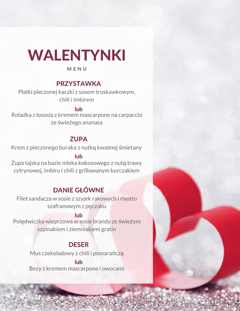 WALENTYNKI MENU PRZYSTAWKA Płatki pieczonej kaczki z sosem truskawkowym, chili i imbirem lub Roladka z łososia z kremem mascarpone na carpaccio ze świeżego ananasa ZUPA Krem z pieczonego buraka z nutką kwaśnej śmietany lub Zupa tajska na bazie mleka kokosowego z nutą trawy cytrynowej, imbiru i chili z grillowanym kurczakiem DANIE GŁÓWNE Filet sandacza w sosie z szyjek rakowych i risotto szafranowym z pęczaku lub Polędwiczka wieprzowa w sosie brandy ze świeżym szpinakiem i ziemniakami gratin DESER Mus czekoladowy z chili i pomarańczą lub Bezy z kremem mascarpone i owocami