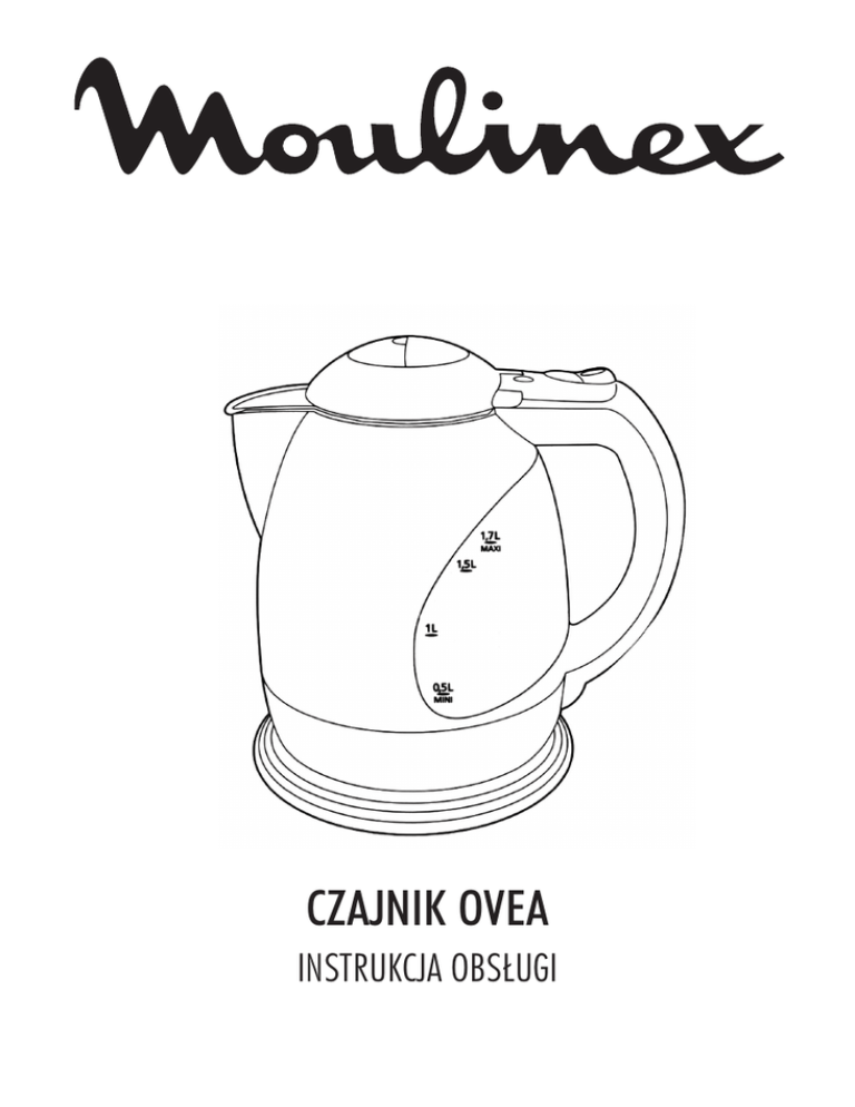 CZAJNIK OVEA INSTRUKCJA OBS¸UGI 2 3 Dz´kujemy za zakup urzàdzenia firmy Moulinex. Zakupione przez Paƒstwa urzàdzenie jest przeznaczone wy∏àcznie do gotowania wody. Opis A B C D E F G H I J Wy∏àcznik/wy∏àcznik (I/O) Lampka kontrolna Pokrywa z blokadà Przycisk otwierajàcy pokryw´ Dziobek Filtr kamienia (zale˝nie od modelu) Korpus Wskaênik poziomu wody Podstawa z miejscem na przewód sieciowy Uchwyt Wskazówki bezpieczeƒstwa • Przed rozpocz´ciem u˝ywania urzàdzenia, prosimy dok∏adnie przeczytaç niniejszà instrukcj´. Korzystanie z urzàdzenia niezgodne z instrukcjà zwalnia firm´ Moulinex z odpowiedzialnoÊci. • Urzàdzenia nie wolno pozostawiaç w zasi´gu dzieci bez nadzoru. Korzystanie z urzàdzenia przez dzieci lub osoby niepe∏nosprawne wymaga nadzoru. • Przewód zasilajàcy nie mo˝e swobodnie zwisaç w zasi´gu dzieci. • Sprawdziç, czy napi´cie podane na tabliczce znamionowej urzàdzenia jest zgodne z napi´ciem sieci. • Urzàdzenie nale˝y pod∏àczaç tylko do uziemionych gniazdek elektrycznych. • W przypadku stosowania przed∏u˝acza, sprawdziç, czy jest to przed∏u˝acz dwubiegunowy typu 10/16 A z przewodem uziemiajàcym. Nieprawid∏owe po∏àczenie spowoduje uniewa˝nienie gwarancji. • Urzàdzenie jest przeznaczone wy∏àcznie do u˝ytku domowego, w pomieszczeniach. • Przed zdj´ciem czajnika z podstawy, nale˝y sprawdziç, czy zosta∏ on wy∏àczony automatycznie lub r´cznie. • W celu nape∏nienia czajnika wodà lub oczyszczenia go, a tak˝e po ka˝dym u˝ytku, nale˝y go zdej4 mowaç z podstawy. • Nie korzystaç z urzàdzenia, je˝eli nie funkcjonuje ono prawid∏owo lub jest uszkodzone. Je˝eli to ma miejsce, nale˝y si´ skontaktowaç z autoryzowanym serwisem firmy Moulinex (patrz broszura). Czajnika nie wolno demontowaç. • Z urzàdzenia nie wolno korzystaç w przypadku uszkodzenia przewodu zasilajàcego lub wtyczki. W celu unikni´cia zagro˝enia, cz´Êci te nale˝y wymieniç w autoryzowanym serwisie firmy Moulinex (patrz broszura). • Wszelkie czynnoÊci, poza zwyk∏ym czyszczeniem i konserwacjà, musi wykonaç autoryzowany serwis firmy Moulinex. • Urzàdzenia, przewodu zasilajàcego i wtyczki nie wolno zanurzaç w wodzie ani w innych p∏ynach. • Czajnika i przewodu zasilajàcego nie wolno zbli˝aç do êróde∏ ciep∏a, mokrych lub Êliskich powierzchni ani ostrych kraw´dzi. • Czajnika nie wolno przemieszczaç, gdy jest w∏àczony do zasilania. • Czajnika nie wolno u˝ywaç, majàc mokre d∏onie lub bose stopy. • Czajnika wolno u˝ywaç wy∏àcznie do gotowania wody pitnej. • Do czajnika nie wolno wk∏adaç ˝adnych przedmiotów. • Uwaga: podczas pracy urzàdzenie silnie si´ nagrzewa. • Podczas przemieszczania czajnika zawierajàcego goràcà wod´, nale˝y zachowaç ostro˝noÊç. • Podczas gotowania wody nie wolno zbli˝aç d∏oni do dzióbka ani do goràcych cz´Êci urzàdzenia. • Przed u˝yciem czajnika nale˝y zamknàç jego pokryw´. • Podstawy wolno u˝ywaç tylko w po∏àczeniu z tym modelem czajnika. • Urzàdzenia nie wolno poddawaç dzia∏aniu czynników atmosferycznych (deszcz, s∏oƒce itp.) • Uwaga: w przypadku przepe∏nienia czajnika mo˝e dojÊç do samoczynnego rozlania wrzàtku. • Podczas przechylania czajnika i wylewania wrzàtku nale˝y zachowaç ostro˝noÊç, aby uniknàç poparzenia. Pierwsze u˝ycie urzàdzenia • Przed pierwszym u˝yciem wn´trze czajnika nale˝y op∏ukaç i zagotowaç 1 lub 2 porcje wody. • Podstaw´ czajnika umieÊciç na stabilnym pod∏o˝u i w∏àczyç do zasilania. • Zdjàç czajnik z podstawy i nalaç wod´ przez dziobek (E) lub otwartà pokryw´. Pokryw´ otworzyç wciskajàc przycisk otwierajàcy pokryw´ (D) i podnoszàc górnà cz´Êç. • IloÊç wody musi si´ mieÊciç mi´dzy poziomem maksymalnym (1,7 l) i minimalnym (0,3 l), które sà zaznaczone na wskaêniku (H). • Sprawdziç, czy pokrywa jest dok∏adnie zamkni´ta, w celu unikni´cia rozlania wody, wyp∏ywu pary lub 5 nieprawid∏owego dzia∏ania czajnika. Automatyczne zamkni´cie pokrywy jest sygnalizowane klikni´ciem i podniesieniem si´ przycisku otwierajàcego pokryw´ (D). • W∏àczyç urzàdzenie, prze∏àczajàc wy∏àcznik (A) do pozycji I. Lampka kontrolna (B) w∏àczy si´. Uwaga: • Gdy woda osiàgnie punkt wrzenia, urzàdzenie wy∏àczy si´ automatycznie, wy∏àcznik (A) wróci do pozycji 0, a lampka kontrolna (B) wy∏àczy si´. • Czajnik mo˝na równie˝ wy∏àczyç w dowolnym momencie, prze∏àczajàc wy∏àcznik (A) do pozycji 0. • Urzàdzenie jest wyposa˝one w zabezpieczenie sterujàce cyklem gotowania, je˝eli czajnik jest w∏àczony majàc zbyt ma∏o lub w ogóle nie majàc wody. Do czajnika wlaç zimnà wod´ lub poczekaç na wznowienie cyklu gotowania. Filtr kamienia (zale˝nie od modelu) Wewnàtrz czajnika mo˝e osadzaç si´ kamieƒ, zale˝nie do twardoÊci stosowanej wody, co objawia si´ obecnoÊcià czàstek kamienia w wodzie wylewanej z czajnika. Aby temu zapobiec, wyposa˝yliÊmy czajnik w specjalny filtr, zatrzymujàcy czàstki kamienia podczas wylewania wody. • Nale˝y unikaç zbyt szybkiego wylewania wody, aby umo˝liwiç jej powolny przep∏yw przez filtr. • Aby wyjàç filtr kamienia, nale˝y zdjàç czajnik z podstawy i pozostawiç go do ostygni´cia. Nie wolno wyjmowaç filtra z czajnika nape∏nionego wodà. • Otworzyç pokryw´, wciskajàc przycisk (D). • Obróciç filtr i pociàgnàç go do góry, aby wyjàç go z dziobka. • Aby ponownie zainstalowaç filtr, w∏o˝yç go do dziobka i umocowaç, wciskajàc go do do∏u. Uwaga: • Filtr pasuje tylko do tego modelu czajnika. • Brak filtra nie uniemo˝liwia pracy czajnika. Czyszczenie • Od∏àczyç czajnik od zasilania, zdjàç go z podstawy i pozostawiç do ostygni´cia. • Zewn´trznà powierzchni´ oczyÊciç wilgotnà Êciereczkà i niewielkà iloÊcià p∏ynu do mycia naczyƒ. Op∏ukaç i dok∏adnie osuszyç. 
