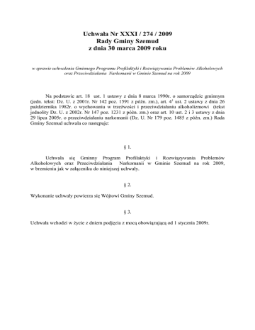 Uchwała Nr XXXI / 274 / 2009 Rady Gminy Szemud z dnia 30 marca 2009 roku w sprawie uchwalenia Gminnego Programu Profilaktyki i Rozwiązywania Problemów Alkoholowych oraz Przeciwdziałania Narkomanii w Gminie Szemud na rok 2009 Na podstawie art. 18 ust. 1 ustawy z dnia 8 marca 1990r. o samorządzie gminnym (jedn. tekst: Dz. U. z 2001r. Nr 142 poz. 1591 z późn. zm.), art. 41 ust. 2 ustawy z dnia 26 października 1982r. o wychowaniu w trzeźwości i przeciwdziałaniu alkoholizmowi (tekst jednolity Dz. U. z 2002r. Nr 147 poz. 1231 z późn. zm.) oraz art. 10 ust. 2 i 3 ustawy z dnia 29 lipca 2005r. o przeciwdziałaniu narkomanii (Dz. U. Nr 179 poz. 1485 z późn. zm.) Rada Gminy Szemud uchwala co następuje: § 1. Uchwala się Gminny Program Profilaktyki i Rozwiązywania Problemów Alkoholowych oraz Przeciwdziałania Narkomanii w Gminie Szemud na rok 2009, w brzmieniu jak w załączniku do niniejszej uchwały. § 2. Wykonanie uchwały powierza się Wójtowi Gminy Szemud. § 3. Uchwała wchodzi w życie z dniem podjęcia z mocą obowiązującą od 1 stycznia 2009r. Załącznik do Uchwały Nr XXXI / 274 / 2009 Rady Gminy Szemud z dnia 30 marca 2009r. GMINNY PROGRAM Profilaktyki i Rozwiązywania Problemów Alkoholowych oraz Przeciwdziałania Narkomanii w Gminie Szemud na rok 2009 I. Podstawa prawna Ustawa z dnia 26 października 1982r. o wychowaniu w trzeźwości i przeciwdziałaniu alkoholizmowi (tekst jednolity Dz. U. z 2002r. Nr 147 poz. 1231 z późn. zm.). Ustawa z dnia 29 lipca 2005r. o przeciwdziałaniu narkomanii (Dz. U. Nr 179 poz. 1485 z późn. zm.). II. Cele Programu 1. Profilaktyczne oddziaływanie wobec dzieci i młodzieży szkolnej: a) przeciwdziałanie powstawaniu negatywnych następstw używania i nadużywania alkoholu i narkotyków; b) obniżanie kulturowej i społecznej akceptacji picia alkoholu i używania narkotyków; c) podwyższenie granicy wieku pierwszego kontaktu z alkoholem i narkotykami; d) działania na rzecz promowania zdrowego trybu życia. 2. Działania na rzecz rozwiązywania lokalnych problemów alkoholowych i narkomanii: a) ograniczanie dostępności do alkoholu i narkotyków; b) interwencje wobec przejawów nadużywania alkoholu i przemocy domowej; c) wspomaganie działalności instytucji i stowarzyszeń służącej rozwiązywaniu problemów alkoholowych i narkomanii; d) udzielanie wsparcia członkom rodzin z problemem alkoholowym i narkotykowym; 3. Podnoszenie kwalifikacji członków Gminnej Komisji ds. PiRPA oraz osób prowadzących świetlice socjoterapeutyczne. III. Zadania Programu i metody ich realizacji 1. Profilaktyczne oddziaływanie wobec dzieci i młodzieży szkolnej: a) profilaktyczne i psychoedukacyjne oddziaływanie na postawy i umiejętności ważne dla zdrowia i decyzji związanych z piciem alkoholu i używaniem narkotyków, realizowane w formie spektakli autorskich oraz teatralnych programów kierowanych do uczniów szkół podstawowych i gimnazjów; b) socjoteraputyczne oddziaływanie wobec dzieci pochodzących z rodzin dysfunkcyjnych, przejawiających szczególne problemy wychowawcze, realizowane w ramach działalności świetlic środowiskowo – terapeutycznych, utworzonych przy szkołach podstawowych w Szemudzie, Kielnie, Jeleńskiej Hucie, Donimierzu i Częstkowie (od lutego) oraz w świetlicy przy Gimnazjum w Szemudzie; c) prowadzenie działalności informacyjnej nt. szkodliwości alkoholizmu i narkomanii w życiu osobistym, rodzinnym, społecznym i zawodowym poprzez udostępnianie biblioteki popularno – naukowej, mieszczącej się przy Punkcie Konsultacyjnym w Szemudzie oraz zakup pomocy dydaktycznych, nowych broszur, plakatów i ulotek; d) wspieranie akcji promujących zdrowy i aktywny tryb życia, dofinansowanie wyjazdów na basen dla dzieci z rodzin z problemem alkoholowym. 2. Działania na rzecz rozwiązywania lokalnych problemów alkoholowych i narkotykowych: a) ograniczanie dostępności do alkoholu poprzez: - realizację ustawy o wychowaniu w trzeźwości i przeciwdziałaniu alkoholizmowi, - przestrzeganie zasad wydawania i cofania zezwoleń na prowadzenie sprzedaży napojów alkoholowych przeznaczonych do spożycia na miejscu lub poza miejscem sprzedaży określonych w ustawie, a także określonych uchwałami Rady Gminy Szemud dot. ustalenia limitu punktów sprzedaży napojów alkoholowych pow. 4,5% (z wyjątkiem piwa) oraz dotyczących usytuowania punktów sprzedaży; b) kontrola przestrzegania zasad obrotu napojami alkoholowymi dokonywana przez organ wydający zezwolenia na sprzedaż napojów alkoholowych oraz przez Gminną Komisję ds. PiRPA, obejmująca: - sprawdzenie punktu przed wydaniem zezwolenia w zakresie spełniania przez obiekt warunków ustawowych oraz określonych uchwałami Rady Gminy, - sprawdzenie punktu w zakresie zgodności prowadzonej działalności z ustawą i warunkami określonymi w zezwoleniu na sprzedaż napojów alkoholowych; c) interwencje wobec przejawów nadużywania alkoholu i/lub używania narkotyków: - rozpatrywanie zgłoszeń, dotyczących podjęcia stosownych działań wobec osób nadużywających alkoholu i/lub używających narkotyków, które zakłócają spokój i bezpieczeństwo rodziny, bądź porządek publiczny, - podejmowanie postępowania sprawdzającego, pozwalającego ustalić stopień uzależnienia od alkoholu i/lub od narkotyków – przeprowadzanie w tym celu rozmów i wywiadów środowiskowych, - motywowanie do dobrowolnego podjęcia leczenia, - kierowanie do sądu wniosków o zastosowanie przymusowego leczenia odwykowego wobec osób, których nie udało się zmotywować do podjęcia leczenia dobrowolnie, - prowadzenie Punktu Konsultacyjnego, którego zadaniem jest udzielanie pomocy i informacji osobom uzależnionym od alkoholu i/lub od narkotyków i członkom ich rodzin na temat zagrożeń, wynikających z nadużywania alkoholu i używania narkotyków, sposobów ich unikania oraz możliwości leczenia choroby alkoholowej czy uzależnienia od narkotyków; uczenie wczesn