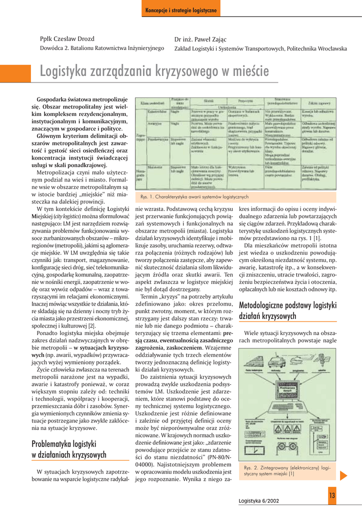 Koncepcje i strategie logistyczne Pp∏k Czes∏aw Drozd Dr in˝. Pawe∏ Zajàc Dowódca 2. Batalionu Ratownictwa In˝ynieryjnego Zak∏ad Logistyki i Systemów Transportowych, Politechnika Wroc∏awska Logistyka zarzàdzania kryzysowego w mieÊcie Gospodarka Êwiatowa metropolizuje si´. Obszar metropolitalny jest wielkim kompleksem rezydencjonalnym, instytucjonalnym i komunikacyjnym, znaczàcym w gospodarce i polityce. G∏ównym kryterium delimitacji obszarów metropolitalnych jest zawartoÊç i g´stoÊç sieci osiedleƒczej oraz koncentracja instytucji Êwiadczàcej us∏ugi w skali ponadkrajowej. Metropolizacja czyni ma∏o u˝ytecznym podzia∏ na wieÊ i miasto. Formalne wsie w obszarze metropolitalnym sà w istocie bardziej „miejskie” ni˝ miasteczka na dalekiej prowincji. W tym kontekÊcie definicj´ Logistyki Miejskiej (city logistics) mo˝na sformu∏owaç nast´pujàco: LM jest narz´dziem rozwiàzywania problemów funkcjonowania wysoce zurbanizowanych obszarów – mikroregionów (metropolii), jakimi sà aglomeracje miejskie. W LM uwzgl´dnia si´ takie czynniki jak: transport, magazynowanie, konfiguracj´ sieci dróg, sieç telekomunikacyjnà, gospodark´ komunalnà, zaopatrzenie w noÊniki energii, zaopatrzenie w wod´ oraz wywóz odpadów – wraz z towarzyszàcymi im relacjami ekonomicznymi. Inaczej mówiàc wszystkie te dzia∏ania, które sk∏adajà si´ na dzienny i nocny tryb ˝ycia miasta jako przestrzeni ekonomicznej, spo∏ecznej i kulturowej [2]. Ponadto logistyka miejska obejmuje zakres dzia∏aƒ nadzwyczajnych w obr´bie metropolii – w sytuacjach kryzysowych (np. awarii, wypadków) przywracajàcych wy˝ej wymieniony porzàdek. ˚ycie cz∏owieka zw∏aszcza na terenach metropolii nara˝one jest na wypadki, awarie i katastrofy poniewa˝, w coraz wi´kszym stopniu zale˝y od: techniki i technologii, wspó∏pracy i kooperacji, przemieszczania dóbr i zasobów. Synergia wymienionych czynników zmienia sytuacje postrzegane jako zwyk∏e zak∏ócenia na sytuacje kryzysowe. Rys. 1. Charakterystyka awarii systemów logistycznych nie wzrasta. Podstawowà cechà kryzysu jest przerwanie funkcjonujàcych powiàzaƒ systemowych i funkcjonalnych na obszarze metropolii (miasta). Logistyka dzia∏aƒ kryzysowych identyfikuje i mobilizuje zasoby, uruchamia rezerwy, odtwarza po∏àczenia (ró˝nych rodzajów) lub tworzy po∏àczenia zast´pcze, aby zapewniç skutecznoÊç dzia∏ania si∏om likwidujàcym êród∏a oraz skutki awarii. Ten aspekt zw∏aszcza w logistyce miejskiej nie by∏ dotàd dostrzegany. Termin „kryzys” na potrzeby artyku∏u zdefiniowano jako: okres prze∏omu, punkt zwrotny, moment, w którym rozstrzygany jest dalszy stan rzeczy: trwanie lub nie danego podmiotu – charakteryzujàcy si´ trzema elementami: presjà czasu, ewentualnoÊcià zasadniczego zagro˝enia, zaskoczeniem. Wzajemne oddzia∏ywanie tych trzech elementów tworzy jednoznacznà definicj´ logistyki dzia∏aƒ kryzysowych. Do zaistnienia sytuacji kryzysowych prowadzà zwykle uszkodzenia podsystemów LM. Uszkodzenie jest zdarzeniem, które stanowi podstaw´ do oceny technicznej systemu logistycznego. Uszkodzenie jest ró˝nie definiowane i zale˝nie od przyj´tej definicji oceny mo˝e byç nieporównywalne oraz zró˝nicowane. W krajowych normach uszkodzenie definiowane jest jako: „zdarzenie Problematyka logistyki powodujàce przejÊcie ze stanu zdatnow dzia∏aniach kryzysowych Êci do stanu niezdatnoÊci” (PN-80/N04000). Najistotniejszym problemem W sytuacjach kryzysowych zapotrze- w opracowaniu modelu uszkodzenia jest bowanie na wsparcie logistyczne radykal- jego rozpoznanie. Wynika z niego za- kres informacji do opisu i oceny indywidualnego zdarzenia lub powtarzajàcych si´ ciàgów zdarzeƒ. Przyk∏adowà charakterystyk´ uszkodzeƒ logistycznych systemów przedstawiono na rys. 1 [1]. Dla mieszkaƒców metropolii istotna jest wiedza o uszkodzeniu powodujàcym okreÊlonà niezdatnoÊç systemu, np. awari´, katastrof´ itp., a w konsekwencji zniszczeniu, utracie trwa∏oÊci, zagro˝eniu bezpieczeƒstwa ˝ycia i otoczenia, op∏acalnych lub nie kosztach odnowy itp. Metodologiczne podstawy logistyki dzia∏aƒ kryzysowych Wiele sytuacji kryzysowych na obszarach metropolitalnych powstaje nagle Rys. 2. Zintegrowany (elektroniczny) logistyczny system miejski [1] Logistyka 6/2002 13 Koncepcje i strategie logistyczne ding, pracownik ochrony nerwowo wertuje taki podr´cznik, nie ma w nim jednak sytuacji kryzysowej pt. „King Kong zaglàdajàcy do okna”. Obecnie coraz cz´Êciej w takich sytuacjach stosuje si´ systemy ekspertowe. Metodologia post´powania konieczna jest równie˝ dla mediów, które o groêbie powstania sytuacji kryzysowych (np. powodzi), muszà w odpowiedni sposób informowaç. Rys. 3. Schemat dzia∏ania telefonu alarmowego 112 (www.112.info.pl/) Media powinny ostrzei sà trudno przewidywalne. Dla potrzeb gaç o mo˝liwoÊci ich zajÊcia, korzystajàc ze logistyki dzia∏aƒ kryzysowych „planuje wszystkich dost´pnych êróde∏ informacji si´ kryzysy”. Polega to na sporzàdzaniu (np. informacji meteorologicznej, o opaskoƒczonego wykazu sytuacji kryzyso- dach, narastaniu fali powodziowej i in.), zawych, które mogà si´ wydarzyç wraz ze chowujàc szczególnà dba∏oÊç o Êcis∏oÊç spisem skomplikowanych instrukta˝y, informacji i realistycznà ocen´ sytuacji. z dok∏adnym opisem krok po kroku czyn- W razie wypadków samochodowych i kanoÊci, które nale˝y przedsi´wziàç w ra- tastrof, doniesienia o nich powinny szybko, ÊciÊle oraz jak najpe∏niej informowaç zie wystàpienia sytuacji „X”. W filmie o King Kongu, kiedy wielka o wydarzeniach, podajàc jak najwi´cej ma∏pa wspina si´ na Empire State Buil- szczegó∏ów (np. numer lotu, kilometr dro- gi, czas zajÊcia wypadku, przewidywany czas usuwania szkód itp.) mogàcych precyzyjnie okreÊliç kto uleg∏ wypadkowi. Do przekazywania informacji dotyczàcych zarzàdzania