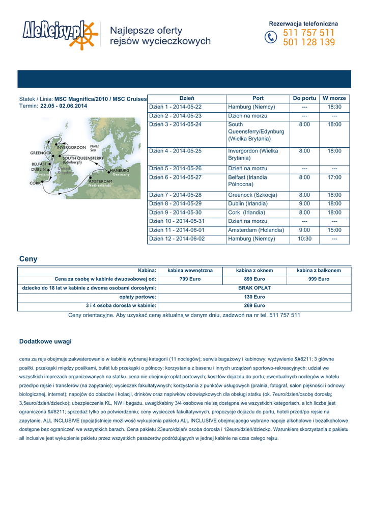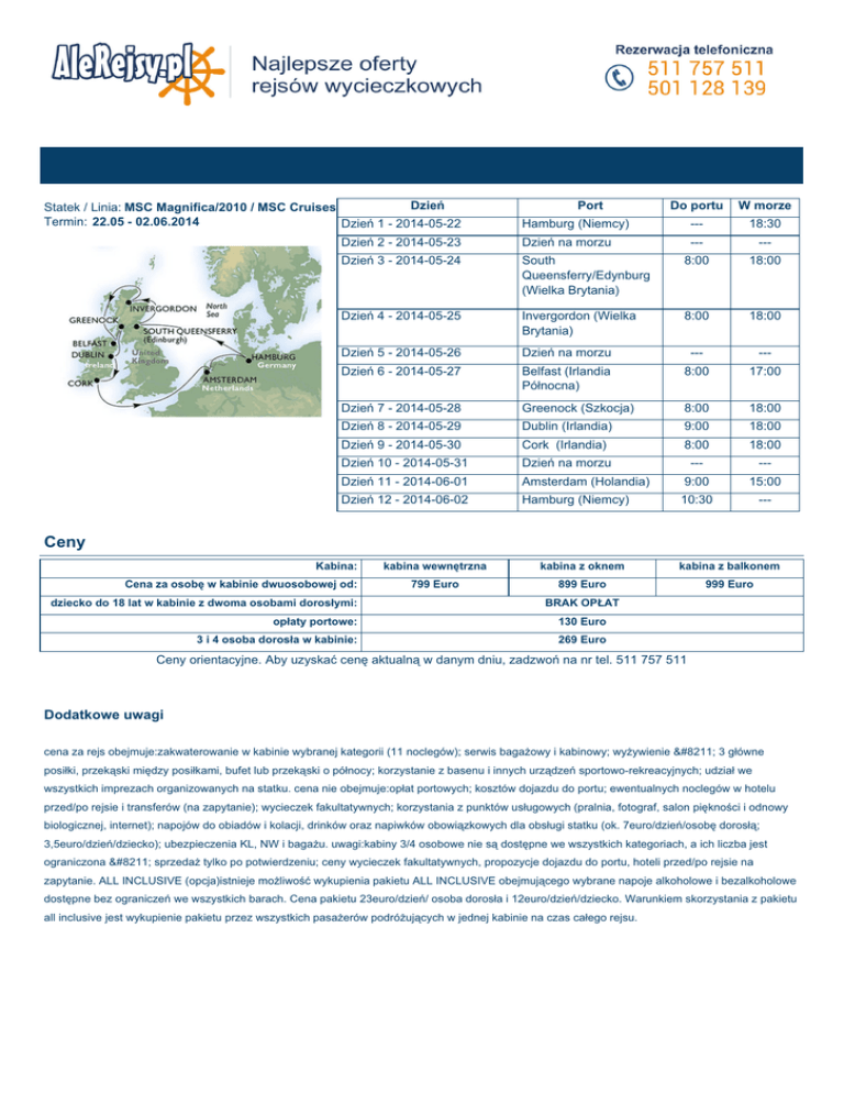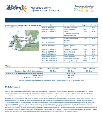 Dzień Statek / Linia: MSC Magnifica/2010 / MSC Cruises Termin: 22.05 - 02.06.2014 Dzień 1 - 2014-05-22 Port Do portu W morze --- 18:30 Hamburg (Niemcy) Dzień 2 - 2014-05-23 Dzień na morzu --- --- Dzień 3 - 2014-05-24 South Queensferry/Edynburg (Wielka Brytania) 8:00 18:00 Dzień 4 - 2014-05-25 Invergordon (Wielka Brytania) 8:00 18:00 Dzień 5 - 2014-05-26 Dzień na morzu --- --- Dzień 6 - 2014-05-27 Belfast (Irlandia Północna) 8:00 17:00 Dzień 7 - 2014-05-28 Greenock (Szkocja) 8:00 18:00 Dzień 8 - 2014-05-29 Dublin (Irlandia) 9:00 18:00 Dzień 9 - 2014-05-30 Cork (Irlandia) 8:00 18:00 Dzień 10 - 2014-05-31 Dzień na morzu --- --- Dzień 11 - 2014-06-01 Amsterdam (Holandia) 9:00 15:00 Dzień 12 - 2014-06-02 Hamburg (Niemcy) 10:30 --- Ceny Kabina: Cena za osobę w kabinie dwuosobowej od: dziecko do 18 lat w kabinie z dwoma osobami dorosłymi: kabina wewnętrzna 799 Euro kabina z oknem kabina z balkonem 899 Euro 999 Euro BRAK OPŁAT opłaty portowe: 130 Euro 3 i 4 osoba dorosła w kabinie: 269 Euro Ceny orientacyjne. Aby uzyskać cenę aktualną w danym dniu, zadzwoń na nr tel. 511 757 511 Dodatkowe uwagi cena za rejs obejmuje:zakwaterowanie w kabinie wybranej kategorii (11 noclegów); serwis bagażowy i kabinowy; wyżywienie – 3 główne posiłki, przekąski między posiłkami, bufet lub przekąski o północy; korzystanie z basenu i innych urządzeń sportowo-rekreacyjnych; udział we wszystkich imprezach organizowanych na statku. cena nie obejmuje:opłat portowych; kosztów dojazdu do portu; ewentualnych noclegów w hotelu przed/po rejsie i transferów (na zapytanie); wycieczek fakultatywnych; korzystania z punktów usługowych (pralnia, fotograf, salon piękności i odnowy biologicznej, internet); napojów do obiadów i kolacji, drinków oraz napiwków obowiązkowych dla obsługi statku (ok. 7euro/dzień/osobę dorosłą; 3,5euro/dzień/dziecko); ubezpieczenia KL, NW i bagażu. uwagi:kabiny 3/4 osobowe nie są dostępne we wszystkich kategoriach, a ich liczba jest ograniczona – sprzedaż tylko po potwierdzeniu; ceny wycieczek fakultatywnych, propozycje dojazdu do portu, hoteli przed/po rejsie na zapytanie. ALL INCLUSIVE (opcja)istnieje możliwość wykupienia pakietu ALL INCLUSIVE obejmującego wybrane napoje alkoholowe i bezalkoholowe dostępne bez ograniczeń we wszystkich barach. Cena pakietu 23euro/dzień/ osoba dorosła i 12euro/dzień/dziecko. Warunkiem skorzystania z pakietu all inclusive jest wykupienie pakietu przez wszystkich pasażerów podróżujących w jednej kabinie na czas całego rejsu. MSC Magnifica/2010 MSC Magnifica Tonaż: 93.000 ton Długość: 294 m Szerokość: 32 m Szybkość: 23 węzły Pokłady pasażerskie: 13 Załoga: 1027 Pasażerowie: 2500 (do 3013) Basen: 5 Waluta: EURO Rodzaje kabin Inside Cabins - to kabiny wewnętrzne, których metraż wynosi 14 m2. Na życzenie klientów dwa pojedyncze łóżka mogą zostać połączone w jedno duże, za wyjątkiem kabin dla pasażerów niepełnosprawnych. W kabinach znajduje się telewizor, telefon, sejf, oraz mini bar. Łazienki wyposażone są w umywalkę, prysznic, WC oraz suszarkę do włosów. Pomieszczenia są klimatyzowane. Istnieje możliwość podłączenia w kabinie do internetu przy użyciu własnego laptopa (usługa płatna). Kabiny są dostosowane do potrzeb osób niepełnosprawnych. Outside Cabins - to kabiny wielkości 17,8 m2 posiadające okno. Wyposażone są w dwa pojedyncze łóżka, które na życzenie klientów mogą zostać połączone w jedno duże. W kabinach znajduje się telewizor, telefon, sejf, oraz mini bar. Łazienki posiadają umywalkę, prysznic, WC oraz suszarkę do włosów. Pomieszczenia są klimatyzowane. Istnieje możliwość podłączenia w kabinie do internetu przy użyciu własnego laptopa (usługa płatna). Kabiny są dostosowane do potrzeb osób niepełnosprawnych. Outside Cabins with Balcony - to kabiny wielkości 17,8 m2 z prywatnym balkonem. Na ich wyposażeniu znajdują się dwa pojedyncze łóżka, które na życzenie klientów mogą zostać połączone w jedno duże. Klienci mają do swojej dyspozycji telewizor, telefon oraz mini bar. Łazienki wyposażone są w umywalkę, prysznic, WC oraz suszarkę do włosów. Pomieszczenia są klimatyzowane. Istnieje możliwość podłączenia w kabinie do internetu przy użyciu własnego laptopa (usługa płatna). Kabiny te dostosowane są także dla potrzeb osób niepełnosprawnych. W przypadku kabin przeznaczonych dla osób niepełnosprawnych dostępne są jedynie dwa pojedyncze łóżka. Suites with Balcony - to wygodne apartamenty o powierzchni 25 m2 z prywatnym balkonem. Składają się z sypialni z podwójnym łóżkiem z możliwością rozłączenia na 2 oddzielne łóżka i części wypoczynkowej. Ponadto w apartamencie mieści się przestronna szafa, sejf, mini bar, telewizor i telefon. Łazienka wyposażona jest w umywalkę, wannę, WC oraz suszarkę do włosów. Pomieszczenia są klimatyzowane. Istnieje możliwość podłączenia w kabinie do internetu przy użyciu własnego laptopa (usługa płatna).