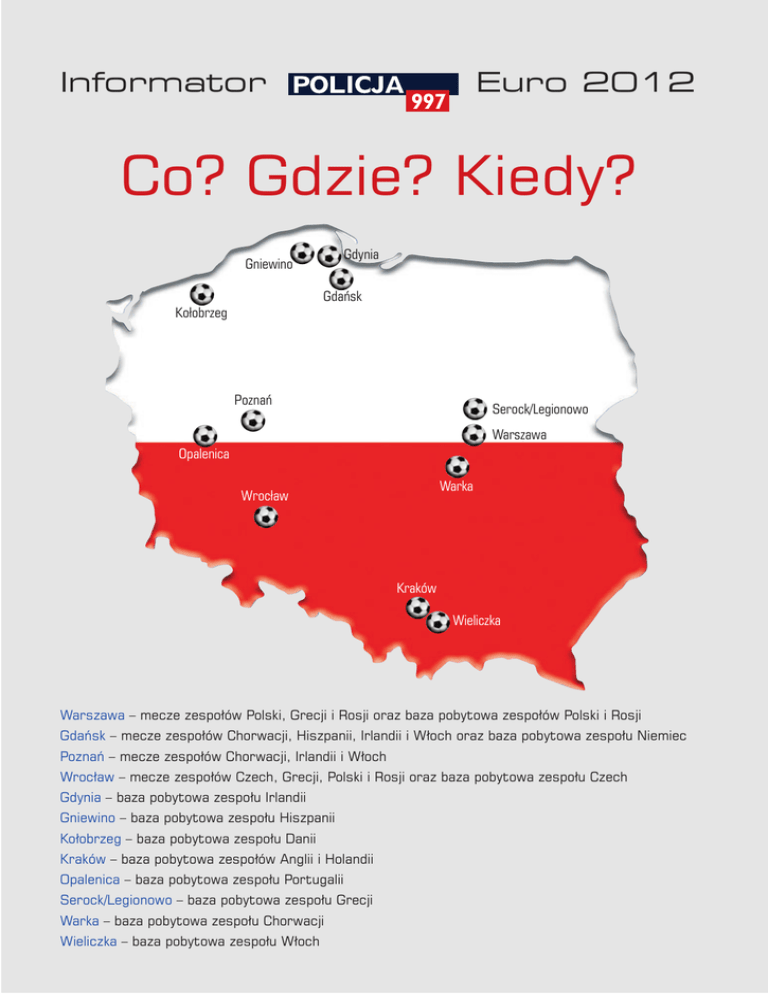 Informator Euro 2012 Co? Gdzie? Kiedy? Gdynia Gniewino Gdaƒsk Kołobrzeg Poznaƒ Serock/Legionowo Warszawa Opalenica Warka Wrocław Kraków Wieliczka Warszawa – mecze zespołów Polski, Grecji i Rosji oraz baza pobytowa zespołów Polski i Rosji Gdaƒsk – mecze zespołów Chorwacji, Hiszpanii, Irlandii i Włoch oraz baza pobytowa zespołu Niemiec Poznaƒ – mecze zespołów Chorwacji, Irlandii i Włoch Wrocław – mecze zespołów Czech, Grecji, Polski i Rosji oraz baza pobytowa zespołu Czech Gdynia – baza pobytowa zespołu Irlandii Gniewino – baza pobytowa zespołu Hiszpanii Kołobrzeg – baza pobytowa zespołu Danii Kraków – baza pobytowa zespołów Anglii i Holandii Opalenica – baza pobytowa zespołu Portugalii Serock/Legionowo – baza pobytowa zespołu Grecji Warka – baza pobytowa zespołu Chorwacji Wieliczka – baza pobytowa zespołu Włoch