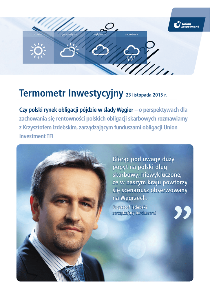 Termometr Inwestycyjny 23 listopada 2015 r. Czy polski rynek obligacji pójdzie w ślady Węgier – o perspektywach dla zachowania się rentowności polskich obligacji skarbowych rozmawiamy z Krzysztofem Izdebskim, zarządzającym funduszami obligacji Union Investment TFI Biorąc pod uwagę duży popyt na polski dług skarbowy, niewykluczone, że w naszym kraju powtórzy się scenariusz obserwowany na Węgrzech. Krzysztof Izdebski zarządzający funduszami W minionym tygodniu prezydent Andrzej Duda powołał nowy rząd. Jakie skutki dla polskich obligacji może mieć obecny układ na scenie politycznej w Polsce? Spodziewam się, że w rezultacie działań nowego rządu na rynku pojawi się więcej polskich obligacji skarbowych. Zasadniczo to dobrze, bo obecnie cieszą się one bardzo dużym zainteresowaniem ze strony inwestorów. Istnieje jedynie obawa, że wraz z kolejnymi emisjami rentowności obligacji będą stopniowo rosły (ceny będą spadać) z uwagi na zwiększający się deficyt budżetowy Polski. Jednak biorąc pod uwagę wspomniany wcześniej duży popyt na polski dług skarbowy, niewykluczone, że w naszym kraju powtórzy się scenariusz obserwowany na Węgrzech. Tam rentowność obligacji rządowych o krótkim terminie zapadalności okazuje się niższa niż w Polsce (ok. 1%), a papierów 10-letnich – wyższa (ok. 3,4%). W Polsce jest to odpowiednio ok. 1,5% i 2,75%. Czy jest jeszcze pole do spadku rentowności polskich obligacji skarbowych? Niewątpliwie tak. Choć część tego ruchu już się dokonała na fali przekonania, że nowa Rada Polityki Pieniężnej pomiędzy marcem a majem przyszłego roku obniży stopy procentowe w Polsce o 50 punktów bazowych. Najważniejsza w tym kontekście stanie się dynamika wzrostu inflacji. Jeśli będzie ona rosła wolniej od oczekiwań, cięcie stóp jest realne. Jeśli zaś szybciej, RPP stanie przed dylematem. Masz pytania? ☎ 800 567 662 (22) 449 03 33 (od poniedziałku do piątku, od 8.00 do 18.00) [email protected] @ www.doradcy.unionklub.pl