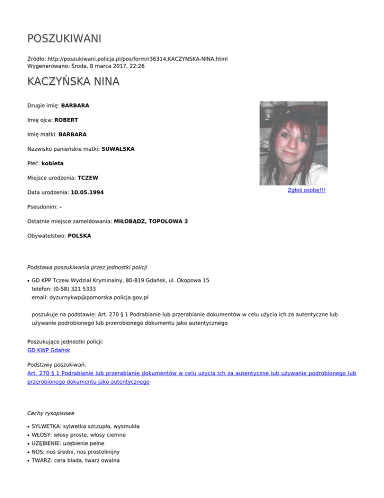 POSZUKIWANI Źródło: http://poszukiwani.policja.pl/pos/form/r36314,KACZYNSKA-NINA.html Wygenerowano: Środa, 8 marca 2017, 22:26 KACZYŃSKA NINA Drugie imię: BARBARA Imię ojca: ROBERT Imię matki: BARBARA Nazwisko panieńskie matki: SUWALSKA Płeć: kobieta Miejsce urodzenia: TCZEW Data urodzenia: 10.05.1994 Zgłoś osobę!!! Pseudonim: Ostatnie miejsce zameldowania: MIŁOBĄDZ, TOPOLOWA 3 Obywatelstwo: POLSKA Podstawa poszukiwania przez jednostki policji ● GD KPP Tczew Wydział Kryminalny, 80-819 Gdańsk, ul. Okopowa 15 telefon: (0-58) 321 5333 email: [email protected] poszukuje na podstawie: Art. 270 § 1 Podrabianie lub przerabianie dokumentów w celu użycia ich za autentyczne lub używanie podrobionego lub przerobionego dokumentu jako autentycznego Poszukujące jednostki policji: GD KWP Gdańsk Podstawy poszukiwań: Art. 270 § 1 Podrabianie lub przerabianie dokumentów w celu użycia ich za autentyczne lub używanie podrobionego lub przerobionego dokumentu jako autentycznego Cechy rysopisowe ● SYLWETKA: sylwetka szczupła, wysmukła ● WŁOSY: włosy proste, włosy ciemne ● UZĘBIENIE: uzębienie pełne ● NOS: nos średni, nos prostolinijny ● TWARZ: cera blada, twarz owalna Wzrost: 156-160 CM Kolor oczu: JASNE Tweetnij