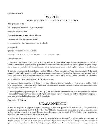 Sygn. akt I C 604/14 WYROK W IMIENIU RZECZYPOSPOLITEJ POLSKIEJ Dnia 30 marca 2015r Sąd Okręgowy w Siedlcach I Wydział Cywilny w składzie następującym: Przewodniczący SSO Andrzej Kirsch Protokolant st. sek. sąd. Joanna Makać po rozpoznaniu w dniu 23 marca 2015r w Siedlcach na rozprawie sprawy z powództwa W. N. i M. N. (1) przeciwko L. S. C. de S. y (...) S.A. Oddział w Polsce z siedzibą w W. o zadośćuczynienie I. zasądza od pozwanego L. S. C. de S. y (...) S.A. Oddział w Polsce z siedzibą w W. na rzecz powódki W. N. kwotę 40.000 (czterdzieści tysięcy) złotych tytułem zadośćuczynienia wraz z odsetkami od dnia 6 stycznia 2015r do dnia 30 marca 2015r w wysokości 8% w stosunku rocznym i od dnia 31 marca 2015r do dnia zapłaty z ustawowymi odsetkami, II. zasądza od pozwanego L. S. C. de S. y (...) S.A. Oddział w Polsce z siedzibą w W. na rzecz powoda M. N. (1) kwotę 40.000 (czterdzieści tysięcy) złotych tytułem zadośćuczynienia wraz z odsetkami od dnia 6 stycznia 2015r do dnia 30 marca 2015r w wysokości 8% w stosunku rocznym i od dnia 31 marca 2015r do dnia zapłaty z ustawowymi odsetkami, III. w pozostałej części powództwo W. N. i M. N. (1) oddala, IV. zasądza od pozwanego L. S. C. de S. y (...) S.A. Oddział w Polsce z siedzibą w W. na rzecz powodów W. N. i M. N. (1) kwoty po 1.979 (jeden tysiąc dziewięćset siedemdziesiąt dziewięć) złotych na rzecz każdego z nich tytułem częściowego zwrotu kosztów procesu, V. nakazuje pobrać od pozwanego L. S. C. de S. y (...) S.A. Oddział w Polsce z siedzibą w W. na rzecz Skarbu Państwa – kasa Sądu Okręgowego w Siedlcach kwotę 3.520 (trzy tysiące pięćset dwadzieścia) złotych tytułem części opłaty od pozwu, od uiszczenia której powodowie byli zwolnieni. Sygn. akt I C 604/14 UZASADNIENIE W dniu 22 maja 2014r wpłynął do Sądu Okręgowego w Siedlcach pozew W. N. i M. N. (1), w którym wnieśli o zasądzenie od pozwanego L. S. C. de S. y (...) S.A. Oddział w Polsce kwoty po 50.000 zł na rzecz każdego z nich tytułem zadośćuczynienia za krzywdę doznaną w wyniku śmierci syna i synowej, tj. T. i M. N. (2), wraz z ustawowymi odsetkami od dnia 17 stycznia 2012r do dnia zapłaty. W uzasadnieniu pozwu podniesiono, że w dniu 20 sierpnia 2011r na trasie G.-Ż. doszło do wypadku drogowego, w którym zginęli T. i M. N. (2), tj. syn i synowa powodów. Sprawcą zdarzenia był P. S., który został uznany winnym spowodowania wypadku wyrokiem Sądu Rejonowego w Siedlcach z dnia 16 kwietnia 2012r, wydanym w sprawie VII K 739/11. Pełnomocnik powodów stwierdził, że za pośrednictwem poprzednika prawnego w 2011r zgłosili oni pozwanemu żądanie wypłaty zadośćuczynienia za doznaną krzywdę. Decyzją z dnia 16 stycznia 2012r pozwany ubezpieczyciel odmówił jakichkolwiek wypłat. W uzasadnieniu pozwu podniesiono, że bezpośrednio przed wypadkiem powodowie zamieszkiwali wspólnie z synem i synową, prowadzili wraz z nimi wspólne gospodarstwo domowe. Pomagali sobie wzajemnie, dzielili się wszystkimi smutkami i radościami. Tradycją w tej rodzinie było wspólne spędzanie niedziel, świąt i innych ważniejszych uroczystości rodzinnych. Mimo problemów alkoholowych, z jakimi borykali się zmarli, stosunki w rodzinie były bardzo dobre. Powodowie podnieśli, że śmierć syna i synowej była dla nich ogromnym wstrząsem psychicznym i zmieniła ich życie. Nie byli oni w stanie normalnie funkcjonować, a stres związany z przedmiotowym zdarzeniem wpłynął na ich zdrowie i psychikę. Powodowie czują żal, smutek i rozpacz. Pomimo upływu 3 lat od zdarzenia powodowie mają problemy ze snem, nie mają apetytu, stracili energię do jakichkolwiek działań. Wspomnienie syna i synowej wciąż wywołuje u nich wzruszenie i emocje. Powodowie podkreślili, że mają jeszcze dwie córki, ale mieszkają one osobno i nie są tak blisko związane z nimi emocjonalnie. W dniu 3 września 2014r wpłynęła do akt sprawy odpowiedź na pozew, w której pozwany nie uznał powództwa, wniósł o jego oddalenie i zasądzenie od powodów na rzecz pozwanego zwrotu kosztów procesu, w tym kosztów zastępstwa procesowego według norm przepisanych. W uzasadnieniu odpowiedzi na pozew przyznano, że sprawca wypadku był ubezpieczony w pozwanym towarzystwie. Stwierdzono, że punktem wyjścia do ustalenia rozmiaru szkody niemajątkowej powinno być dogłębne zbadanie stopnia zażyłości pomiędzy pośrednio poszkodowanym a zmarłym, rodzaju i intensywności łączących ich więzi i żywionych wobec siebie uczuć. Pełnomocnik pozwanego podniósł, że pomimo zamieszkiwania pod tym samym adresem co zmarli i deklarowanej więzi ze zmarłymi, nie podjęli się oni pełnienia obowiązków rodziny zastępczej dla swoich wnucząt, kiedy władza ta była rodzicom T. i M. N. (2) ograniczona. Stwierdzono również, że powodowie nie pielęgnują kontaktów z wnukami, co pozwala sądzić, że więź uczuciowa powodów ze zmarłymi istniała przede wszystkim w sferze deklaracji. Z ostrożności procesowej pozwany wniósł również o oddalenie roszczenia odsetkowego powodów. Pełnomocnik pozwanego wyraził pogląd, że wykluczone jest zasądzenie odsetek za czas przed wyrokowaniem, ponieważ świadczenie ustalone przez Sąd w pełni rekompensuje poniesioną szkodę ustaloną według stanu z chwili wydania wyroku (k. 46-53). Na rozprawie w dniu 23 marca 2015r pełnomocnik powodów podtrzymał i popierał żądanie w takim kształcie, jak zostało to sformułowane w wyroku. Z kolei pełnomocnik pozwanego nie uznawał powództwa i wniósł o jego oddalenie w całości (stanowiska pełnomocników stron zarejestrowane na rozprawie w dniu 23 marca 2015r – 00:49:34-00:53:10). Sąd Okręgowy ustalił, co następuje: W dniu 20 sierpnia 2011r na trasie G.-Ż. miał miejsce wypadek drogowy. Sprawca wypadku P. S. nieumyślnie naruszył zasady bezpieczeństwa w ruchu lądowym w ten sposób, że kierując samochodem osobowym mark
