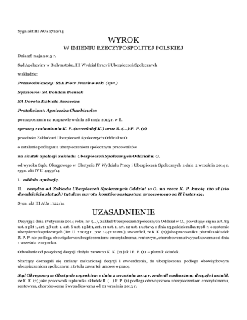 Sygn.akt III AUa 1722/14 WYROK W IMIENIU RZECZYPOSPOLITEJ POLSKIEJ Dnia 28 maja 2015 r. Sąd Apelacyjny w Białymstoku, III Wydział Pracy i Ubezpieczeń Społecznych w składzie: Przewodniczący: SSA Piotr Prusinowski (spr.) Sędziowie: SA Bohdan Bieniek SA Dorota Elżbieta Zarzecka Protokolant: Agnieszka Charkiewicz po rozpoznaniu na rozprawie w dniu 28 maja 2015 r. w B. sprawy z odwołania K. P. (wcześniej K.) oraz R. (...) P. P. (1) przeciwko Zakładowi Ubezpieczeń Społecznych Oddział w O. o ustalenie podlegania ubezpieczeniom społecznym pracowników na skutek apelacji Zakładu Ubezpieczeń Społecznych Oddział w O. od wyroku Sądu Okręgowego w Olsztynie IV Wydziału Pracy i Ubezpieczeń Społecznych z dnia 2 września 2014 r. sygn. akt IV U 4453/14 I. oddala apelację, II. zasądza od Zakładu Ubezpieczeń Społecznych Oddział w O. na rzecz K. P. kwotę 120 zł (sto dwadzieścia złotych) tytułem zwrotu kosztów zastępstwa procesowego za II instancję. Sygn. akt III AUa 1722/14 UZASADNIENIE Decyzją z dnia 17 stycznia 2014 roku, nr (...), Zakład Ubezpieczeń Społecznych Oddział w O., powołując się na art. 83 ust. 1 pkt 1, art. 38 ust. 1, art. 6 ust. 1 pkt 1, art. 11 ust. 1, art. 12 ust. 1 ustawy z dnia 13 października 1998 r. o systemie ubezpieczeń społecznych (Dz. U. z 2013 r., poz. 1442 ze zm.), stwierdził, że K. K. (2) jako pracownik u płatnika składek R. P. P. nie podlega obowiązkowo ubezpieczeniom: emerytalnemu, rentowym, chorobowemu i wypadkowemu od dnia 1 września 2013 roku. Odwołanie od powyższej decyzji złożyła zarówno K. K. (2) jak i P. P. (1) – płatnik składek. Skarżący domagali się zmiany zaskarżonej decyzji i stwierdzenia, że ubezpieczona podlega obowiązkowym ubezpieczeniom społecznym z tytułu zawartej umowy o pracę. Sąd Okręgowy w Olsztynie wyrokiem z dnia 2 września 2014 r. zmienił zaskarżoną decyzje i ustalił, że K. K. (2) jako pracownik u płatnika składek R. (...) P. P. (1) podlega obowiązkowo ubezpieczeniom emerytalnemu, rentowym, chorobowemu i wypadkowemu od 01 września 2013 r. Sąd pierwszej instancji ustalił, że wnioskodawczyni, ur. dnia (...) została zatrudniona w przedsiębiorstwie (...), ul. (...), (...)-(...) O. na podstawie umowy o pracę na czas nieokreślony od dnia 1 września 2013 roku, w pełnym wymiarze czasu pracy za wynagrodzeniem 3.000 zł brutto na stanowisku specjalisty ds. obsługi klienta. Wnioskodawca P. P. (1) prowadzi pozarolniczą działalność gospodarczą pod nazwą R. P. P. od dnia 7 czerwca 2013 roku. Przedmiotem działalności firmy jest wysyłkowa sprzedaż markowej odzieży przez internet ( (...) 41.91.Z - sprzedaż detaliczna prowadzona przez domy sprzedaży wysyłkowej lub internet). W początkowym okresie funkcjonowania siedziba firmy mieściła się w miejscu zamieszkania skarżącego przy ulicy (...) w O.. W późniejszym czasie wnioskodawca przeniósł działalność do lokalu przy ulicy (...) w O., który wynajmował od właściciela – Przedsiębiorstwa Handlowo – Usługowego (...), gdzie w okresie zatrudnienia wykonywała pracę skarżąca. Obecnie wnioskodawca ponownie prowadzi działalność pod adresem zamieszkania. Według dokumentów rozliczeniowych przekazanych do ZUS K. K. (2) dnia 20 września 2009 roku została zgłoszona do ubezpieczeń społecznych z tytułu zatrudnienia na podstawie umowy o pracę u płatnika składek R. P. P. od dnia 1 września 2009 roku. W skład obowiązków odwołującej jako specjalisty ds. obsługi klienta należało pakowanie i wysyłanie towaru, odczytywanie maili z aukcji internetowych, odpisywanie do klientów, obsługa strony internetowej. Sąd pierwszej instancji zwrócił uwagę na zeznania świadka E. W., która prowadzi sprawy księgowe firmy (...). Potwierdziła ona, że skarżąca od września 2013 roku była pracownikiem P. P. (1). Osobiście widziała K. K. (2) w sklepie jak siedziała za biurkiem i wiedziała, że jest to pracownica skarżącego, ponieważ miała dokumenty. Ponadto wskazała, że co prawda nie pamięta jaka była kondycja finansowa firmy we wrześniu 2013 roku, ale widziała ogrom tej pracy i w jej ocenie jednej osobie ciężko byłoby sobie z tym poradzić. Podobnie świadek A. M. – klient - podał, że robił zakupy w sklepie należącym do P. P. (1) i K. K. (2) go obsługiwała. Zakupy robił jednorazowo, ale był tam ze dwa razy i zawsze była tam wtedy wnioskodawczyni. Obsługiwała go i wzięła nawet jego numer telefonu do bazy swoich danych. Podobnie świadek T. R. – klient - zeznał, że również pamięta wnioskodawczynię ze sklepu – kupował u niej koszule. Najpierw zadzwonił i umówił się – telefon odebrała skarżąca, jak był drugi raz to też była tam wnioskodawczyni. Sąd pierwszej instancji dał wiarę świadkom, a jednocześnie ustalił, że od dnia 3 października 2013 roku wnioskodawczyni zgłosiła długotrwałą niezdolność do pracy związaną z chorobą w stanie ciąży i od dnia 1 listopada 2013 roku wystąpiła z roszczeniem o wpłatę zasiłku chorobowego. Na podstawie wypowiedzi wnioskodawców Sąd pierwszej instancji ustalił, że K. K. (2) pracę świadczyła w lokalu przy ulicy (...). Pracowała od 10.00 do 18.00. Podejmując zatrudnienie nie wiedziała, że jest w ciąży. Dowiedziała się w październiku jak poszła do lekarza. Podała, że dziecko urodziła dwa tygodnie przed wydaniem wyroku przez Sąd Okręgowy. Pozostaje nadal w stosunku pracy z pracodawcą i ma nadzieję, że do tej pracy wróci. Z zeznań płatnik składek Sąd ustalił, że na początku rozpoczął on działalność w miejscu swojego zamieszkania przy ulicy (...) w O., ale ze względu na rozwój firmy wynajął lokal przy ulicy (...). Kiedy wnioskodawczyni przyniosła zwolnienie lekarskie przeniósł się z powrotem do mieszkania bo sam nie dawał rady. Na miejsce skarżącej nie zatrudnił nowego pracownika, ale zdecydował się na współpracę z firmą (...), która zajmowa