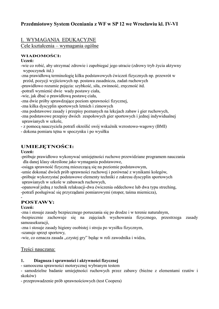 Przedmiotowy System Oceniania z WF w SP 12 we Wrocławiu kl. IV-VI I. WYMAGANIA EDUKACYJNE Cele kształcenia – wymagania ogólne WIADOMOŚCI: Uczeń: -wie co robić, aby utrzymać zdrowie i zapobiegać jego utracie (zdrowy tryb życia aktywny wypoczynek itd.) -zna prawidłową terminologię kilku podstawowych ćwiczeń fizycznych np. przewrót w przód, pozycji wyjściowych np. postawa zasadnicza, zadań ruchowych -prawidłowo rozumie pojęcia: szybkość, siła, zwinność, zręczność itd. -potrafi wymienić dwie wady postawy ciała, -wie, jak dbać o prawidłową postawę ciała, -zna dwie próby sprawdzające poziom sprawności fizycznej, -zna kilka dyscyplin sportowych letnich i zimowych -zna podstawowe zasady i przepisy poznanych na lekcjach zabaw i gier ruchowych, -zna podstawowe przepisy dwóch zespołowych gier sportowych i jednej indywidualnej uprawianych w szkole, - z pomocą nauczyciela potrafi określić swój wskaźnik wzrostowo-wagowy (BMI) - dokona pomiaru tętna w spoczynku i po wysiłku UMIEJĘTNOŚCI: Uczeń: -próbuje prawidłowo wykonywać umiejętności ruchowe przewidziane programem nauczania dla danej klasy określone jako wymagania podstawowe, -osiąga sprawność fizyczną mieszczącą się na poziomie podstawowym, -umie dokonać dwóch prób sprawności ruchowej i porównać z wynikami kolegów, -próbuje wykorzystać podstawowe elementy techniki z zakresu dyscyplin sportowych uprawianych w szkole w zabawach ruchowych, -opanował jedną z technik relaksacji-dwa ćwiczenia oddechowe lub dwa typu streching, -potrafi posługiwać się przyrządami pomiarowymi (stoper, taśma miernicza), POSTAWY: Uczeń: -zna i stosuje zasady bezpiecznego poruszania się po drodze i w terenie naturalnym, -bezpiecznie zachowuje się na zajęciach wychowania fizycznego, przestrzega zasady samoasekuracji, -zna i stosuje zasady higieny osobistej i stroju po wysiłku fizycznym, -szanuje sprzęt sportowy, -wie, co oznacza zasada „czystej gry” będąc w roli zawodnika i widza, Treści nauczana: 1. Diagnoza i sprawności i aktywności fizycznej - samoocena sprawności motorycznej wybranym testem - samodzielne badanie umiejętności ruchowych przez zabawy (bieżne z elementami rzutów i skoków) - przeprowadzenie prób sprawnościowych (test Coopera) - ćwiczenia i działania wpływające na wydolność organizmu - ćwiczenia gimnastyczne w podporach i zwisach - ćwiczena kształtujące określone cechy motoryczne - Najczęstrze wady postawy, przyczyny ich powstawania oraz sposoby zapobiegania 2. Trening zdrowotny - gry i zabawy bieżne z przyborami i bez (szybkiw wykonywanie zadań na sygnał - pomiar tętna w spoczynku po wysiłku - gry i zabawy z mocowaniem, przeciąganiem i przepychwniem współćwiczącego - biegi na krótkich i długich dystansach - starty z różnych pozycji - skok w dal i wzwyż - rzuty przyborami typowymi i nietypowymi (pika palantowa, piłka lekarska) - zabawy skoczne oraz wieloskoki na różnym podlożu - wieloboje z elementami rzutów, skoków i biegów - zabawy i biegi w terenie - przewrót w przód dowolnym sposobem z prawidłowym ułożeniem rąk i nóg. - przewrót w tył dowolnym sposobem z prawidłowym ułożeniem rąk i nóg. - przejście równoważne po odwróconej ławeczce dowolnym sposobem. - przeskoki i skoki zawrotne przez różne przeszkody. - zwinnościowe tory przeszkód - sprawność koordynacyjna (wymijanie, omijanie, przetaczanie się) 3. Sporty całego życia i wypoczynek - odbicie piłki sposobem górnym i dolnym. - zagrywka sposobem dolnym i górnym z odległości - stosowanie poznanych elementow technicznych z pilki siatkowej w grze. - podania piłki oburącz sprzed klatki piersiowej miejscu, w ruchu oraz jednorącz ręką prawą i lewą. - chwyty piłki oburącz dolne i górne . - poruszanie się po boisku bez piłki, zatrzymanie na jedno i dwa tempa. - rzuty do kosza z miejsca prawą i lewą ręką. Rzuty do kosza w biegu po kozłowaniu. - kozłowanie piłki prawą i lewą - ręką ze zmianą kierunku poruszania się. - poznane elementy techniczne w trakcie gry. - prowadzenie piłki w dwójkach nogą prawą i lewą. - uderzenie i przyjęcie piłki wewnętrzną i zewnętrzną częścią stopy lewej i prawej nogi. - strzał do bramki wewnętrznym podbiciem nogą prawą i lewą. - podanie piłki jednorącz w miejscu i w ruchu. - chwyt piłki oburącz w miejscu i w ruchu. - kozłowanie piłki prawą i lewą ręką w miejscu i w ruchu. - rzut do bramki jednorącz dowolnym sposobem. - poruszanie po boisku w zmiennym tempie w różnych kierunkach. 4. Bezpieczna aktywność fizyczna - organizacja i bezpieczeństwo w trakcie wszelkich zajęć ruchowych - zasady bezpiecznego uczestniczenia w zajęciach rekreacyjnych - bezpieczne zasady korzystania ze sprzętu sportowego - właściwe przygotowanie do zajęć ruchowych (ubiór) - przepisy zabaw i gier sportowych - samoasekuracja i asekuracja przy wykonywaniu ćwiczeń ruchowych - bezpieczna droga do szkoły - podstawowe nawyki higienicznezachowanie się w nagłych wypadkach (sposobywzywania pomocy) - zasady udzielania pierwszej pomocy (urazy, zranienia, stłuczenia) 5. Sport -zasady organizacji i sędziowania w wybranych dyscyplinach ruchowych - wykorzystywanie w grach elementów techniki i taktyki - organizacja zawodów klasowych - zasady fair play, uczciwa rywalizacja - przepisy w poszczególnych konkurencjach lekkoatletycznych 6. Taniec - zabawy z muzyką i śpiewem - ruch w zmiennym rytmie - ekspresja ruchowa przy muzyce - zabawy naśladowcze, improwizacje ruchowe - tańce regionalne i narodowe II. KRYTERIA OCEN Ocenę celującą otrzymuje uczeń, który wykazuje się szczególnym zaangażowaniem w pracy, twórczą postawą umiejętnościami i wiadomościami poza program nauczania w danej klasie. Chętnie uczestniczy w zajęciach sportowo rekreacyjnych poza lekcyjnych, bierze udział w konkursach, zawodach reprezentując szkołę. Ocenę bardzo dobrą otrzymuje uczeń, który całkowicie 