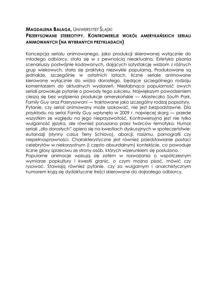MAGDALENA BAŁAGA, UNIWERSYTET ŚLĄSKI PRZERYSOWANE STEREOTYPY. KONTROWERSJE WOKÓŁ ANIMOWANYCH (NA WYBRANYCH PRZYKŁADACH) AMERYKAŃSKICH SERIALI Koncepcja serialu animowanego, jako produkcji skierowanej wyłącznie do młodego odbiorcy, stała się w z pewnością nieaktualna. Estetyka pisania scenariuszy podwójnie kodowanych, dających satysfakcję widzom z różnych grup wiekowych, stała się praktyką niezwykle popularną. Produkowane są jednakże, szczególnie w ostatnich latach, liczne seriale animowane kierowane wyłącznie do widza dorosłego, będące szczególnego rodzaju komentarzem do aktualnych wydarzeń. Niesłabnąca popularność owych seriali prowokuje pytanie o powody tego sukcesu. Największym powodzeniem cieszą się bez wątpienia produkcje amerykańskie — Miasteczko South Park, Family Guy oraz Przerysowani — traktowane jako szczególny rodzaj popsatyry. Pytanie, czy serial animowany może szokować, nie jest bezpodstawne. Dla przykładu na serial Family Guy wpłynęło w 2009 r. najwięcej skarg — przede wszystkim ze względu na jego nieprzyzwoitość. Kontrowersyjna jest nie tylko wulgarność języka, ale również poruszana przez twórców tematyka. Humor seriali „dla dorosłych” opiera się na kwestiach dyskusyjnych w społeczeństwie: eutanazji (słynny casus Terry Schiavo), aborcji, rasizmu, pornografii czy niepełnosprawności. Charakterystyczne jest również przedstawianie postaci celebrytów w niekorzystnym (i często absurdalnym) kontekście, co powoduje liczne głosy sprzeciwu ze strony osób, których wizerunkiem się posłużono. Popularne animacje wpisują się zatem w rozważania o współczesnym wymiarze popkultury i kwestii granic, o czym można pisać, mówić czy rysować. Stawiają również pytanie, czy za wulgarnym i anarchistycznym humorem kryją się dydaktyczne treści skierowane do dojrzałego odbiorcy.