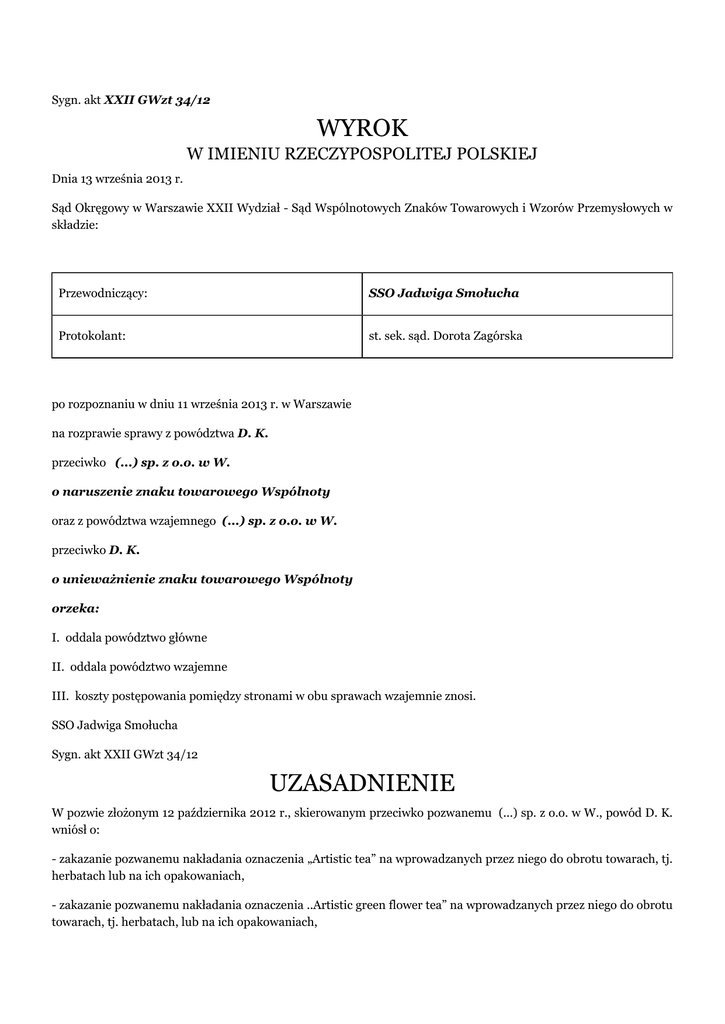 Sygn. akt XXII GWzt 34/12 WYROK W IMIENIU RZECZYPOSPOLITEJ POLSKIEJ Dnia 13 września 2013 r. Sąd Okręgowy w Warszawie XXII Wydział - Sąd Wspólnotowych Znaków Towarowych i Wzorów Przemysłowych w składzie: Przewodniczący: SSO Jadwiga Smołucha Protokolant: st. sek. sąd. Dorota Zagórska po rozpoznaniu w dniu 11 września 2013 r. w Warszawie na rozprawie sprawy z powództwa D. K. przeciwko (...) sp. z o.o. w W. o naruszenie znaku towarowego Wspólnoty oraz z powództwa wzajemnego (...) sp. z o.o. w W. przeciwko D. K. o unieważnienie znaku towarowego Wspólnoty orzeka: I. oddala powództwo główne II. oddala powództwo wzajemne III. koszty postępowania pomiędzy stronami w obu sprawach wzajemnie znosi. SSO Jadwiga Smołucha Sygn. akt XXII GWzt 34/12 UZASADNIENIE W pozwie złożonym 12 października 2012 r., skierowanym przeciwko pozwanemu (...) sp. z o.o. w W., powód D. K. wniósł o: - zakazanie pozwanemu nakładania oznaczenia „Artistic tea” na wprowadzanych przez niego do obrotu towarach, tj. herbatach lub na ich opakowaniach, - zakazanie pozwanemu nakładania oznaczenia ..Artistic green flower tea” na wprowadzanych przez niego do obrotu towarach, tj. herbatach, lub na ich opakowaniach, - zakazanie pozwanemu oferowania, wprowadzania do obrotu łub magazynowania w rym celu herbat lub ich opakowań z oznaczeniem ..Artistic tea”, - zakazanie pozwanemu oferowania, wprowadzania do obrotu lub magazynowania w tym celu herbat lub ich opakowań z oznaczeniem „Artistic green flower tea”, - zakazanie pozwanemu używania oznaczenia ,,Artistic tea” w dokumentach handlowych i reklamach herbat, a w szczególności w Internecie, - zakazanie pozwanemu używania oznaczenia „Artistic green flower tea” w dokumentach handlowych i reklamach herbat, a w szczególności w Internecie, - nakazanie pozwanemu aby wycofał znajdujące się w obrocie opakowania noszące oznaczenie „Artistic tea” wprowadzone przez niego do obrotu, - nakazanie pozwanemu, aby wycofał znajdujące się w obrocie opakowania noszące oznaczenie „Artistic green flower tea” wprowadzone przez niego do obrotu., - nakazanie pozwanemu, aby na własny koszt zniszczył opakowania oraz projekty opakowań noszące oznaczenia „Artistic tea” - nakazanie pozwanemu, aby na własny koszt zniszczył opakowania oraz projekty opakowań noszące oznaczenia „Artistic green flower tea” - nakazanie pozwanemu zamieszczenia w dzienniku ,,(...)” na stronie nie dalszej niż numer 5 i w formacie ¼ wielkości strony, oświadczenia o treści: (...) sp. z o.o. z siedzibą w W., wcześniej występująca pod firmą (...) sp. z o.o. z siedzibą w W., oświadcza, że wprowadzając do obrotu herbaty i posługując się w obrocie oznaczeniem „Artistic tea” dopuściła się naruszenia praw D. K. do wspólnotowego znaku towarowego „Artistic tea”. (...) sp. z o.o. wyraża z tego powodu ubolewanie i oświadcza, że zaprzestała używania oznaczenia „Artistic tea”.” - zasądzenie od pozwanego na rzecz powoda w sumie 2 000 zł od dnia wniesienia pozwu do dnia zapłaty - zasądzenie od pozwanego na rzecz powoda kosztów procesu według norm przepisanych. W uzasadnieniu pozwu powód podał, że w ramach prowadzonej przez niego działalności gospodarczej oferuje do sprzedaży herbaty w postaci kulek lub innych kształtów, przyjmujących po zaparzeniu postać rozwiniętego kwiatu. W ramach swojej działalności powód używa oznaczenia słownego „Herbaty artystyczne”, będącego znakiem towarowym, na który udzielone zostało prawo ochronne nr (...). Prawo to dotyczy herbat leczniczych, herbaty, herbaty ziołowej, owocowej, herbaty z efektami wizualnymi, herbaty z suszonymi kwiatami, rozwijającymi się w czasie parzenia, herbaty mrożonej i napojów na bazie herbaty. Powód ponadto zarejestrował jako wspólnotowy znak towarowy oznaczenie słowno – graficzne „Artistic tea” dla takich grup towarowych jak: kawy, herbaty, cukier, ryż, tapioka, sago, kawy nienaturalnej, mąki i produktów zbożowych, chleba, wyrobów cukierniczych i słodyczy, lodów, miodu, melasy i innych. W ocenie powoda oznaczenia „Herbaty artystyczne” i „Artistic tea” w praktyce są tożsame i używane przez powoda wymiennie w obu przypadkach kojarzą się z tymi samymi towarami oraz z przedsiębiorstwem powoda. Oferta powoda skierowana jest zarówno do konsumentów jak i przedsiębiorców - powód sprzedaje swoje towary m.in. za pośrednictwem sklepu internetowego, znajdującego się pod adresem (...), hoteli, restauracji, ośrodków Spa, sklepów specjalistycznych czy agencji reklamowych. Powód podał, że ponosi znaczne nakłady na promocję marki przedsiębiorstwa, inwestuje w reklamy, bierze udział w targach i konkursach, a działania te są ukierunkowane na segment nabywców towarów luksusowych. Powód sprzedaje swoje towary w tzw. bombonierach, wytworzonych z tektury stanowiącej kombinację specjalistycznych uszlachetnień i rozwiązań konstrukcyjnych. Powód podał dalej, że pozwany, który do 27 czerwca 2012 r. posługiwał się nazwą (...) sp. z o.o., również prowadzi sprzedaż herbaty w postaci kulek, rozwijających się po zalaniu ich gorącą wodą i przyjmujących postać kwiatów, posługując się przy tym oznaczeniem „Artistic tea”. Oznaczenia te znajdują się m.in. na stronie internetowej pod adresem (...), która do końca września 2012 r. należała do pozwanego i była przez niego administrowana, a po przejęciu jej przez (...) S.A., będącego właścicielem wszystkich udziałów pozwanej spółki, nadal sprzedawane są na niej herbaty z oznaczeniem „Artistic tea” i w nagłówku filmu reklamowego umieszczonego na tej stronie używane było określenie „Herbata artystyczna”. Ponadto pozwany posługuje się oznaczeniami zawierającymi słowa „Artistic tea” na fakturach sprzedaży, opakowaniach oraz oferując towary do sprzedaży na portalu internetowym (...) W odpowiedzi na pozew pozw