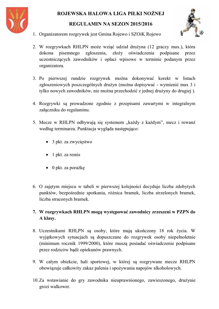 ROJEWSKA HALOWA LIGA PIŁKI NOŻNEJ REGULAMIN NA SEZON 2015/2016 1. Organizatorem rozgrywek jest Gmina Rojewo i SZOiK Rojewo 2. W rozgrywkach RHLPN może wziąć udział drużyna (12 graczy max.), która dokona pisemnego zgłoszenia, złoży oświadczenia podpisane przez uczestniczących zawodników i opłaci wpisowe w terminie podanym przez organizatora. 3. Po pierwszej rundzie rozgrywek można dokonywać korekt w listach zgłoszeniowych poszczególnych drużyn (można dopisywać - wymienić max 3 i tylko nowych zawodników, nie można przechodzić z jednej drużyny do drugiej ). 4. Rozgrywki są prowadzone zgodnie z przepisami zawartymi w integralnym załączniku do regulaminu. 5. Mecze w RHLPN odbywają się systemem „każdy z każdym”, mecz i rewanż według terminarza. Punktacja wygląda następująco: 3 pkt. za zwycięstwo 1 pkt. za remis 0 pkt. za porażkę 6. O zajętym miejscu w tabeli w pierwszej kolejności decyduje liczba zdobytych punktów, bezpośrednie spotkania, różnica bramek, liczba strzelonych bramek, liczba straconych bramek. 7. W rozgrywkach RHLPN mogą występować zawodnicy zrzeszeni w PZPN do A klasy. 8. Uczestnikami RHLPN są osoby, które mają ukończony 18 rok życia. W wyjątkowych sytuacjach są dopuszczane do rozgrywek osoby niepełnoletnie (minimum rocznik 1999/2000), które muszą posiadać oświadczenie podpisane przez rodziców bądź opiekunów prawnych. 9. W całym obiekcie, hali sportowej, w której są rozgrywane mecze RHLPN obowiązuje całkowity zakaz palenia i spożywania napojów alkoholowych. 10. Za wstawianie do gry zawodnika nieuprawnionego, zawieszonego, drużynie grozi walkower. 11. Czas oczekiwania na drużynę wynosi max. 5 minut. Drużyna, która nie rozpocznie spotkania w ciągu tego czasu zostanie ukarana walkowerem w stosunku 0 : 3 . 12. Trzykrotne nie stawienie się drużyny na mecz w określonym terminie spowoduje wykluczenie jej z rozgrywek. 13. W czasie trwania zawodów prawo do dyskusji z sędzią ma tylko i wyłącznie kapitan drużyny. 14. W uzasadnionych przypadkach kapitan lub kierownik drużyny może składać protesty do organizatora, ale najpóźniej zaraz po odbytym meczu. 15. Wszystkie protesty rozpatrują sędziowie i udzielają kar. 16. Wszelka działalność drużyny na boisku lub na terenie sali sprzeczna z etyką sportową będzie karana przez organizatora. 17. Organizator ma prawo podjąć decyzję o wykluczeniu danej drużyny z rozgrywek w przypadku łamania przez nią regulaminu. 18. Drużynie wykluczonej z rozgrywek nie przysługuje zwrot kosztów. 19. Za usterki dokonane przez daną drużynę, stwierdzone w sali sportowej ponosi pełną odpowiedzialność jej kierownik. 20. Przełożenie terminu spotkania jest możliwe tylko w wyjątkowych sytuacjach, jeden raz w sezonie przez każdą z drużyn, co najmniej 7 dni przed meczem. W takich sytuacjach drużyna przeciwna musi wyrazić zgodę, ale termin rozegrania przełożonego spotkania ustala organizator. 21. Każda drużyna uczestnicząca w rozgrywkach powinna być ubezpieczona we własnym zakresie od następstw nieszczęśliwych wypadków i kontuzji. Organizator nie ponosi za nie odpowiedzialności. 22. Wszyscy uczestnicy rozgrywek są zobowiązani do zapoznania się z niniejszym regulaminem i przestrzegania go podczas zawodów. Za dopełnienie tego punktu są odpowiedzialni kierownicy drużyn. 23. Organizator zastrzega sobie pełne i wyłączne prawo do interpretacji niniejszego regulaminu oraz jego zmiany po konsultacjach z uczestnikami rozgrywek.