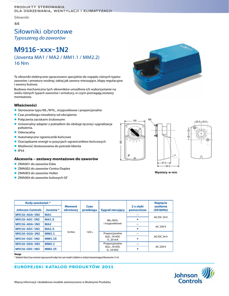 produkty sterowania dla ogrzewania, wentylacji i klimatyzacji Siłowniki 44 Siłowniki obrotowe Typoszereg do zaworów M9116-xxx-1N2 (Joventa MA1 / MA2 / MM1.1 / MM2.2) 16 Nm Te siłowniki elektryczne opracowano specjalnie do napędu różnych typów zaworów i armatury wodnej, takiej jak zawory mieszające, klapy regulacyjne i zawory kulowe. Budowa mechaniczna tych siłowników umożliwia ich wykorzystanie na wielu różnych typach zaworów i armatury, w czym pomagają zestawy montażowe. Właściwości M6 25 Akcesoria – zestawy montażowe do zaworów 67.5 94.5 zz ZMA001 do zaworów Esbe zz ZMA002 do zaworów Centra-Duplex zz ZMA003 do zaworów Holter zz ZMA004 do zaworów kulowych GF Kody zamówień * Johnson Controls Joventa * M9116-AGA-1N2 MA1 M9116-AGC-1N2 MA1.S M9116-ADA-1N2 MA2 M9116-ADC-1N2 MA2.S M9116-GGA-1N2 MM1.1 M9116-GGC-1N2 MM1.1S M9116-GDA-1N2 MM2.2 M9116-GDC-1N2 MM2.2S Moment obrotowy Wymiary w mm Czas przebiegu Sygnał sterujący 2 x styki pomocnicze --- WŁ./WYŁ. i trzypunktowe 16 Nm 32.5 32.5 25 100 180 zz Sterowanie typu WŁ./WYŁ., trzypunktowe i proporcjonalne zz Czas przebiegu niezależny od obciążenia zz Połączenia zaciskami śrubowymi zz Uniwersalny adapter z pokrętłem do obsługi ręcznej i sygnalizacja położenia. zz Odwracalny zz Automatyczne ograniczniki końcowe zz Oszczędzanie energii w pozycjach ograniczników końcowych zz Możliwość dostosowania do potrzeb klienta zz IP54 120 s --- Proporcjonalne 0(2)...10 VDC 0...20 mA Proporcjonalne 0(2)...10 VDC 0...10 VDC Uwaga * dodanie litery K po numerze typu pozwoli nabyć ten sam model z kablem w izolacji niezawierającej fluorowców (1 m) europejski katalog produktów 2011 Więcej informacji i dodatkowe modele zamieszczono w Biuletynie Produktu. --- --- Napięcie zasilania (50/60Hz) AC/DC 24 V AC 230 V AC/DC 24 V AC 230 V