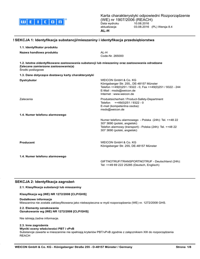 Karta charakterystyki odpowiedni Rozporządzenie (WE) nr 1907/2006 (REACH) Data wydruku aktualizacja 10.08.2016 03.08.2016 (PL) Wersja 8.4 AL-H ! SEKCJA 1: Identyfikacja substancji/mieszaniny i identyfikacja przedsiębiorstwa 1.1. Identyfikator produktu Nazwa handlowa produktu AL-H Code-Nr. 265000 1.2. Istotne zidentyfikowane zastosowania substancji lub mieszaniny oraz zastosowania odradzane Zalecane zamierzone zastosowanie(a) Środki poślizgowe 1.3. Dane dotyczące dostawcy karty charakterystyki Dystrybutor WEICON GmbH & Co. KG Königsberger Str. 255,, DE-48157 Münster Telefon ++49(0)251 / 9322 - 0, Fax ++49(0)251 / 9322 - 244 E-Mail : [email protected] Internet : www.weicon.de Zalecenia Produktsicherheit / Product-Safety-Department Telefon ++49(0)251 / 9322 - 0 E-mail (kompetentna osoba): [email protected] 1.4. Numer telefonu alarmowego Numer telefonu alarmowego - Polska (24h): Tel. ++48 22 307 3690 (polski, angielski) Telefon alarmowy (transport) - Polska (24h): Tel. ++48 22 307 3690 (polski, angielski) Producent WEICON GmbH & Co. KG Königsberger Str. 255, DE-48157 Münster 1.4. Numer telefonu alarmowego GIFTNOTRUF/TRANSPORTNOTRUF - Deutschland (24h): Tel: ++49 69 222 25285 (Deutsch, Englisch) SEKCJA 2: Identyfikacja zagrożeń 2.1. Klasyfikacja substancji lub mieszaniny Klasyfikacja wg (WE) NR 1272/2008 [CLP/GHS] Dodatkowe informacje Mieszanina nie została zaklasyfikowana jako niebezpieczna w myśl rozporządzenia (WE) nr. 1272/2008 GHS. 2.2. Elementy oznakowania Oznakowanie wg (WE) NR 1272/2008 [CLP/GHS] Nie istnieją żadne informacje. 2.3. Inne zagrożenia Wyniki oceny właściwości PBT i vPvB Substancje zawarte w mieszaninie nie spełniają kryteriów PBT/vPvB zgodnie z załącznikiem XIII do rozporządzenia REACH WEICON GmbH & Co. KG - Königsberger Straße 255 - D-48157 Münster / Germany Strona 1/8 Karta charakterystyki odpowiedni Rozporządzenie (WE) nr 1907/2006 (REACH) Data wydruku aktualizacja 10.08.2016 03.08.2016 (PL) Wersja 8.4 AL-H SEKCJA 3: Skład/ informacja o składnikach 3.1. Substancje nie dotyczy 3.2. Mieszaniny Opis Zubereitung von Metallseife in Syntheseöl mit Additiven Składniki niebezpieczne Nr CAS Nr WE Oznaczenie [% wag.] Klasyfikacja wg (WE) NR 1272/2008 [CLP/GHS] 80939-62-4 279-632-6 Amines, C11-14-branched alkyl, monohexyl and dihexyl phosphates <1 Eye Irrit. 2, H319 / Skin Irrit. 2, H315 / Aquatic Chronic 2, H411 SEKCJA 4: Środki pierwszej pomocy 4.1. Opis środków pierwszej pomocy Informacje ogólne Natychmiast zdjąć zanieczyszczoną, nasiąkniętą odzież. W przypadku wdychania Zapewnić świeże powietrze. W przypadku objawów skierować do lekarza W przypadku kontaktu ze skórą W przypadku kontaktu ze skórą umyć skórę wodą z mydłem. W przypadku kontaktu z okiem W przypadku kontaktu z oczami płukać dokładnie dużą ilością wody. Skonsultować się z lekarzem jeśli objawy utrzymują się. W przypadku połknięcia Odtransportować do leczenia lekarskiego. 4.2. Najważniejsze ostre i opóźnione objawy oraz skutki narażenia Nie istnieją żadne informacje. 4.3. Wskazania dotyczące wszelkiej natychmiastowej pomocy lekarskiej i szczególnego postępowania z poszkodowanym Nie istnieją żadne informacje. SEKCJA 5: Postępowanie w przypadku pożaru 5.1. Środki gaśnicze Odpowiednie środki gaśnicze Piana odporna na alkohol Proszki gaśnicze Dwutlenek węgla Rozproszone prądy wody Niewłaściwy rozpuszczalnik Zwarty strumień wody 5.2. Szczególne zagrożenia związane z substancją lub mieszaniną W przypadku pożaru mogą powstawać niebezpieczne gazy. Tlenek węgla (CO) Dwutlenek węgla (CO2) WEICON GmbH & Co. KG - Königsberger Straße 255 - D-48157 Münster / Germany Strona 2/8 Karta charakterystyki odpowiedni Rozporządzenie (WE) nr 1907/2006 (REACH) Data wydruku aktualizacja 10.08.2016 03.08.2016 (PL) Wersja 8.4 AL-H 5.3. Informacje dla straży pożarnej Specjalny sprzęt ochronny dla straźaków Akcja gaśnicza, prace ratownicze i sprzątające w warunkach pożaru oraz gazów wytlewnych powinny być wykonywane tylko w aparatach oddechowych. Nie wdychać gazów powstających podczas pożaru i/lub wybuchu. Dodatkowe informacje Zagrożone pojemniki chłodzić rozproszonym strumieniem wody. Zebrać oddzielnie zanieczyszczoną wodę gaśniczą. Nie można jej usuwać do kanalizacji. SEKCJA 6: Postępowanie w przypadku niezamierzonego uwolnienia do środowiska 6.1. Indywidualne środki ostrożności, wyposażenie ochronne i procedury w sytuacjach awaryjnych Personel nieprzeszkolony na wypadek zagrożenia Zapewnić odpowiednią wentylację. Stosować osobistą odzież ochronną. Wysokie zagrożenie poślizgnięcia spowodowane rozlaniem/wyciekiem produktu. 6.2. Środki ostrożności w zakresie ochrony środowiska Nie wylewać do ścieków lub wód. 6.3. Metody i materiały zapobiegające rozprzestrzenianiu się skażenia i służące do usuwania skażenia Zaobsorbowany materiał usuwać zgodnie z przepisami. Zebrać mechanicznie. 6.4. Odniesienia do innych sekcji Bezpieczna obsługa: patrz Dział 7 Usunięcie odpadów: patrz Dział 13 Środki ochrony indywidualnej: patrz Dział 8 SEKCJA 7: Postępowanie z substancjami i mieszaninami oraz ich magazynowanie 7.1. Środki ostrożności dotyczące bezpiecznego postępowania Wskazówki dotyczące bezpiecznego posługiwania się Przedsięwziąć środki ostrożności obowiązujące przy pracy z chemikaliami. Ogólne środki ochronne Unikać kontaktu z oczami i skórą. Nie wdychać gazów/par/aerozoli. Środki higieny Podczas pracy nie jeść, nie pić, nie palić. Umyć ręce i twarz przed przerwą i po zakończeniu pracy. Wskazówki dotyczące ochrony przeciwpożarowej i przeciwwybuchowej Nie są wymagane specjalne środki ostrożności. 7.2. Warunki bezpiecznego magazynowania, łącznie z informacjami dotyczącymi wszelkich wzajemnych niezgodności Wymagania dla pomieszczeń magazynowych i pojemników Przechowywać w zamkniętych, oryginalnych pojemnikach. Zalecenia dotyczące wsp