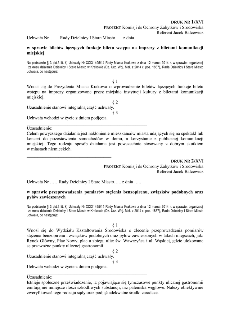 DRUK NR 1/XVI PROJEKT Komisji ds Ochrony Zabytków i Środowiska Referent Jacek Balcewicz Uchwała Nr …… Rady Dzielnicy I Stare Miasto….. z dnia ….. w sprawie biletów łączących funkcje biletu wstępu na imprezy z biletami komunikacji miejskiej Na podstawie § 3 pkt.3 lit. k) Uchwały Nr XCIX1495/14 Rady Miasta Krakowa z dnia 12 marca 2014 r. w sprawie: organizacji i zakresu działania Dzielnicy I Stare Miasto w Krakowie (Dz. Urz. Woj. Mał. z 2014 r. poz. 1837), Rada Dzielnicy I Stare Miasto uchwala, co następuje: §1 Wnosi się do Prezydenta Miasta Krakowa o wprowadzenie biletów łączących funkcje biletu wstępu na imprezy organizowane przez miejskie instytucji kultury z biletami komunikacji miejskiej. §2 Uzasadnienie stanowi integralną część uchwały. §3 Uchwała wchodzi w życie z dniem podjęcia. _____________________________________________________ Uzasadnienie: Celem powyższego działania jest nakłonienie mieszkańców miasta udających się na spektakl lub koncert do pozostawienia samochodów w domu, a korzystanie z publicznej komunikacji miejskiej. Tego rodzaju sposób działania jest powszechnie stosowany z dobrym skutkiem w miastach niemieckich. ________________________________ DRUK NR 2/XVI PROJEKT Komisji ds Ochrony Zabytków i Środowiska Referent Jacek Balcewicz Uchwała Nr ……Rady Dzielnicy I Stare Miasto….. z dnia ….. w sprawie przeprowadzenia pomiarów stężenia benzopirenu, związków podobnych oraz pyłów zawieszonych Na podstawie § 3 pkt.3 lit. k) Uchwały Nr XCIX1495/14 Rady Miasta Krakowa z dnia 12 marca 2014 r. w sprawie: organizacji i zakresu działania Dzielnicy I Stare Miasto w Krakowie (Dz. Urz. Woj. Mał. z 2014 r. poz. 1837), Rada Dzielnicy I Stare Miasto uchwala, co następuje: §1 Wnosi się do Wydziału Kształtowania Środowiska o zlecenie przeprowadzenia pomiarów stężenia benzopirenu i związków podobnych oraz pyłów zawieszonych w takich miejscach, jak: Rynek Główny, Plac Nowy, plac u zbiegu ulic: św. Wawrzyńca i ul. Wąskiej, gdzie ulokowane są przewoźne punkty ulicznej gastronomii. §2 Uzasadnienie stanowi integralną część uchwały. §3 Uchwała wchodzi w życie z dniem podjęcia. _____________________________________________________ Uzasadnienie: Istnieje społeczne przeświadczenie, iż pojawiające się tymczasowe punkty ulicznej gastronomii emitują nie mniejsze ilości szkodliwych substancji, niż paleniska węglowe. Należy obiektywnie zweryfikować tego rodzaju sądy oraz podjąć adekwatne środki zaradcze. DRUK NR 3/XVI PROJEKT Komisji ds Ochrony Zabytków i Środowiska Referent Jacek Balcewicz Uchwała Nr …… Rady Dzielnicy I Stare Miasto….. z dnia ….. w sprawie skutecznego egzekwowania Regulaminu Plant Na podstawie § 3 pkt.3 lit. k) Uchwały Nr XCIX1495/14 Rady Miasta Krakowa z dnia 12 marca 2014 r. w sprawie: organizacji i zakresu działania Dzielnicy I Stare Miasto w Krakowie (Dz. Urz. Woj. Mał. z 2014 r. poz. 1837), Rada Dzielnicy I Stare Miasto uchwala, co następuje: §1 Wnosi się do Zarządu Zieleni Miejskiej o skuteczne egzekwowanie Regulaminu Plant, a szczególności zapisu dotyczącego zakazu ruchu pojazdów mechanicznych po traktach pieszych. Odnosi się to także do pojawiających się w ostatnim czasie pojazdów elektrycznych takich jak: segwaye oraz trójkołowe skutery elektryczne. §2 Uzasadnienie stanowi integralną część uchwały. §3 Uchwała wchodzi w życie z dniem podjęcia. _____________________________________________________ Uzasadnienie: Pojazdy elektryczne, aczkolwiek nie emitują spalin, ale mogą rozwijać prędkość nawet do 40 km/godz. stanowią zagrożenie dla poruszających się pieszo dorosłych i dzieci, a także osób niepełnosprawnych. Zagrożenie jest tym większe, iż jeżdżą praktycznie bezszelestnie. __________________________________________ DRUK NR 4/XVI PROJEKT Grupy Radnych Referent Jan Balcewicz Uchwała Nr ……Rady Dzielnicy I Stare Miasto….. z dnia ….. w sprawie przeprowadzenia kontroli stanu bezpieczeństwa w lokalach gastronomicznych i rozrywkowych Na podstawie § 3 pkt.3 lit. k) Uchwały Nr XCIX1495/14 Rady Miasta Krakowa z dnia 12 marca 2014 r. w sprawie: organizacji i zakresu działania Dzielnicy I Stare Miasto w Krakowie (Dz. Urz. Woj. Mał. z 2014 r. poz. 1837), Rada Dzielnicy I Stare Miasto uchwala, co następuje: §1 Wnosi się do Wydziału Bezpieczeństwa i Zarządzania Kryzysowego o spowodowanie kontroli stanu dróg ewakuacyjnych i wyjść awaryjnych w lokalach gastronomicznych i rozrywkowych na terenie Starego Miasta i Kazimierza. §2 Uzasadnienie stanowi integralną część uchwały. §3 Uchwała wchodzi w życie z dniem podjęcia. _____________________________________________________ Uzasadnienie: W związku z realną groźbą zamachów terrorystycznych istnieje potrzeba przeprowadzenia kontroli stanu dróg ewakuacyjnych i wyjść awaryjnych w lokalach gastronomicznych i rozrywkowych na terenie Starego Miasta i Kazimierza, a także sprawdzenia ich rzeczywistej przepustowości w stosunku do liczby realnie przebywających gości. DRUK NR 5/XVI PROJEKT Komisji Mieszkaniowej Referent Zbigniew Biernat Uchwała Nr Rady Dzielnicy I Stare Miasto z dnia………. w sprawie ul. Retoryka ponownego zawarcia umowy najmu lokalu socjalnego przy Na podstawie § 3 pkt 4 lit. f) Uchwały Nr XCIX/1495/14 Rady Miasta Krakowa z dnia 12 marca 2014 r. w sprawie: organizacji i zakresu działania Dzielnicy I Stare Miasto w Krakowie (Dz. Urz. Woj. Mał. z 2014 r. poz. 1837) Rada Dzielnicy I Stare Miasto uchwala, co następuje: §1 Opiniuje się pozytywnie zawarcie umowy najmu z dotychczasowym najemcą lokalu socjalnego przy ul. Retoryka, zgodnie z pismem Wydziału Mieszkalnictwa Urzędu Miasta Krakowa, znak: ML-02.7123.605.2015.ES. §2 Uchwała wchodzi w życie z dniem podjęcia. ____________________________________________________________________________ Uzasadnienie: Wnioskodawca nie przesłał negatywnych opinii i sygnałów dotycz
