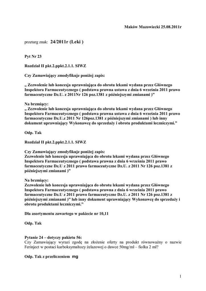 Maków Mazowiecki 25.08.2011r przetarg znak: 24/2011r (Leki ) Pyt Nr 23 Rozdział II pkt.2.ppkt.2.1.1. SIWZ Czy Zamawiający zmodyfikuje poniżej zapis: „ Zezwolenie lub koncesja uprawniająca do obrotu lekami wydana przez Głównego Inspektora Farmaceutycznego ( podstawa prawna ustawa z dnia 6 września 2011 prawo farmaceutyczne Dz.U. z 2011Nr 126 poz.1381 z późniejszymi zmianami )” Na brzmiący: „ Zezwolenie lub koncesja uprawniająca do obrotu lekami wydana przez Głównego Inspektora Farmaceutycznego ( podstawa prawna ustawa z dnia 6 września 2011 prawo farmaceutyczne Dz.U.z 2011 Nr 126poz.1381 z późniejszymi zmianami ) lub inny dokument uprawniający Wykonawcę do sprzedaży i obrotu produktami leczniczymi.” Odp. Tak Rozdział II pkt.2.ppkt.2.1.1. SIWZ Czy Zamawiający zmodyfikuje poniżej zapis: Zezwolenie lub koncesja uprawniająca do obrotu lekami wydana przez Głównego Inspektora Farmaceutycznego ( podstawa prawna z dnia 6 września 2011 prawo farmaceutyczne Dz.U z 2011 prawo farmaceutyczne Dz.U. z 2011 Nr 126 poz.1381 z późniejszymi zmianami )” Na brzmiący: Zezwolenie lub koncesja uprawniająca do obrotu lekami wydana przez Głównego Inspektora Farmaceutycznego ( podstawa prawna z dnia 6 września 2011 prawo farmaceutyczne Dz.U z 2011 prawo farmaceutyczne Dz.U. z 2011 Nr 126 poz.1381 z późniejszymi zmianami )” lub inny dokument uprawniający Wykonawcę do sprzedaży i obrotu produktami leczniczymi.” Dla asortymentu zawartego w pakiecie nr 10,11 Odp. Tak Pytanie 24 – dotyczy pakietu 56: Czy Zamawiający wyrazi zgodę na złożenie oferty na produkt równoważny o nazwie Ferinject w postaci karboksymaltozy żelazowej o dawce 50mg/ml – fiolka 2 ml? Odp. Tak z przeliczeniem mg 1 Pytanie 25 – dotyczy pakietu 74: Czy Zamawiający wyrazi zgodę na wycenę w poz. 2 leku w dawce 0,48 mg/0,8 ml? Odp. Tak Pytanie 26 – dotyczy pakietu 25: Czy Zamawiający wymaga, aby wykonawcy przedstawili oświadczenie producenta dotyczące gwarancji ciągłości dostaw Albuminy ludzkiej przez cały okres obowiązywania umowy? Odp. Nie Pytanie 27 Prosimy o wyjaśnienie, czy wadium w formie innej niż pieniężna należy złożyć w Dziale Księgowości Zamawiającego – pokój nr 346 do godz. 9.00 czy tak jak ofertę do godz. 10.00? Odp. Tak Pytanie 28 Czy w przypadku, jeżeli żądany przez zamawiającego lek nie jest już produkowany lub jest tymczasowy brak produkcji, a nie ma innego leku równoważnego, którym można by było go zastąpić należy wycenić ten lek podając ostatnią cenę sprzedaży oraz uwagę o jego braku czy nie wyceniać go wcale? Odp. Podać ostatnią cenę sprzedaży oraz uwagę o jego braku Pytanie 29 Czy można wycenić lek równoważny pod względem składu chemicznego i dawki lecz różniącego się postacią, przy zachowaniu tej samej drogi podania np. wymagana w SIWZ tabletka a równoważnik ma postać drażetki, kapsułki, tabletki powlekanej, tabletki dojelitowej oraz ampułkę za fiolkę, fiolkę za ampułko-strzykawkę i odwrotnie ? Odp. Tak -tabletka a równoważnik ma postać drażetki, kapsułki, tabletki powlekanej, tabletki dojelitowej oraz ampułkę za fiolkę oraz ampułko - strzykawkę na fiolkę. Pytanie 30 Prosimy o podanie w jaki sposób prawidłowo przeliczyć ilość opakowań handlowych w przypadku występowania na rynku opakowań posiadających inną ilość sztuk (tabletek, ampułek, kilogramów) niż umieszczone w SIWZ (czy podawać pełne ilości opakowań zaokrąglone w górę, czy ilość opakowań przeliczyć do dwóch miejsc po przecinku)? Odp. Podać pełne ilości opakowań zaokrągloną w górę do dwóch miejsc po przecinku. Pytania 31 1. Prosimy o podanie, w jaki sposób prawidłowo przeliczyć ilość opakowań handlowych w przypadku występowania na rynku opakowań posiadających inną ilość sztuk (tabletek, ampułek, kilogramów itp.), niż zamieszczona w SIWZ; a także w przypadku, gdy wycena innych opakowań leków spełniających właściwości terapeutyczne jest korzystniejsza pod względem ekonomicznym (czy podać pełne ilości opakowań zaokrąglone w górę, czy ilość opakowań przeliczyć do dwóch miejsc po przecinku)? Odp. Podać pełne ilości opakowań zaokrągloną w górę do dwóch miejsc po przecinku. 2 Pyt Nr 32 Czy Zamawiający wyrazi zgodę na zmianę postaci proponowanych preparatów – tabletki na tabletki powlekane lub kapsułki lub drażetki i odwrotnie, fiolki na ampułki lub ampułko-strzykawki i odwrotnie? Odp. Tak -tabletka a równoważnik ma postać drażetki, kapsułki, tabletki powlekanej, tabletki dojelitowej oraz ampułkę za fiolkę oraz ampułko - strzykawkę na fiolkę. Pyt Nr 33 Czy można wycenić lek równoważny pod względem składu chemicznego i dawki lecz różniący się postacią (tabletki na tabletki powlekane lub kapsułki lub drażetki i odwrotnie fiolki na ampułki i odwrotnie) przy zachowaniu tej samej drogi podania? Odp. Tabletki na tabletki powlekane lub kapsułki lub drażetki Pyt Nr 34 Pakiet nr 1,poz.14 -czy Zamawiający wyrazi zgodę na wycenę leku równoważnego o nazwie Clogrel 75 mg *28 tabl? Odp. Tak Pyt Nr 35 Pakiet nr 1,poz.18 -czy Zamawiający wyrazi zgodę na wycenę leku równoważnego o nazwie Vertigen 16 mg*60 tabl. w ilości 4 op.? Odp. Tak Pyt Nr 36 Pakiet nr 1,poz.45 -czy Zamawiający wyrazi zgodę na wycenę leku równoważnego o nazwie Biostreptaza *6 czop.? Odp. Tak Pyt Nr 37 Pakiet nr 1,poz.69 -czy Zamawiający wyrazi zgodę na wycenę leku w opakowaniu *60 tabl. Odp. Tak Pyt Nr 38 Pakiet nr 1,poz.74 -czy Zamawiający wyrazi zgodę na wycenę leku w opakowaniu *90tabl.? Odp. Tak Pyt Nr 39 Pakiet nr 1,poz.91-czy Zamawiający wyrazi zgodę na wycenę leku równoważnego o nazwie Nicergolin 10 mg*30 tabl? Odp. Tak Pyt Nr 40 Pakiet nr 1,poz.94 czy Zmawiający wyrazi zgodę na wycenę leku równoważnego o nazwie Norsept 0,4 mg*20 tabl? Odp. Tak 3 Pyt Nr 41 Pakiet nr 1,poz.105-koniec produkcji, czy Zamawiający wyrazi zgodę na wy