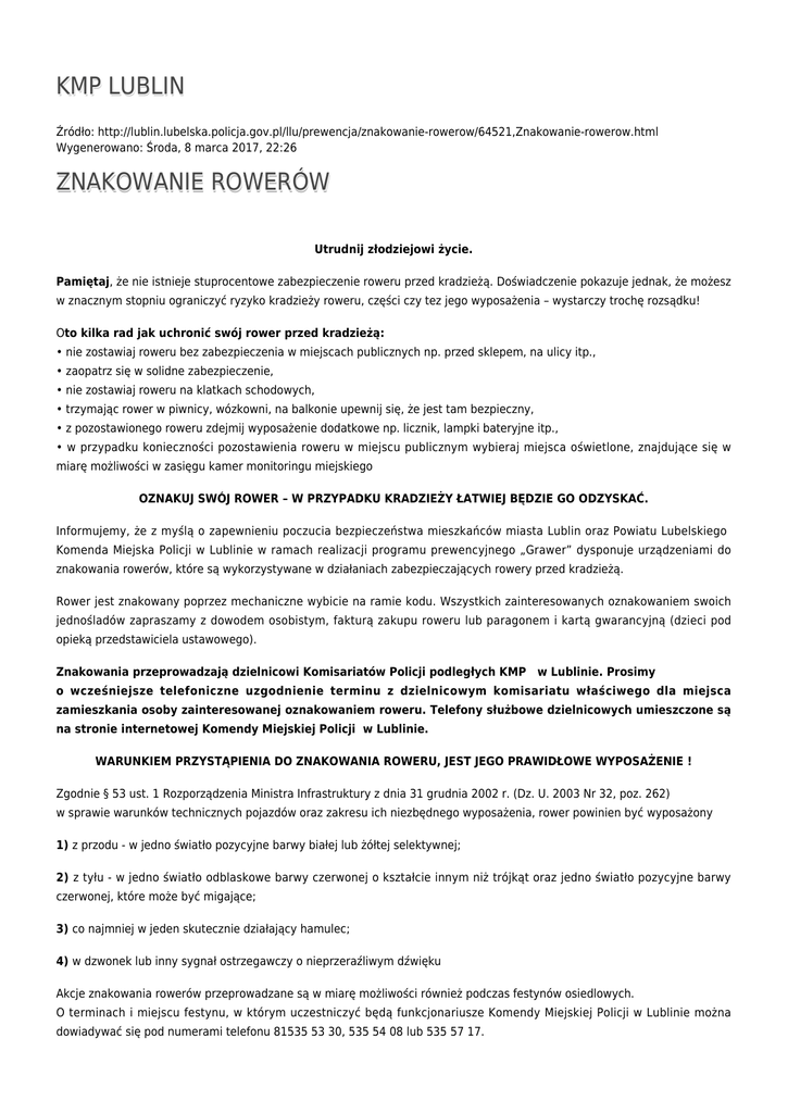 KMP LUBLIN Źródło: http://lublin.lubelska.policja.gov.pl/llu/prewencja/znakowanie-rowerow/64521,Znakowanie-rowerow.html Wygenerowano: Środa, 8 marca 2017, 22:26 ZNAKOWANIE ROWERÓW Utrudnij złodziejowi życie. Pamiętaj, że nie istnieje stuprocentowe zabezpieczenie roweru przed kradzieżą. Doświadczenie pokazuje jednak, że możesz w znacznym stopniu ograniczyć ryzyko kradzieży roweru, części czy tez jego wyposażenia – wystarczy trochę rozsądku! Oto kilka rad jak uchronić swój rower przed kradzieżą: • nie zostawiaj roweru bez zabezpieczenia w miejscach publicznych np. przed sklepem, na ulicy itp., • zaopatrz się w solidne zabezpieczenie, • nie zostawiaj roweru na klatkach schodowych, • trzymając rower w piwnicy, wózkowni, na balkonie upewnij się, że jest tam bezpieczny, • z pozostawionego roweru zdejmij wyposażenie dodatkowe np. licznik, lampki bateryjne itp., • w przypadku konieczności pozostawienia roweru w miejscu publicznym wybieraj miejsca oświetlone, znajdujące się w miarę możliwości w zasięgu kamer monitoringu miejskiego OZNAKUJ SWÓJ ROWER – W PRZYPADKU KRADZIEŻY ŁATWIEJ BĘDZIE GO ODZYSKAĆ. Informujemy, że z myślą o zapewnieniu poczucia bezpieczeństwa mieszkańców miasta Lublin oraz Powiatu Lubelskiego Komenda Miejska Policji w Lublinie w ramach realizacji programu prewencyjnego „Grawer” dysponuje urządzeniami do znakowania rowerów, które są wykorzystywane w działaniach zabezpieczających rowery przed kradzieżą. Rower jest znakowany poprzez mechaniczne wybicie na ramie kodu. Wszystkich zainteresowanych oznakowaniem swoich jednośladów zapraszamy z dowodem osobistym, fakturą zakupu roweru lub paragonem i kartą gwarancyjną (dzieci pod opieką przedstawiciela ustawowego). Znakowania przeprowadzają dzielnicowi Komisariatów Policji podległych KMP w Lublinie. Prosimy o wcześniejsze telefoniczne uzgodnienie terminu z dzielnicowym komisariatu właściwego dla miejsca zamieszkania osoby zainteresowanej oznakowaniem roweru. Telefony służbowe dzielnicowych umieszczone są na stronie internetowej Komendy Miejskiej Policji w Lublinie. WARUNKIEM PRZYSTĄPIENIA DO ZNAKOWANIA ROWERU, JEST JEGO PRAWIDŁOWE WYPOSAŻENIE ! Zgodnie § 53 ust. 1 Rozporządzenia Ministra Infrastruktury z dnia 31 grudnia 2002 r. (Dz. U. 2003 Nr 32, poz. 262) w sprawie warunków technicznych pojazdów oraz zakresu ich niezbędnego wyposażenia, rower powinien być wyposażony 1) z przodu - w jedno światło pozycyjne barwy białej lub żółtej selektywnej; 2) z tyłu - w jedno światło odblaskowe barwy czerwonej o kształcie innym niż trójkąt oraz jedno światło pozycyjne barwy czerwonej, które może być migające; 3) co najmniej w jeden skutecznie działający hamulec; 4) w dzwonek lub inny sygnał ostrzegawczy o nieprzeraźliwym dźwięku Akcje znakowania rowerów przeprowadzane są w miarę możliwości również podczas festynów osiedlowych. O terminach i miejscu festynu, w którym uczestniczyć będą funkcjonariusze Komendy Miejskiej Policji w Lublinie można dowiadywać się pod numerami telefonu 81535 53 30, 535 54 08 lub 535 57 17. Serdecznie zapraszamy. Ocena: 0/5 (0) Tweetnij