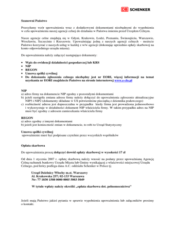 Szanowni Państwo Przesyłamy wzór upowaŜnienia wraz z dodatkowymi dokumentami niezbędnymi do wypełnienia w celu upowaŜnienia naszej agencji celnej do działania w Państwa imieniu przed Urzędem Celnym. Nasze agencje celne znajdują się w Gdyni, Krakowie, Łodzi, Poznaniu, Świnoujściu, Warszawie, Wrocławiu, Szczecinie i Rzeszowie. UpowaŜniając jedną z naszych agencji celnych - moŜecie Państwo korzystać z naszych usług w kaŜdej z w/w agencji (dokonując uprzednio opłaty skarbowej na konto odpowiedniego urzędu miasta). Do upowaŜnienia naleŜy załączyć następujące dokumenty: • • • • • Wpis do ewidencji działalności gospodarczej lub KRS NIP REGON Umowa spółki cywilnej Do dokonania zgłoszenia celnego niezbędny jest nr EORI, więcej informacji na temat uzyskania nr EORI znajdziecie Państwo na stronie internetowej www.e-clo.pl NIP a) adres firmy na dokumencie NIP zgodny z pozostałymi dokumentami b) jeŜeli nastąpiła zmiana adresu firmy naleŜy dołączyć do upowaŜnienia zgłoszenie aktualizacyjne NIP5 i NIP2 (dokumenty składane w US potwierdzone pieczątką z dziennika podawczego) c) rozbieŜność adresu jest dopuszczalna w przypadku kiedy firma jest prowadzona jednoosobowo i wykorzystuje w działalności dokument NIP właściciela firmy. W takim przypadku adres na NIP musi być zgodny z adresem zamieszkania właściciela firmy REGON a) adres zgodny z innymi dokumentami b) jeŜeli jest konieczność zmian w dokumencie, to robi to Urząd Statystyczny Umowa spółki cywilnej upowaŜnienie musi być podpisane czytelnie przez wszystkich wspólników Opłata skarbowa Do upowaŜnienia proszę dołączyć dowód opłaty skarbowej w wysokości 17 zł Od dnia 1 stycznia 2007 r. opłatę skarbową naleŜy wnosić na podany przez upowaŜnianą Agencję Celną rachunek bankowy Urzędu Miasta lub Gminy wynikającej z właściwości miejscowej Urzędu Celnego, pod który podlega dana A.C. oddziału Schenker w Polsce tj; Urząd Dzielnicy Włochy m.st. Warszawy Al. Krakowska 257; 02-133 Warszawa Nr: 77 1030 1508 0000 0005 5003 5049 W tytule wpłaty naleŜy określić „opłata skarbowa dot. pełnomocnictwa” JeŜeli mają Państwo jakieś pytania w sprawie wypełnienia upowaŜnienia lub załączników prosimy o kontakt. .................................................. dnia .............................. ( miejscowość ) UPOWAśNIENIE do działania w formie przedstawicielstwa pośredniego UpowaŜniam: Schenker Sp.z o.o. ul. J. K. Ordona 2a, 01-237 Warszawa PL 5270103824 NIP do podejmowania na rzecz: REGON 010500539 ...................................................................................................................................................... ...................................................................................................................................................... ...................................................................................................................................................... ( nazwa i siedziba osoby udzielającej upowaŜnienia ) następujących czynności związanych z dokonywaniem obrotu towarowego z zagranicą: 1) badania towarów i pobierania ich próbek przed dokonaniem zgłoszenia celnego 2) przygotowywania niezbędnych dokumentów i dokonywania zgłoszenia celnego 3) uiszczania naleŜności celnych przywozowych lub celnych wywozowych oraz innych opłat 4) podejmowania towarów po ich zwolnieniu 5) składania zabezpieczenia kwoty wynikającej z długu celnego 6) wnoszenia odwołania i innych wniosków podlegających rozpatrzeniu przez organy celne 7) przedstawiania i do podpisywania dokumentów do wystawiania świadectw EUR1, świadectw pochodzenia 8) udzielania dalszego upowaŜnienia zgodnie z art.77 ustawy Prawo Celne Dz.U. nr 68/2004 UpowaŜnienie obejmuje swym zakresem uprawnienie do działania Schenker sp. z o.o. poprzez wszystkich agentów celnych zatrudnionych w Schenker Sp. z o.o. bez względu na rotacje kadrowe. Niniejsze upowaŜnienie ma charakter:* stały terminowy do dnia ............................... jednorazowy *niepotrzebne skreślić ........................................................................ (imię i nazwisko oraz podpis upowaŜniającego zgodnie z wpisem do KRS lub zaświadczeniem o w.d.e.d.g) Potwierdzenie przyjęcia upowaŜnienia: ................................................................. data i podpis agenta celnego działającego w imieniu agencji celnej ZAŁĄCZNIK DO UPOWAśNIENIA 1. W przypadku ograniczenia upowaŜnienia wyłącznie do wybranych czynności wynikających, bądź to z zakresu działania agencji celnej albo teŜ z woli upowaŜniającego, naleŜy wykreślić czynności, których nie obejmuje niniejsze upowaŜnienie. Odpowiednie wykreślenie naleŜy zaparafować. 2. O cofnięciu niniejszego upowaŜnienia mocodawca zobowiązuje się niezwłocznie powiadomić właściwe organy administracji celnej oraz Schenker Sp. z o.o.. W przeciwnym przypadku agencja celna będzie nadal skutecznie działać w imieniu i na rzecz mocodawcy. 3. Mocodawca niniejszego upowaŜnienia oświadcza ponadto, Ŝe bierze na siebie odpowiedzialność za: a) rzetelność tłumaczenia faktury na język polski b) faktyczną zgodność towaru z dokumentami co do ilości, wagi, rodzaju i wartości c) dotrzymanie terminów ustanowionych w toku postępowania 4. Mocodawca upowaŜnia Schenker Sp. z o.o. do wystawiania faktur VAT bez podpisu odbiorcy. 5. Mocodawca upowaŜnia wszystkich pracowników agencji celnej Schenker Sp. z o.o. do odbioru dokumentów celnych z Urzędu Celnego oraz odsyłania tych dokumentów pocztą listem poleconym. 6. Do upowaŜnienia naleŜy dołączyć poświadczone kopie dokumentów załoŜycielskich firmy: • KRS lub zaświadczenie o wpisie do ewidencji działalności gospodarczej (dokument ten nie moŜe być starszy niŜ 3 miesiące) • Zaświadczenie o nadaniu numeru statystycznego REGON • Zaświadczenie o nadaniu nu