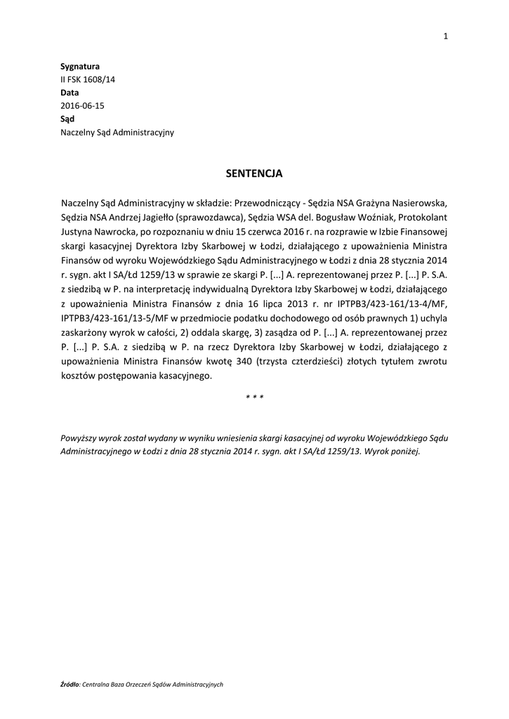 P. [...] P. S.A. z siedzibą w P. na rzecz Dyrektora Izby Skarbowej w Łodzi, działającego z