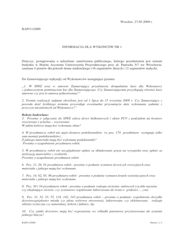 Wrocław, 27.05.2009 r. RAP/11/2009 INFORMACJA DLA WYKONCÓW NR 1 Dotyczy: post powania o udzielenie zamówienia publicznego, którego przedmiotem jest remont budynku w Hotelu Asystenta Uniwersytetu Przyrodniczego przy ul. Pautscha 5/7 we Wrocławiu: zamiana 4 pionów dla potrzeb domu studenckiego (16 segmentów du ych i 12 segmentów małych). Do Zamawiaj cego wpłyn ły od Wykonawców nast puj ce pytania: „1. W SIWZ oraz w umowie Zamawiaj cy przedstawia skrupulatnie kary dla Wykonawcy z jednoczesnym pomini ciem kar dla Zamawiaj cego. Czy Zamawiaj cemu przysługuj równie kary umowne czy jest to umowa jednostronna?” 2. Termin realizacji zadania okre lony jest od 1 lipca do 15 wrze nia 2009 r. Czy Zamawiaj cy z powodu do krótkiego terminu przewiduje ewentualne przesuni cie daty wykonania zadania z przyczyn niezale nych od Wykonawcy?” Roboty budowlane: 3. Prosimy o zał czenie do SIWZ szkicu drzwi balkonowych i okien PCV z podziałem na kwatery rozwierane i uchylno – rozwierane. W jakim kolorze maj by wykonane okna? 4. W przedmiarze robót nie uj to dostawy podokienników (w poz. 174 przedmiaru wyst puje tylko sam monta podokienników) . Z jakiego materiału maj by wykonane podokienniki? Prosimy o uzupełnienie przedmiaru robót. 5. W przedmiarze robót nie uwzgl dniono opłaty za składowanie gruzu na wysypisku oraz opłaty za utylizacj materiałów z rozbiórki. Prosimy o uzupełnienie przedmiaru robót. 6. Poz. 11, 20, 91 przedmiaru robót - prosimy o podanie wymiaru drzwiczek rewizyjnych oraz materiału z jakiego maj by wykonane. 7. Poz. 14, 62, 85, 86 przedmiaru robót - prosimy o podanie wymiaru kratek wentylacyjnych oraz materiału z jakiego maj by wykonane. 8. Poz. 30 i 54 przedmiaru robót - prosimy o podanie rodzaju o cie nic stalowych (zwykłe naro ne czy obejmuj ce o cie e; czy systemowe regulowane lakierowane do cian o grubo ci ….cm). 9. Poz. 31, 32, 33, 55, 114, 142, 143 przedmiaru robót – prosimy o podanie: wypełnienia skrzydła drzwiowego(plaster miodu czy płyta wiórowa otworowa), lakierowane czy okleinowane, rodzaju okleiny (sztuczna czy naturalna), koloru i faktury, itp. 10. Czy zamki drzwiowe maj by wyposa one we wkładki patentowe przystosowane do systemu jednego klucza? RAP/11/2009 Strona 1 z 3 11. Prosimy o rozwa enie zastosowania odboi drzwiowych. 12. W przedmiarze robót nie uwzgl dniono gruntowania cian i sufitów np. Uni-Gruntem pod malowanie farbami emulsyjnymi i lateksowymi. 13. W poz. 49 przedmiaru robót maj by zamontowane nowe karnisze czy z demonta u? Je eli nowe to prosimy o okre lenie rodzaju, materiału itp. 14. Jakiego rodzaju maj by klamki z szyldami, lakierowane czy metalowe oksydowane? 15. Poz. 68 i 120 przedmiaru robót – jakiego rodzaju nale y zastosowa listwy przy cienne z tworzyw sztucznych (listwy z profili PCV czy inne)? 16. Poz. 113 i 141 przedmiaru robót – o cie nice drzwiowe drewniane maj by systemowe wyko czone fabrycznie z opaskami (regulowane czy zwykłe obejmuj ce na gr. ciany …. cm), czy tradycyjne malowane na budowie? 17. W przedmiarze robót nie uwzgl dniono zabezpieczenia podłóg foli przed robotami malarskimi. Prosimy o uzupełnienie przedmiaru robót. 18. Prosimy o zmian klasy cieralno ci płytek posadzkowych z 3 na 4. Opisana w specyfikacji technicznej klasa cieralno ci min. 3 jest za niska do zastosowania w obiektach jak domy studenckie. Odpowiedzi: Ad.1. W § 11 wzoru umowy stanowi cego zał cznik nr 5 do SIWZ po ust pie 2 wprowadza si ust p 2a w brzmieniu: „ 2a. Zamawiaj cy zapłaci Wykonawcy kar umown w wysoko ci 20 % wynagrodzenia umownego brutto w przypadku odst pienia od umowy z przyczyn nie le cych po stronie Wykonawcy, z wyj tkiem okoliczno ci o których mowa w art. 145 ust 1 ustawy Prawo zamówie publicznych”. Ponadto w § 11 ust 2 umowy po słowach „wynagrodzenia umownego” dodaje si słowo „brutto”. Ad.2.Kwesti ewentualnej zmiany terminu wykonania robót budowlanych b d cych przedmiotem niniejszego post powania zamawiaj cy uregulował w rozdziale XI SIWZ ust 14 lit. od „a” do „c”. Ad. 3. Podziały okien nale y wykona analogicznie jak w oknach istniej cych, w oknach dwuskrzydłowych jedno skrzydło rozwierno-uchylne, drugie rozwierne. Drzwi balkonowe z na wietlem, skrzydło rozwierno-uchylne. Okna maj by wykonane w kolorze białym. Ad. 4. Podokienniki białe z PCV. Nale y uzupełni poz. 174 przedmiaru o adnotacj „analogia” oraz korygowa materiały o „podokiennik biały z PCV wraz z boczkami” Ad.5 Nale y uzupełni przedmiar o pozycje: 10 a ( obmiar jak w poz. 10), 52a ( obmiar jak w poz. 52), 83a, obmiar jak w poz. 83), 111a ( obmiar jak w poz. 111) oraz 135 a( obmiar jak w poz. 135) – kalk. własna - Opłata za przyj cie na wysypisko i utylizacj materiałów z rozbiórki. Ad.6. Drzwiczki rewizyjne nale y wykona ze stali malowanej na kolor biały. Wymiary: 20 x 25 cm lub dopasowane do wymiarów kafli ciennych. Ad. 7 Kratki wentylacyjne z tworzywa sztucznego, białe 14 x 21 cm RAP/11/2009 Strona 2 z 3 Ad. 8. O cie nice stalowe k towe, z uszczelk , ze stali ocynkowanej i malowanej proszkowo na kolor uzgodniony z U ytkownikiem. Ad. 9. Skrzydła drzwiowe płytowe, gładkie, okleina np. CPL gr. 0,7 mm, wypełnienie płyta otworowa, kolorystyka do uzgodnienia z U ytkownikiem. odpowiednio przeszklone i pełne. Ad. 10 Zamki drzwiowe maj by wyposa one we wkładki przystosowane do systemu jednego klucza Ad. 11 Zamawiaj cy nie przewiduje instalowania odboi drzwiowych w czasie wykonywania robót obj tych przetargiem. Ad. 12. W zakresie prac w pozycji KSNR 2 1302-04 uj te jest gruntowanie pod malowanie wykonane farb emulsyjn , dopuszcza si zamian na gruntowanie preparatem gruntuj cym np. Uni-Gruntem bez zmiany podstawy wyceny. Ad. 13. W poz. 49 nale y uj monta karniszy z demonta u lub dostarczonych przez U ytkownika ( nie ujmowa kosztu materiału w pozycji). Ad. 14. Nale y wyceni klamki lakierowane. Ad. 15. Nale y wyceni cokolik z wykładziny PCV wywijany na cian Ad. 16. Nale y zm