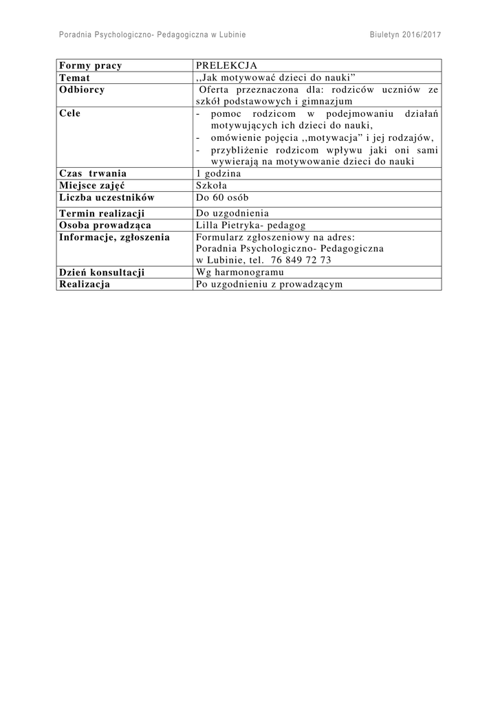 Poradnia Psychologiczno- Pedagogiczna w Lubinie Formy pracy Temat Odbiorcy Cele Czas trwania Miejsce zajęć Liczba uczestników Termin realizacji Osoba prowadząca Informacje, zgłoszenia Dzień konsultacji Realizacja Biuletyn 2016/2017 PRELEKCJA ,,Jak motywować dzieci do nauki” Oferta przeznaczona dla: rodziców uczniów ze szkół podstawowych i gimnazjum - pomoc rodzicom w podejmowaniu działań motywujących ich dzieci do nauki, - omówienie pojęcia ,,motywacja” i jej rodzajów, - przybliżenie rodzicom wpływu jaki oni sami wywierają na motywowanie dzieci do nauki 1 godzina Szkoła Do 60 osób Do uzgodnienia Lilla Pietryka- pedagog Formularz zgłoszeniowy na adres: Poradnia Psychologiczno- Pedagogiczna w Lubinie, tel. 76 849 72 73 Wg harmonogramu Po uzgodnieniu z prowadzącym