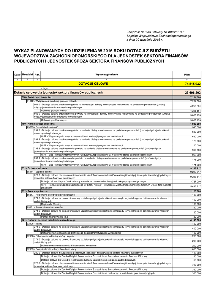 Załącznik Nr 3 do uchwały Nr XIV/262 /16 Sejmiku Województwa Zachodniopomorskiego z dnia 20 września 2016 r. WYKAZ PLANOWANYCH DO UDZIELENIA W 2016 ROKU DOTACJI Z BUDŻETU WOJEWÓDZTWA ZACHODNIOPOMORSKIEGO DLA JEDNOSTEK SEKTORA FINANSÓW PUBLICZNYCH I JEDNOSTEK SPOZA SEKTORA FINANSÓW PUBLICZNYCH Dział Rozdział Par. Wyszczególnienie 2 4 1 3 DOTACJE CELOWE Plan 5 74 515 932 z tego: Dotacje celowe dla jednostek sektora finansów publicznych 010 - Rolnictwo i łowiectwo 01042 - Wyłączenie z produkcji gruntów rolnych 661 0 - Dotacje celowe przekazane gminie na inwestycje i zakupy inwestycyjne realizowane na podstawie porozumień (umów) między jednostkami samorządu terytorialnego Ochrona gruntów rolnych 662 0 - Dotacje celowe przekazane dla powiatu na inwestycje i zakupy inwestycyjne realizowane na podstawie porozumień (umów) między jednostkami samorządu terytorialnego Ochrona gruntów rolnych 23 696 202 7 264 000 7 264 000 4 255 861 4 255 861 3 008 139 3 008 139 750 - Administracja publiczna 75095 - Pozostała działalność 231 8 - Dotacje celowe przekazane gminie na zadania bieżące realizowane na podstawie porozumień (umów) między jednostkami samorządu terytorialnego WPF - Wsparcie gmin w opracowaniu albo aktualizacji programów rewitalizacji 231 9 - Dotacje celowe przekazane gminie na zadania bieżące realizowane na podstawie porozumień (umów) między jednostkami samorządu terytorialnego WPF - Wsparcie gmin w opracowaniu albo aktualizacji programów rewitalizacji 232 8 - Dotacje celowe przekazane dla powiatu na zadania bieżące realizowane na podstawie porozumień (umów) między jednostkami samorządu terytorialnego WPF - Sieć Punktów Informacyjnych Funduszy Europejskich (PIFE) w Województwie Zachodniopomorskim 232 9 - Dotacje celowe przekazane dla powiatu na zadania bieżące realizowane na podstawie porozumień (umów) między jednostkami samorządu terytorialnego 1 940 000 1 940 000 WPF - Sieć Punktów Informacyjnych Funduszy Europejskich (PIFE) w Województwie Zachodniopomorskim 851 - Ochrona zdrowia 171 000 9 223 817 9 223 817 85111 - Szpitale ogólne 622 0 - Dotacje celowe z budżetu na finansowanie lub dofinansowanie kosztów realizacji inwestycji i zakupów inwestycyjnych innych jednostek sektora finansów publicznych Dotacje celowe dla placówek ochrony zdrowia na prace modernizacyjne i zakup sprzętu medycznego WPF - Rozbudowa Szpitala Dziecięcego SPSZOZ "Zdroje" - utworzenie Zachodniopomorskiego Centrum Opieki Nad Kobietą i Dzieckiem 852 - Pomoc społeczna 85217 - Regionalne ośrodki polityki społecznej 271 0 - Dotacja celowa na pomoc finansową udzielaną między jednostkami samorządu terytorialnego na dofinansowanie własnych zadań bieżących Region dla Rodziny 85231 - Pomoc dla cudzoziemców 271 0 - Dotacja celowa na pomoc finansową udzielaną między jednostkami samorządu terytorialnego na dofinansowanie własnych zadań bieżących Pomoc finansowa dla j.s.t 921 - Kultura i ochrona dziedzictwa narodowego 680 000 680 000 120 000 120 000 969 000 969 000 171 000 9 223 817 3 727 000 5 496 817 120 000 100 000 100 000 100 000 20 000 20 000 20 000 4 148 385 92106 - Teatry 271 0 - Dotacja celowa na pomoc finansową udzielaną między jednostkami samorządu terytorialnego na dofinansowanie własnych zadań bieżących Dofinansowanie działalności Bałtyckiego Teatru Dramatycznego w Koszalinie 92108 - Filharmonie, orkiestry, chóry i kapele 271 0 - Dotacja celowa na pomoc finansową udzielaną między jednostkami samorządu terytorialnego na dofinansowanie własnych zadań bieżących Dofinansowanie działalności Filharmonii w Koszalinie 400 000 92109 - Domy i ośrodki kultury, świetlice i kluby 820 000 280 0 - Dotacja celowa z budżetu dla pozostałych jednostek zaliczanych do sektora finansów publicznych Dotacja celowa dla Zamku Książąt Pomorskich w Szczecinie na Zachodniopomorski Fundusz Filmowy Dotacje celowe dla Ośrodka Teatralnego Kana w Szczecinie na realizację zadań bieżących 622 0 - Dotacje celowe z budżetu na finansowanie lub dofinansowanie kosztów realizacji inwestycji i zakupów inwestycyjnych innych jednostek sektora finansów publicznych Dotacja celowa dla Zamku Książąt Pomorskich w Szczecinie na Zachodniopomorski Fundusz Filmowy Dotacje celowe dla Zamku Książąt Pomorskich w Szczecinie na realizację zadań lub zakupów inwestycyjnych 400 000 400 000 200 000 200 000 200 000 110 000 50 000 60 000 710 000 350 000 360 000 Dział Rozdział Par. Wyszczególnienie Plan 2 4 5 1 3 92116 - Biblioteki 280 0 - Dotacja celowa z budżetu dla pozostałych jednostek zaliczanych do sektora finansów publicznych Dotacje celowe dla Książnicy Pomorskiej w Szczecinie na realizację zadań bieżących 92118 - Muzea 280 0 - Dotacja celowa z budżetu dla pozostałych jednostek zaliczanych do sektora finansów publicznych Dotacje celowe dla Muzeum Narodowego w Szczecinie na realizację zadań bieżących 622 0 - Dotacje celowe z budżetu na finansowanie lub dofinansowanie kosztów realizacji inwestycji i zakupów inwestycyjnych innych jednostek sektora finansów publicznych WPF - Budowa Centrum Nauki w Szczecinie Dotacje celowe dla Muzeum Narodowego w Szczecinie na realizację zadań lub zakupów inwestycyjnych 92120 - Ochrona zabytków i opieka nad zabytkami 273 0 - Dotacje celowe z budżetu na finansowanie lub dofinansowanie prac remontowych i konserwatorskich obiektów zabytkowych, przekazane jednostkom zaliczanym do sektora finansów publicznych Dotacje celowe na dofinansowanie prac remont. i konserw. obiektów zabytkowych 926 - Kultura fizyczna 92695 - Pozostała działalność 271 0 - Dotacja celowa na pomoc finansową udzielaną między jednostkami samorządu terytorialnego na dofinansowanie własnych zadań bieżących Pomoc finansowa dla j.s.t. województwa zachodniopomorskiego na poprawę stanu infrastruktury sportowej 630 0 - Dotacja celowa na pomoc finansową udzielaną między jednostkami samorządu terytorialnego na