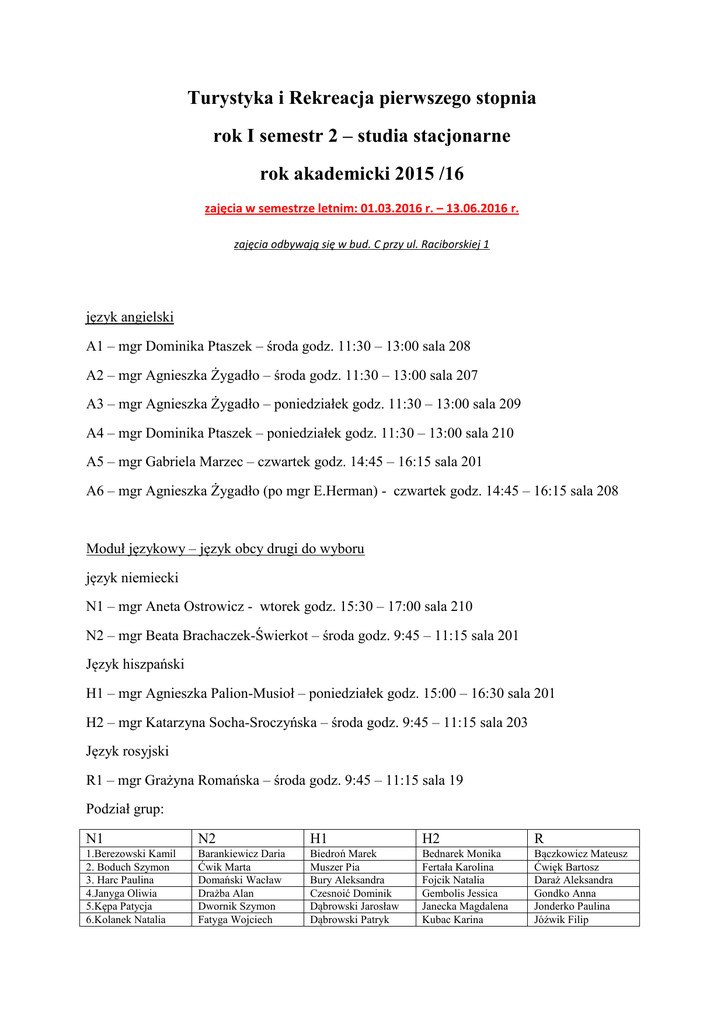 Turystyka i Rekreacja pierwszego stopnia rok I semestr 2 – studia stacjonarne rok akademicki 2015 /16 zajęcia w semestrze letnim: 01.03.2016 r. – 13.06.2016 r. zajęcia odbywają się w bud. C przy ul. Raciborskiej 1 język angielski A1 – mgr Dominika Ptaszek – środa godz. 11:30 – 13:00 sala 208 A2 – mgr Agnieszka Żygadło – środa godz. 11:30 – 13:00 sala 207 A3 – mgr Agnieszka Żygadło – poniedziałek godz. 11:30 – 13:00 sala 209 A4 – mgr Dominika Ptaszek – poniedziałek godz. 11:30 – 13:00 sala 210 A5 – mgr Gabriela Marzec – czwartek godz. 14:45 – 16:15 sala 201 A6 – mgr Agnieszka Żygadło (po mgr E.Herman) - czwartek godz. 14:45 – 16:15 sala 208 Moduł językowy – język obcy drugi do wyboru język niemiecki N1 – mgr Aneta Ostrowicz - wtorek godz. 15:30 – 17:00 sala 210 N2 – mgr Beata Brachaczek-Świerkot – środa godz. 9:45 – 11:15 sala 201 Język hiszpański H1 – mgr Agnieszka Palion-Musioł – poniedziałek godz. 15:00 – 16:30 sala 201 H2 – mgr Katarzyna Socha-Sroczyńska – środa godz. 9:45 – 11:15 sala 203 Język rosyjski R1 – mgr Grażyna Romańska – środa godz. 9:45 – 11:15 sala 19 Podział grup: N1 N2 H1 H2 R 1.Berezowski Kamil 2. Boduch Szymon 3. Harc Paulina 4.Janyga Oliwia 5.Kępa Patycja 6.Kolanek Natalia Barankiewicz Daria Ćwik Marta Domański Wacław Drażba Alan Dwornik Szymon Fatyga Wojciech Biedroń Marek Muszer Pia Bury Aleksandra Czesnoić Dominik Dąbrowski Jarosław Dąbrowski Patryk Bednarek Monika Fertała Karolina Fojcik Natalia Gembolis Jessica Janecka Magdalena Kubac Karina Bączkowicz Mateusz Ćwięk Bartosz Daraż Aleksandra Gondko Anna Jonderko Paulina Jóźwik Filip 7.Kretek Natalia 8.Laska Damian 9.Leś Amanda 10.Majewski Szymon 11.Maroszek Agata 12.Morańska Sylwia 13.Nowakowska Anna 14.Ochman Justyna 15.Ostakiewicz Marcin 16.Pawłowska Anna 17.Placek Martin 18.Rygol Paulina 19.Skowrońska Agnieszka 20.Skwarło Kacper 21.Steinmann Lucyna 22.Stępień Sebastian 23.Szczygoł Anna 24.Ślepacka Konstancja 25.Wlach Magdalena 26. Zimończyk Kamil 27. 28. 29. Gałuszka Klaudia Iwaszkiewicz Dominik Jasiulewicz Wojciech Leszczak Armanda Deska Michał Mątkowska Karolina Kupczyk Nikola Wlaźlak Kuba Juzof Sebastian Kamiński Tomasz Flasz Monika Herbeć Marta Mazur Adrian Debińska Natalia Latkowska Karolina Losa Sabina Łukasiak Robert Jankowiak Anna Wójcik Monika Konopek Dagmara Pietrzak Patrycja Płaza Karolina Kasza Wojciech Kaźmierczak Dominika Kolasiński Mateusz Koteja Barbara Krosta Roksana Mirutko Kaja Orawiec Edyta Kontny Aneta Lewicka Karolina Przepiórska Barbara Budniok Marina Kwaśny Dawid Matyja Anna Palewicz Jakub Perenc Dorota Piórek Radosław Macion Sonia Mulczyk Ewa Ogonek Katarzyna Pompa Kamila Stańko Beata Stróżyk Izabela Swaciak Małgorzata Szorn Katarzyna Szymbara Daria Myrcik Daniel Otczyk Joanna Sobczyk Karolina Klich Wiktoria Sperling Patyk Szestak Magda Trybus Bartłomiej Widuch Karolina Wiewiórkowski Damian Zmorzyński Maciej Przybyła Witold Szlęk Sara Szymala Aleksandra Wagner Weronika Warzecha Roksana Witas Aleksandra Talarczyk Małgorzata Tarajko Marta Tokarz Marcin Usarek Wiktor Warczyńska Patrycja Pyka Aleksandra Rajzer Wioletta Salamon Elżbieta Staszek Magdalena Szadkowski Bartosz Pajdzik Mateusz Wylezol Artur Zdebel Kamil Sarna Dorian Pietron Edyta Wąchała Przemysław Wiatrek Sebastian Śmieja Jacek Trzop Mateusz Wandas Marcel Wlaźlak Kuba Zielińska Dagmara Kuboc Klaudia Żogała Marta