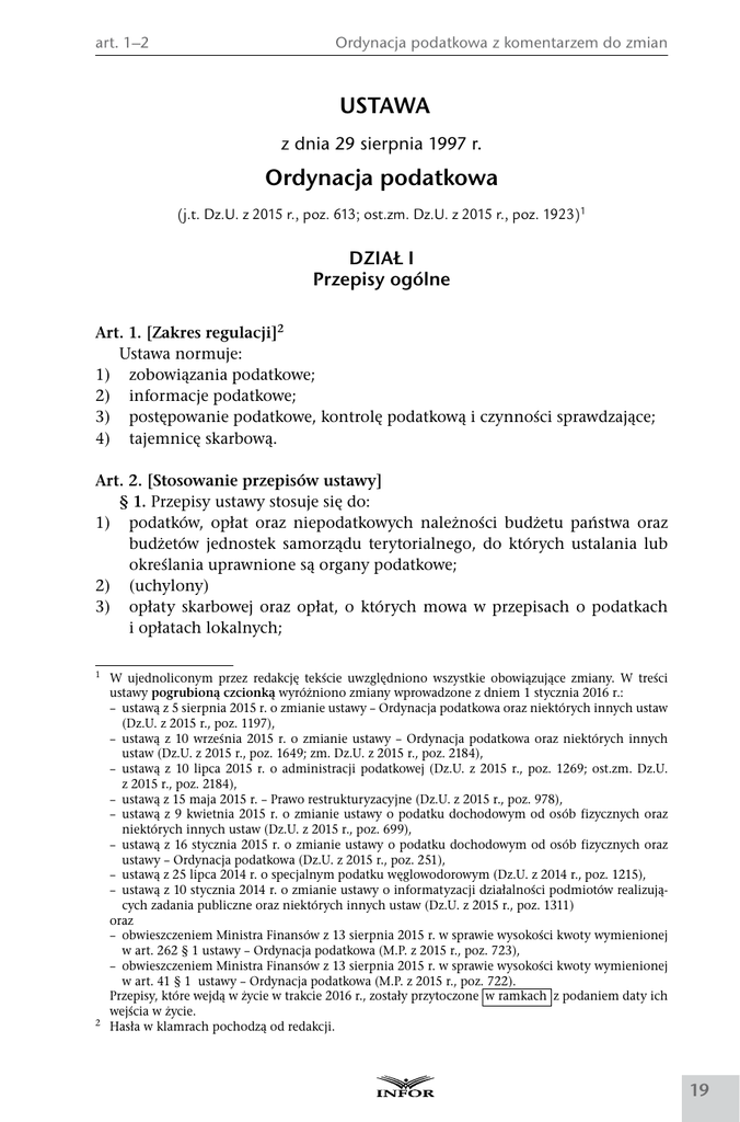 art. 1–2 Ordynacja podatkowa z komentarzem do zmian USTAWA z dnia 29 sierpnia 1997 r. Ordynacja podatkowa (j.t. Dz.U. z 2015 r., poz. 613; ost.zm. Dz.U. z 2015 r., poz. 1923)1 DZIAŁ I Przepisy ogólne Art. 1. [Zakres regulacji]2 Ustawa normuje: 1)zobowiązania podatkowe; 2)informacje podatkowe; 3)postępowanie podatkowe, kontrolę podatkową i czynności sprawdzające; 4)tajemnicę skarbową. Art. 2. [Stosowanie przepisów ustawy] § 1. Przepisy ustawy stosuje się do: 1)podatków, opłat oraz niepodatkowych należności budżetu państwa oraz budżetów jednostek samorządu terytorialnego, do których ustalania lub określania uprawnione są organy podatkowe; 2)(uchylony) 3)opłaty skarbowej oraz opłat, o których mowa w przepisach o podatkach i opłatach lokalnych; 1W ujednoliconym przez redakcję tekście uwzględniono wszystkie obowiązujące zmiany. W treści ustawy pogrubioną czcionką wyróżniono zmiany wprowadzone z dniem 1 stycznia 2016 r.: – ustawą z 5 sierpnia 2015 r. o zmianie ustawy – Ordynacja podatkowa oraz niektórych innych ustaw (Dz.U. z 2015 r., poz. 1197), – ustawą z 10 września 2015 r. o zmianie ustawy – Ordynacja podatkowa oraz niektórych innych ustaw (Dz.U. z 2015 r., poz. 1649; zm. Dz.U. z 2015 r., poz. 2184), – ustawą z 10 lipca 2015 r. o administracji podatkowej (Dz.U. z 2015 r., poz. 1269; ost.zm. Dz.U. z 2015 r., poz. 2184), – ustawą z 15 maja 2015 r. – Prawo restrukturyzacyjne (Dz.U. z 2015 r., poz. 978), – ustawą z 9 kwietnia 2015 r. o zmianie ustawy o podatku dochodowym od osób fizycznych oraz niektórych innych ustaw (Dz.U. z 2015 r., poz. 699), – ustawą z 16 stycznia 2015 r. o zmianie ustawy o podatku dochodowym od osób fizycznych oraz ustawy – Ordynacja podatkowa (Dz.U. z 2015 r., poz. 251), – ustawą z 25 lipca 2014 r. o specjalnym podatku węglowodorowym (Dz.U. z 2014 r., poz. 1215), – ustawą z 10 stycznia 2014 r. o zmianie ustawy o informatyzacji działalności podmiotów realizujących zadania publiczne oraz niektórych innych ustaw (Dz.U. z 2015 r., poz. 1311) oraz – obwieszczeniem Ministra Finansów z 13 sierpnia 2015 r. w sprawie wysokości kwoty wymienionej w art. 262 § 1 ustawy – Ordynacja podatkowa (M.P. z 2015 r., poz. 723), – obwieszczeniem Ministra Finansów z 13 sierpnia 2015 r. w sprawie wysokości kwoty wymienionej w art. 41 § 1 ustawy – Ordynacja podatkowa (M.P. z 2015 r., poz. 722). Przepisy, które wejdą w życie w trakcie 2016 r., zostały przytoczone w ramkach z podaniem daty ich wejścia w życie. 2 Hasła w klamrach pochodzą od redakcji. 19 Ordynacja podatkowa z komentarzem do zmian art. 2a 4)spraw z zakresu prawa podatkowego innych niż wymienione w pkt 1, należących do właściwości organów podatkowych. § 2. Jeżeli odrębne przepisy nie stanowią inaczej, przepisy działu III stosuje się również do opłat, do których ustalenia lub określenia uprawnione są inne niż wymienione w § 1 pkt 1 organy. § 3. Organom, o których mowa w § 2, przysługują uprawnienia organów podatkowych. § 4. Przepisów ustawy nie stosuje się do świadczeń pieniężnych wynikających ze stosunków cywilnoprawnych. Art. 2 Komentarz: Zmiana obowiązuje od 1 stycznia 2016 r. Została wprowadzona ustawą z 10 września 2015 r. o zmianie ustawy – Ordynacja podatkowa oraz niektórych innych ustaw (Dz.U. z 2015 r., poz. 1649 ze zm.). Z art. 2 § 2 Ordynacji podatkowej w brzmieniu przed nowelizacją wynikało, że przepisy działu III Ordynacji pt. „Zobowiązania podatkowe” mają wprost zastosowanie do niepodatkowych należności budżetu państwa. Natomiast z uregulowań art. 60 i art. 67 ustawy o finansach publicznych wynika, że do niepodatkowych należności budżetu państwa należy odpowiednio stosować przepisy działu III Ordynacji podatkowej. W wyniku nowelizacji to podwójne odwołanie zostało zlikwidowane przez wykreślenie w art. 2 § 2 Ordynacji podatkowej „niepodatkowych należności budżetu państwa”. W wyniku tej zmiany przepisy działu III Ordynacji podatkowej są stosowane odpowiednio do niepodatkowych należności budżetu państwa na podstawie art. 67 ustawy o finansach publicznych. Rozwiązanie takie jest optymalne. Większość przepisów działu III Ordynacji podatkowej do niepodatkowych należności budżetu państwa nie może być bowiem stosowana wprost, co wynika ze specyfiki tych należności. Art. 2a. [Obowiązek rozstrzygania wątpliwości na korzyść podatnika] Niedające się usunąć wątpliwości co do treści przepisów prawa podatkowego rozstrzyga się na korzyść podatnika. Art. 2a Komentarz: Art. 2a został dodany ustawą z 5 sierpnia 2015 r. o zmianie ustawy – Ordynacja podatkowa oraz niektórych innych ustaw (Dz.U. z 2015 r., poz. 1197). Obowiązuje od 1 stycznia 2016 r. W art. 2a O.p. wprost została zapisana zasada rozstrzygania wątpliwości na korzyść podatnika (z łac. in dubio pro tributario). Problematyczne (i sporne) może być ustalenie, czy i kiedy występują wątpliwości co do treści przepisów prawa podatkowego. W praktyce organy podatkowe nie mają wątpliwości co do treści przepisów podatkowych. Wątpliwości ma zwykle podatnik, który musi je stosować. 20