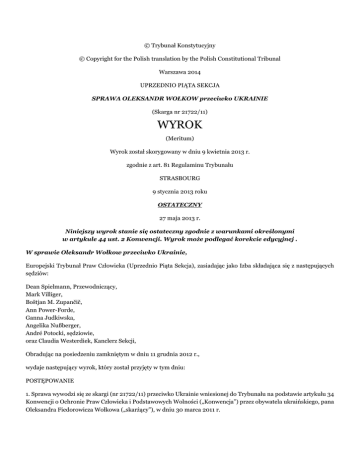 © Trybunał Konstytucyjny © Copyright for the Polish translation by the Polish Constitutional Tribunal Warszawa 2014 UPRZEDNIO PIĄTA SEKCJA SPRAWA OLEKSANDR WOŁKOW przeciwko UKRAINIE (Skarga nr 21722/11) WYROK (Meritum) Wyrok został skorygowany w dniu 9 kwietnia 2013 r. zgodnie z art. 81 Regulaminu Trybunału STRASBOURG 9 stycznia 2013 roku OSTATECZNY 27 maja 2013 r. Niniejszy wyrok stanie się ostateczny zgodnie z warunkami określonymi w artykule 44 ust. 2 Konwencji. Wyrok może podlegać korekcie edycyjnej . W sprawie Oleksandr Wołkow przeciwko Ukrainie, Europejski Trybunał Praw Człowieka (Uprzednio Piąta Sekcja), zasiadając jako Izba składająca się z następujących sędziów: Dean Spielmann, Przewodniczący, Mark Villiger, Boštjan M. Zupančič, Ann Power-Forde, Ganna Judkiwska, Angelika Nußberger, André Potocki, sędziowie, oraz Claudia Westerdiek, Kanclerz Sekcji, Obradując na posiedzeniu zamkniętym w dniu 11 grudnia 2012 r., wydaje następujący wyrok, który został przyjęty w tym dniu: POSTĘPOWANIE 1. Sprawa wywodzi się ze skargi (nr 21722/11) przeciwko Ukrainie wniesionej do Trybunału na podstawie artykułu 34 Konwencji o Ochronie Praw Człowieka i Podstawowych Wolności („Konwencja”) przez obywatela ukraińskiego, pana Oleksandra Fiedorowicza Wołkowa („skarżący”), w dniu 30 marca 2011 r. 2. Skarżącego reprezentowali pan P. Leach i pani J. Gordon, adwokaci z European Human Rights Advocacy Centre w Londynie („EHRAC”). Rząd ukraiński („Rząd”) reprezentowany był przez swego Przedstawiciela, panią V. Latkowską, a następnie przez pana N. Kulczyckijego, z Ministerstwa Sprawiedliwości. 3. Skarżący podniósł zarzut naruszenia praw wynikających z Konwencji w trakcie odwołania ze stanowiska sędziego Sądu Najwyższego. W szczególności skarżący zarzucił naruszenie artykułu 6 Konwencji w tym względzie, że: (i) jego sprawa nie była rozpoznawana przez „niezawisły i bezstronny sąd”; (ii) postępowanie przed Najwyższą Radą Sądownictwa („ NRS”) nie było rzetelne z tego względu, że nie zostało przeprowadzone zgodnie z określoną w prawie krajowym procedurą przewidującą istotne gwarancje proceduralne, w tym okresy przedawnienia kar dyscyplinarnych; (iii) Rada Najwyższa Ukrainy przyjęła decyzję w sprawie jego odwołania na posiedzeniu plenarnym bez odpowiedniego rozpoznania sprawy i przy nadużyciu elektronicznego systemu do głosowania; (iv) jego sprawa nie była rozpoznawana przez „sąd ustanowiony ustawą”; (v) decyzje w jego sprawie były podejmowane bez odpowiedniej oceny dowodów i nie odniesiono się w odpowiedni sposób do istotnych argumentów wskazanych przez obronę; (vi) brak wystarczających kompetencji Najwyższego Sądu Administracyjnego („NSA”) w zakresie weryfikacji aktów przyjętych przez NRS był sprzeczny z jego „prawem do sądu”; oraz (vii) nie przestrzegano zasady równości broni. Skarżący podniósł także zarzut, iż jego odwołanie nie było zgodne z przepisem artykułu 8 Konwencji oraz że nie przysługiwały mu w tym zakresie skuteczne środki odwoławcze, co stanowiło naruszenie artykułu 13 Konwencji. 4. W dniu 18 października 2011 r. skarga została uznana za częściowo niedopuszczalną, a o powyższych zarzutach powiadomiono Rząd. Zadecydowano także o potraktowaniu skargi jako priorytetowej (artykuł 41 Regulaminu Trybunału). 5. Skarżący oraz Rząd złożyli pisemne oświadczenia dotyczące meritum sprawy (artykuł 54 ust. 2 (b) Regulaminu). 6. Rozprawa odbyła się w siedzibie Europejskiego Trybunału Praw Człowieka w Strasburgu, w dniu 12 czerwca 2012 r. (artykuł 59 ust. 3 Regulaminu). Przed sądem (a) w imieniu Rządu Pan N. Kulczyckij, Przedstawiciel, Pan V. Nasad, Pan M. Bem, Pan V. Demczenko, Pani N. Sukowa, Doradcy; (b) w imieniu skarżącego Pan P. Leach, Adwokat, Pani J. Gordon, Pani O. Popowa, Doradcy; Obecny był także skarżący. Trybunał wysłuchał wypowiedzi pana N. Kulczyckijego, pana P. Leach oraz pani J. Gordon, a także odpowiedzi pana N. Kulczyckijego i pana P. Leach na pytania zadane stronom. FAKTY I. OKOLICZNOŚCI SPRAWY 7. Skarżący urodził się w 1957 r. i mieszka w Kijowie. A. Tło sprawy 8. W 1983 r. skarżący został mianowany sędzią sądu rejonowego. W tym czasie prawo krajowe nie wymagało, by sędziowie obejmujący urząd składali przysięgę. 9. W dniu 5 czerwca 2003 r. skarżący został wybrany sędzią Sądu Najwyższego. 10. W dniu 2 grudnia 2005 r. został także wybrany na stanowisko wiceprezesa Rady Sędziów Ukrainy (organ samorządu sędziowskiego). 11. W dniu 30 marca 2007 r. skarżący został wybrany prezesem Izby Wojskowej Sądu Najwyższego. 12. W dniu 26 czerwca 2007 r. Zjazd Sędziów Ukrainy uznał, że inna sędzia, V.P., nie może pełnić roli członka NRS i powinna zostać odwołana. V.P. zakwestionowała tę decyzję przed sądami. Złożyła także skargę do komisji parlamentarnej ds. wymiaru sprawiedliwości (Комітет Верховної Ради України з питань правосуддя)1 („komisja parlamentarna”) w tej sprawie. 13. W dniu 7 grudnia 2007 r. Zjazd Sędziów Ukrainy mianował skarżącego na stanowisko członka NRS i zwrócił się do Rady Najwyższej Ukrainy z prośbą o zorganizowanie możliwości złożenia przez skarżącego ślubowania członka NRS w celu umożliwienia mu objęcia stanowiska w NRS, zgodnie z wymogami art. 17 ustawy o NRS z 1998 r. Podobną prośbę złożono także do prezesa Rady Sędziów Ukrainy. 14. W odpowiedzi przewodniczący komisji parlamentarnej, S.K., który był także członkiem NRS, poinformował Radę Sędziów Ukrainy, że sprawa ta wymaga dokładnego zbadania wraz z zarzutami V.P. twierdzącej, iż decyzja Zjazdu Sędziów Ukrainy o zakończeniu jej kadencji jako członka NRS była niezgodna z prawem. 15. Skarżący nie objął stanowiska członka NRS. B. Postępowanie przeciwko skarżącemu 16. W międzyczasie S.K.