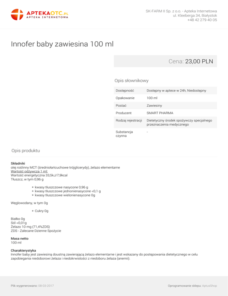 SK-FARM II Sp. z o.o. - Apteka Internetowa ul. Kleeberga 34, Białystok +48 42 279 40 05 Innofer baby zawiesina 100 ml Cena: 23,00 PLN Opis słownikowy Dostępność Dostępny w aptece w 24h, Niedostępny Opakowanie 100 ml Postać Zawiesiny Producent SMART PHARMA Rodzaj rejestracji Dietetyczny środek spożywczy specjalnego przeznaczenia medycznego Substancja czynna - Opis produktu Składniki olej roślinny MCT (średniołańcuchowe trójglicerydy), żelazo elementarne Wartość odżywcza 1 ml: Wartość energetyczna 33,5kJ/7,9kcal Tłuszcz, w tym 0,96 g kwasy tłuszczowe nasycone 0,96 g kwasy tłuszczowe jednonienasycone <0,1 g kwasy tłuszczowe wielonienasycone 0g Węglowodany, w tym 0g Cukry 0g Białko 0g Sól <0,01g Żelazo 10 mg (71,4%ZDS) ZDS - Zalecane Dzienne Spożycie Masa netto 100 ml Charakterystyka Innofer baby jest zawiesiną doustną zawierającą żelazo elementarne i jest wskazany do postępowania dietetycznego w celu zapobiegania niedoborowi żelaza i niedokrwistości z niedoboru żelaza (anemii). Plik wygenerowano: 08-03-2017 Oprogramowanie sklepu: AptusShop SK-FARM II Sp. z o.o. - Apteka Internetowa ul. Kleeberga 34, Białystok +48 42 279 40 05 Przeciwwskazania Nadwrażliwość na którykolwiek ze składników preparatu. Stosowanie Dawkowanie i długość stosowania uzależnione są od stopnia niedoboru żelaza i powinny odbywać się według zaleceń lekarza i pod jego nadzorem. Przed użyciem, w celu uzyskania jednorodnej zawiesiny, produkt należy dokładnie wymieszać. W tym celu należy energicznie wstrząsać butelką nie krócej niż 30 sekund. Po prawidłowym wymieszaniu zawiesina przybiera ciemną barwę. Badania trwałości zawiesiny wykazały, że po zalecanym czasie mieszania zawiesina jest jednorodna (gotowa do podania) przez co najmniej 3 minuty. Jeżeli w czasie 3 minut od momentu zakończenia mieszania nie zostanie pobrana odpowiednia dawka, produkt należy ponownie dokładnie wymieszać. Zaleca się wstrząsnąć intensywnie butelką przed każdorazowym pobraniem dawki nawet jeżeli podawanie odbywa się w ciągu 3 minut od uzyskania jednorodnej zawiesiny. Odmierzoną dawkę należy podać zaraz po przygotowaniu bezpośrednio do jamy ustnej. Po podaniu odmierzonej dawki strzykawkę ze względów higienicznych należy umyć ciepłą bieżącą wodą. Przechowywanie Przechowywać w suchym miejscu, w temperaturze nie przekraczającej 25°C, w oryginalnym opakowaniu w celu ochrony przed światłem. Nie należy narażać produktu na działanie źródeł ciepła, promieni słonecznych ani wilgoci. Przechowywać w sposób niedostępny dla dzieci. Po pierwszym otwarciu produkt należy zużyć w ciągu 90 dni. Producent Smart Pharma sp. z o.o. Złotniki, Ul. Kobaltowa 6 62-002 Suchy Las Informacje dodatkowe Stosować pod nadzorem lekarza. Produkt nie jest przeznaczony do stosowania pozajelitowego. Służymy Państwu pomocą pod adresem [email protected]. Plik wygenerowano: 08-03-2017 Powered by TCPDF (www.tcpdf.org) Oprogramowanie sklepu: AptusShop
