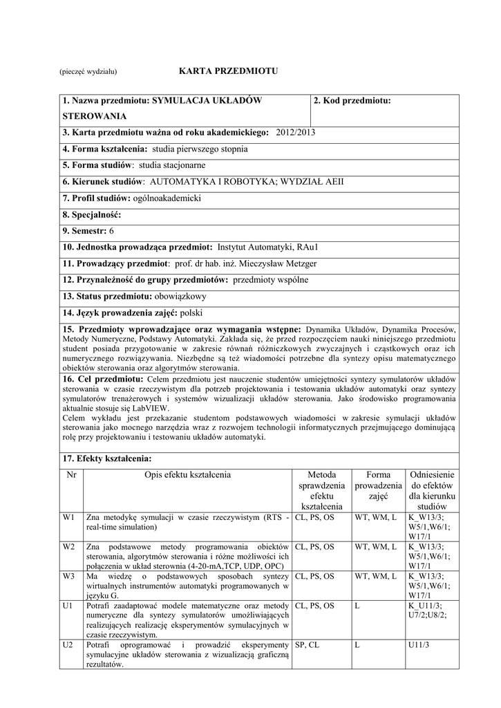 (pieczęć wydziału) KARTA PRZEDMIOTU 1. Nazwa przedmiotu: SYMULACJA UKŁADÓW 2. Kod przedmiotu: STEROWANIA 3. Karta przedmiotu ważna od roku akademickiego: 2012/2013 4. Forma kształcenia: studia pierwszego stopnia 5. Forma studiów: studia stacjonarne 6. Kierunek studiów: AUTOMATYKA I ROBOTYKA; WYDZIAŁ AEII 7. Profil studiów: ogólnoakademicki 8. Specjalność: 9. Semestr: 6 10. Jednostka prowadząca przedmiot: Instytut Automatyki, RAu1 11. Prowadzący przedmiot: prof. dr hab. inż. Mieczysław Metzger 12. Przynależność do grupy przedmiotów: przedmioty wspólne 13. Status przedmiotu: obowiązkowy 14. Język prowadzenia zajęć: polski 15. Przedmioty wprowadzające oraz wymagania wstępne: Dynamika Układów, Dynamika Procesów, Metody Numeryczne, Podstawy Automatyki. Zakłada się, że przed rozpoczęciem nauki niniejszego przedmiotu student posiada przygotowanie w zakresie równań różniczkowych zwyczajnych i cząstkowych oraz ich numerycznego rozwiązywania. Niezbędne są też wiadomości potrzebne dla syntezy opisu matematycznego obiektów sterowania oraz algorytmów sterowania. 16. Cel przedmiotu: Celem przedmiotu jest nauczenie studentów umiejętności syntezy symulatorów układów sterowania w czasie rzeczywistym dla potrzeb projektowania i testowania układów automatyki oraz syntezy symulatorów trenażerowych i systemów wizualizacji układów sterowania. Jako środowisko programowania aktualnie stosuje się LabVIEW. Celem wykładu jest przekazanie studentom podstawowych wiadomości w zakresie symulacji układów sterowania jako mocnego narzędzia wraz z rozwojem technologii informatycznych przejmującego dominującą rolę przy projektowaniu i testowaniu układów automatyki. 17. Efekty kształcenia: Nr Opis efektu kształcenia Metoda sprawdzenia efektu kształcenia Forma Odniesienie prowadzenia do efektów zajęć dla kierunku studiów W1 Zna metodykę symulacji w czasie rzeczywistym (RTS - CL, PS, OS real-time simulation) WT, WM, L W2 Zna podstawowe metody programowania obiektów sterowania, algorytmów sterowania i różne możliwości ich połączenia w układ sterownia (4-20-mA,TCP, UDP, OPC) Ma wiedzę o podstawowych sposobach syntezy wirtualnych instrumentów automatyki programowanych w języku G. Potrafi zaadaptować modele matematyczne oraz metody numeryczne dla syntezy symulatorów umożliwiających realizujących realizację eksperymentów symulacyjnych w czasie rzeczywistym. Potrafi oprogramować i prowadzić eksperymenty symulacyjne układów sterowania z wizualizacją graficzną rezultatów. CL, PS, OS WT, WM, L CL, PS, OS WT, WM, L CL, PS, OS L SP, CL L W3 U1 U2 K_W13/3; W5/1,W6/1; W17/1 K_W13/3; W5/1,W6/1; W17/1 K_W13/3; W5/1,W6/1; W17/1 K_U11/3; U7/2;U8/2; U11/3 Potrafi samodzielnie podejmować decyzje dotyczące CL, PS wyboru metod syntezy symulatorów K2 Potrafi zaprezentować i obronić wykonaną aplikację OS symulatora 18. Formy zajęć dydaktycznych i ich wymiar (liczba godzin) K1 L K_K04/2 L K_K05/2 W. : 30 L.: 15 19. Treści kształcenia: Wykład Podstawowe pojęcia modelowania i symulacji. Testowanie układów automatyki. Oprogramowania LabVIEW jako światowy standard dla syntezy instrumentów wirtualnych (czyli w pełni funkcjonalnych urządzeń zrealizowanych na PC). Podstawowy kurs języka G. Idea programowania graficznego. Język G jako narzędzie nie ustępujące językowi C/C++. Okna aplikacji (panele czołowe urządzeń oraz systemów SCADA/HMI/MMI/GUI) oraz diagramu programu. Programowanie graficznego panelu użytkownika. Omówienie implementacji gałek, pokręteł, manipulatorów, przycisków oraz wskaźników i okien wykresów czasowych. Wizualizacja trendów i alarmów. Dobór mechanicznej reakcji kontrolek. Idea programowania graficznego za pomocą ikon. Tworzenie programu za pomocą łączenia ikon. Idea i realizacja paradygmatu „data flow computing”. Graficzna realizacja podstawowych struktur programowania (pętle, instrukcje warunkowe, sekwencje itp.). Klastry. Zmienne lokalne i globalne. Realizacja funkcji i podprogramów w języku G. Programowanie obiektowe w języku G. Graficzne programowanie operacji z użyciem macierzy i wektorów. Realizacja operacji w czasie rzeczywistym. Obliczenia w trybie “data flow computing”. Graficzny debugger. Obsługa We/Wy w czasie rzeczywistym. Symulacja w czasie rzeczywistym. Adaptacja podstawowych metod numerycznego całkowania RRZw i RRCz. oraz analitycznych metod badania dynamiki procesów. Metody Eulera, RK2, RK4, AB2, ABM4 oraz metody linii. Przystosowanie podstawowych zasad dyskretyzacji układów ciągłych z wykorzystaniem przekształcenia Z dla syntezy regulatorów i symulatorów. Przykłady symulacji obiektów automatyki w czasie rzeczywistym. Realizacja prostych algorytmów regulacji i sterowania. Symulacja układów automatyki. Zajęcia laboratoryjne 1) Synteza GUI (programowanie wskaźników i zadajników). 2) Kontrola realizacji obliczeń i realizacja czasu rzeczywistego. 3) Obsługa we/wy analogowych i cyfrowych. 4) Symulatory obiektów automatyki. 5) Synteza regulatorów P, PI, PID z ograniczeniem sygnału i zatrzymaniem całkowania. 6) Badania symulacyjne układów regulacji. 20. Egzamin: nie 21. Literatura podstawowa: 1) Metzger: Modelling, simulation and control of continuous processes, Wyd. Jacka Skalmierskiego, 2000. 2) LabVIEW - aktualny podręcznik użytkownika. 22. Literatura uzupełniająca: 1. M.Metzger. Graphical programming of real-time simulation of a class of distributed parameter systems. Proceedings of the 16 IMACS World Congress, Lousanne 2000 (w formie pdf) 20. Egzamin: tak nie1 23. Nakład pracy studenta potrzebny do osiągnięcia efektów kształcenia Lp. Forma zajęć 1 Wykład 2 Ćwiczenia 3 Laboratorium 4 Projekt Liczba godzin kontaktowych / pracy studenta 30/0 0/0 15/15 0/0 5 Seminarium 0/0 6 Inne 5/5 Suma godzin 50/20 24. Suma wszystkich godzin: 70 25. Liczba punktów ECTS: 2 26. Liczba punktów ECTS uzyskanych na zajęciach z bezpośredn