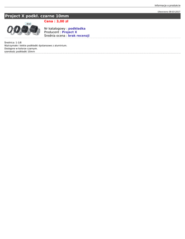 Informacje o produkcie Utworzono 08-03-2017 Project X podkł. czarne 10mm Cena : 3,00 zł Nr katalogowy : podkładka Producent : Project X Średnia ocena : brak recenzji Średnica: 1-1/8 Wytrzymałe i lekkie podkładki dystansowe z aluminium. Dostępne w kolorze czarnym. szerokośc podkładki 10mm