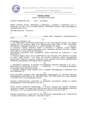 M IE JSK I O ŚRO DE K P O MOC Y S PO ŁEC ZN EJ W R ADOM S KU ul. Kościuszki 10, 97-500 Radomsko tel./fax (44) 683-28-85, 683-28-55, e-mail: [email protected] UMOWA WZÓR kupna - sprzedaży samochodu zawarta w Radomsku dniu ……… 2017 r. pomiędzy: Miejski Ośrodek Pomocy Społecznej w Radomsku z siedzibą w Radomsku przy ul. Kościuszki 10, NIP: 772-15-23-068 REGON: 004700786 zwanym dalej Sprzedającym, reprezentowany przez: Andrzeja Barszcza – Dyrektora a ……………………….…. NIP ………….………………., zwaną dalej Kupującym reprezentowanym przez: ……………………………………………………. §1 Sprzedający oświadcza, że: 1. Jest właścicielem samochodu ciężarowego do 3,5t marki Renault Kangoo 1.8t, Wersja Express RN, rok produkcji 2000 o Nr rejestracyjnym ERA 25EK, nr VIN: VF1FC0HAF22246625 z przebiegiem 253341 km o kolorze powłoki lak. białym 1-warstwowy akrylowy. Rodzaj nadwozia: furgon 3 drzwiowy, 2 osobowy, rodzaj napędu: przedni(4X2), skrzynia biegów manualna, silnik z zapłonem iskrowym (wtrysk) o pojemności 1390 cm i mocy silnika 55 kW(75KM). (szczegółowe parametry auta przedstawia opinia techniczna Nr Ł/396/3/17 z dnia 09.01.2017r.). 2. Zbywany pojazd wolny jest od jakichkolwiek wad prawnych oraz obciążeń i roszczeń na rzecz osób trzecich i nie toczy się również przeciwko niemu postępowanie egzekucyjne. Gdyby po zawarciu niniejszej umowy ujawniło się istnienie jakiegokolwiek obciążenia, Sprzedający zobowiązuje się je uregulować. §2 1. Sprzedający oświadcza, że przenosi na Kupującego własność opisanego w § 1 ust. 1 samochodu za cenę brutto w kwocie ……… zł (słownie:………………), a Kupujący oświadcza, że za podaną cenę samochód kupuje. 2. Kupujący odbierze wyżej opisane auto w siedzibie Sprzedającego w Radomsku przy ulicy Kościuszki 10. §3 Cenę sprzedaży Kupujący uiści Sprzedającemu bezpośrednio na rachunek bankowy Sprzedającego Getin Bank Nr 84 1560 0013 2003 7073 0000 0003 lub w kasie Ośrodka w terminie 2 dni o dnia podpisania umowy. §4 Wydanie przedmiotowego samochodu w posiadanie Kupującemu nastąpi po wpłacie Sprzedającemu kwoty określonej w § 2 ust. 1. §5 Strony umowy wzajemnie oświadczają, iż umowa niniejsza bez skutków finansowo -prawnych wygasa i nie wiąże stron, jeśli do kasy lub na konto Sprzedającego w terminie określonym w § 3 nie wpłyną środki finansowe, o których mowa w § 2 ust. 1. §6 Kupujący oświadcza, iż znany jest mu stan techniczny nabywanego auta i zapoznał się z opinią techniczną Nr Ł/396/3/17 z dnia 09.01.2017r. §7 Wszelkie zmiany umowy do swej ważności wymagają zachowania formy pisemnej pod rygorem nieważności. §8 W sprawach nieuregulowanych umową maja zastosowanie przepisy Kodeksu Cywilnego. §9 Umowę sporządzono w trzech jednobrzmiących egzemplarzach, w tym dwa egzemplarze dla Sprzedającego. Strony umowy wzajemnie oświadczają, iż umowa niniejsza bez skutków finansowo -prawnych wygasa i nie wiąże stron, jeśli na konto Sprzedającego w terminie do 12. 12 2016 r., nie wpłyną środki finansowe, o których mowa w § 2 ust. 1. Kupujący Sprzedający