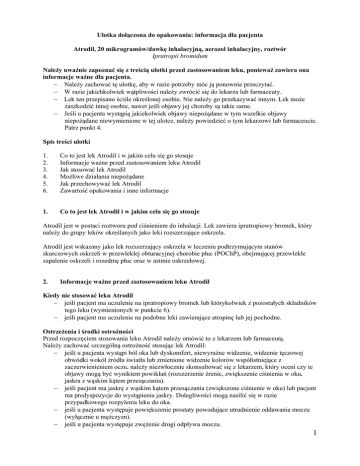 Ulotka dołączona do opakowania: informacja dla pacjenta Atrodil, 20 mikrogramów/dawkę inhalacyjną, aerozol inhalacyjny, roztwór Ipratropii bromidum Należy uważnie zapoznać się z treścią ulotki przed zastosowaniem leku, ponieważ zawiera ona informacje ważne dla pacjenta. Należy zachować tę ulotkę, aby w razie potrzeby móc ją ponownie przeczytać. W razie jakichkolwiek wątpliwości należy zwrócić się do lekarza lub farmaceuty. Lek ten przepisano ściśle określonej osobie. Nie należy go przekazywać innym. Lek może zaszkodzić innej osobie, nawet jeśli objawy jej choroby są takie same. Jeśli u pacjenta wystąpią jakiekolwiek objawy niepożądane w tym wszelkie objawy niepożądane niewymienione w tej ulotce, należy powiedzieć o tym lekarzowi lub farmaceucie. Patrz punkt 4. Spis treści ulotki 1. 2. 3. 4. 5. 6. Co to jest lek Atrodil i w jakim celu się go stosuje Informacje ważne przed zastosowaniem leku Atrodil Jak stosować lek Atrodil Możliwe działania niepożądane Jak przechowywać lek Atrodil Zawartość opakowania i inne informacje 1. Co to jest lek Atrodil i w jakim celu się go stosuje Atrodil jest w postaci roztworu pod ciśnieniem do inhalacji. Lek zawiera ipratropiowy bromek, który należy do grupy leków określanych jako leki rozszerzające oskrzela. Atrodil jest wskazany jako lek rozszerzający oskrzela w leczeniu podtrzymującym stanów skurczowych oskrzeli w przewlekłej obturacyjnej chorobie płuc (POChP), obejmującej przewlekłe zapalenie oskrzeli i rozedmę płuc oraz w astmie oskrzelowej. 2. Informacje ważne przed zastosowaniem leku Atrodil Kiedy nie stosować leku Atrodil jeśli pacjent ma uczulenie na ipratropiowy bromek lub którykolwiek z pozostałych składników tego leku (wymienionych w punkcie 6). jeśli pacjent ma uczulenie na podobne leki zawierające atropinę lub jej pochodne. Ostrzeżenia i środki ostrożności Przed rozpoczęciem stosowania leku Atrodil należy omówić to z lekarzem lub farmaceutą. Należy zachować szczególną ostrożność stosując lek Atrodil: jeśli u pacjenta wystąpi ból oka lub dyskomfort, niewyraźne widzenie, widzenie tęczowej obwódki wokół źródła światła lub zmienione widzenie kolorów współistniejące z zaczerwienieniem oczu, należy niezwłocznie skonsultować się z lekarzem, który oceni czy te objawy mogą być wynikiem powikłań (rozszerzenie źrenic, zwiększenie ciśnienia w oku, jaskra z wąskim kątem przesączania). jeśli pacjent ma jaskrę z wąskim kątem przesączania (zwiększone ciśnienie w oku) lub pacjent ma predyspozycje do wystąpienia jaskry. Dolegliwości mogą nasilić się w razie przypadkowego rozpylenia leku do oka. jeśli u pacjenta występuje powiększenie prostaty powodujące utrudnienie oddawania moczu (wyłącznie u mężczyzn). jeśli u pacjenta występuje zwężenie drogi odpływu moczu. 1 jeśli pacjent ma mukowiscydozę; mogą wystąpić zaburzenia motoryki przewodu pokarmowego (np. zaparcia, biegunki). jeśli trudności w oddychaniu nie ustępują lub pogłębiają się: należy natychmiast skontaktować się z lekarzem, który zweryfikuje plan leczenia. Lekarz może zalecić stosowanie dodatkowych leków. Nigdy nie należy przekraczać przepisanej dawki, gdyż może to prowadzić do wystąpienia ciężkich działań niepożądanych. Nie wolno dopuścić, aby lek Atrodil dostał się do oczu. Lek Atrodil a inne leki Należy powiedzieć lekarzowi lub farmaceucie o wszystkich lekach stosowanych przez pacjenta obecnie lub ostatnio, a także o lekach, które pacjent planuje stosować. Niektóre leki mogą oddziaływać z lekiem Atrodil. Może to zmieniać działanie leku Atrodil lub innych leków. W szczególności, należy poinformować lekarza o stosowaniu któregokolwiek z następujących leków: innych leków rozszerzających oskrzela, takich jak salbutamol. beta-adrenolityków stosowanych w leczeniu chorób serca i nadciśnienia tętniczego, np. atenololu, bisoprololu. leków ksantynowych, np. teofiliny, aminofiliny. Ciąża i karmienie piersią Jeśli pacjentka jest w ciąży lub karmi piersią, przypuszcza że może być w ciąży lub gdy planuje mieć dziecko, powinna poradzić się lekarza lub farmaceuty przed zastosowaniem tego leku. Nie ustalono bezpieczeństwa stosowania tego leku w czasie ciąży. Lek Atrodil należy stosować w ciąży jedynie wtedy, gdy lekarz uzna to za konieczne. Nie wiadomo, czy ipratropiowy bromek przenika do mleka kobiecego. Dlatego należy stosować lek Atrodil u kobiet karmiących piersią jedynie wtedy, gdy lekarz uzna to za konieczne. Prowadzenie pojazdów i obsługiwanie maszyn Nie przeprowadzono badań dotyczących wpływu leku na zdolność prowadzenia pojazdów i obsługiwania maszyn. Jeśli podczas stosowania leku Atrodil wystąpią zawroty głowy lub zaburzenia widzenia (niewyraźne widzenie, widzenie tęczowej obwódki wokół źródła światła), należy zaniechać wykonywania wyżej wymienionych czynności. Lek Atrodil zawiera etanol Lek zawiera małe ilości etanolu (alkoholu), mniej niż 100 mg na dawkę. Jedna odmierzona dawka (rozpylenie) zawiera 8,42 mg etanolu bezwodnego. 3. Jak stosować lek Atrodil Ten lek należy zawsze stosować zgodnie z zaleceniami lekarza. W razie wątpliwości należy zwrócić się do lekarza lub farmaceuty. Lekarz dostosuje dawkowanie do indywidualnych potrzeb pacjenta. Jeżeli nie zalecono inaczej, stosuje się następujące dawkowanie: Dorośli i dzieci w wieku powyżej 6 lat 2 dawki (rozpylenia) przy każdym zastosowaniu, 4 razy na dobę, ale nie więcej niż 12 rozpyleń na dobę. Nie należy przekraczać zalecanej dawki dobowej. Jeżeli leczenie nie przynosi znaczącej poprawy lub jeżeli stan pacjenta ulega pogorszeniu, należy skonsultować się z lekarzem w celu ustalenia nowego planu leczenia. 2 W przypadku nagłej lub gwałtownie nasilającej się duszności (trudności w oddychaniu), należy bezzwłocznie skontaktować się z lekarzem. U dzieci 
