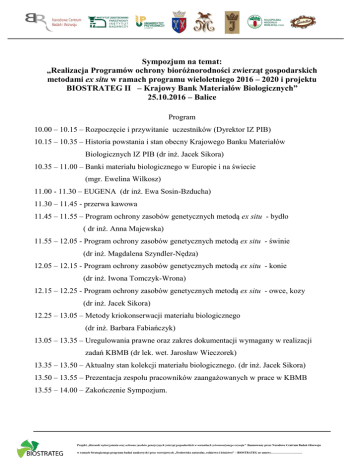 Sympozjum na temat: „Realizacja Programów ochrony bioróżnorodności zwierząt gospodarskich metodami ex situ w ramach programu wieloletniego 2016 – 2020 i projektu BIOSTRATEG II – Krajowy Bank Materiałów Biologicznych” 25.10.2016 – Balice Program 10.00 – 10.15 – Rozpoczęcie i przywitanie uczestników (Dyrektor IZ PIB) 10.15 – 10.35 – Historia powstania i stan obecny Krajowego Banku Materiałów Biologicznych IZ PIB (dr inż. Jacek Sikora) 10.35 – 11.00 – Banki materiału biologicznego w Europie i na świecie (mgr. Ewelina Wilkosz) 11.00 - 11.30 – EUGENA (dr inż. Ewa Sosin-Bzducha) 11.30 – 11.45 - przerwa kawowa 11.45 – 11.55 – Program ochrony zasobów genetycznych metodą ex situ - bydło ( dr inż. Anna Majewska) 11.55 – 12.05 - Program ochrony zasobów genetycznych metodą ex situ - świnie (dr inż. Magdalena Szyndler-Nędza) 12.05 – 12.15 - Program ochrony zasobów genetycznych metodą ex situ - konie (dr inż. Iwona Tomczyk-Wrona) 12.15 – 12.25 - Program ochrony zasobów genetycznych metodą ex situ - owce, kozy (dr inż. Jacek Sikora) 12.25 – 13.05 – Metody kriokonserwacji materiału biologicznego (dr inż. Barbara Fabiańczyk) 13.05 – 13.35 – Uregulowania prawne oraz zakres dokumentacji wymagany w realizacji zadań KBMB (dr lek. wet. Jarosław Wieczorek) 13.35 – 13.50 – Aktualny stan kolekcji materiału biologicznego. (dr inż. Jacek Sikora) 13.50 – 13.55 – Prezentacja zespołu pracowników zaangażowanych w prace w KBMB 13.55 – 14.00 – Zakończenie Sympozjum. Projekt „Kierunki wykorzystania oraz ochrona zasobów genetycznych zwierząt gospodarskich w warunkach zrównoważonego rozwoju” finansowany przez Narodowe Centrum Badań i Rozwoju w ramach Strategicznego programu badań naukowych i prac rozwojowych „Środowisko naturalne, rolnictwo i leśnictwo” – BIOSTRATEG nr umowy………………………….