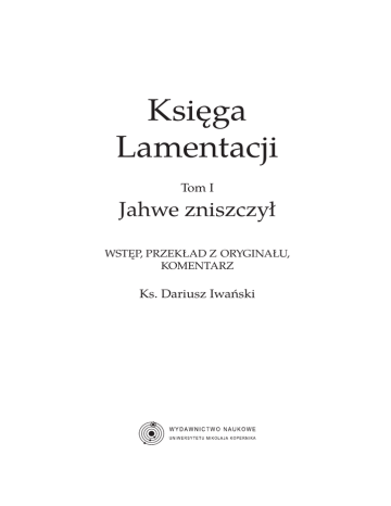 Księga Lamentacji Tom I Jahwe zniszczył WSTĘP, PRZEKŁAD Z ORYGINAŁU, KOMENTARZ Ks. Dariusz Iwański Recenzent ks. prof. dr hab. Mariusz Rosik Redakcja i korekta Magdalena Szczepańska Projekt okładki Łukasz Aleksandrowicz © Copyright by Wydawnictwo Naukowe Uniwersytetu Mikołaja Kopernika Toruń 2015 ISBN 978-83-231-3482-4 WYDAWNICTWO NAUKOWE UNIWERSYTETU MIKOŁAJA KOPERNIKA Redakcja: ul. Gagarina 5, 87-100 Toruń tel. 56 611 42 95, fax 56 611 47 05 e-mail: [email protected] www.wydawnictwoumk.pl Dystrybucja: ul. Mickiewicza 2/4, 87-100 Toruń tel./fax 56 611 42 38 e-mail: [email protected] www.wydawnictwoumk.pl Druk: Drukarnia Wydawnictwa Naukowego UMK SPIS TREŚCI Skróty WPROWADZENIE A. Tło historyczne B. Gatunek literacki B.1. Lamentacja – nie „biadolenie” B.1.1. Lamentacja zbiorowa B.2. Obce wpływy C. Autorstwo D. Datacja E. Akrostych F. Kompozycja i struktura G. Głosy H. Córa Syjonu I. Przesłanie teologiczne 7 11 11 18 18 20 23 24 28 30 35 38 40 46 TEKST, TŁUMACZENIE I KOMENTARZ Rozdział I 1. Zagadnienia literackie 2. Krajobraz po bitwie – relacja Narratora 2.1. Tekst i tłumaczenie Lm 1,1 – 11 2.2. Egzegeza 2.3. Wnioski teologiczne 3. Jerozolima niepocieszona – skarga Córy Syjonu 3.1. Tekst i tłumaczenie Lm 1,12 – 22 3.2. Egzegeza 3.3. Wnioski teologiczne 51 51 55 55 60 84 86 86 91 110 Rozdział II 1. Zagadnienia literackie 2. Treści teologiczne 3. Część I. Narrator – raport o zniszczeniu 3.1. Tekst i tłumaczenie Lm 2,1 – 10 3.2. Egzegeza 3.3. Wnioski teologiczne 4. Część II: Narrator: osobista refleksja i dramatyczny apel 4.1. Tekst i tłumaczenie Lm 2,11 – 19 4.2. Egzegeza 5. Część III. Modlitwa Jerozolimy 5.1. Tekst i tłumaczenie Lm 2,20 – 22 5.2. Egzegeza 5.3. Wnioski teologiczne 112 112 115 117 117 121 137 Bibliografia 167 139 139 142 159 159 160 164