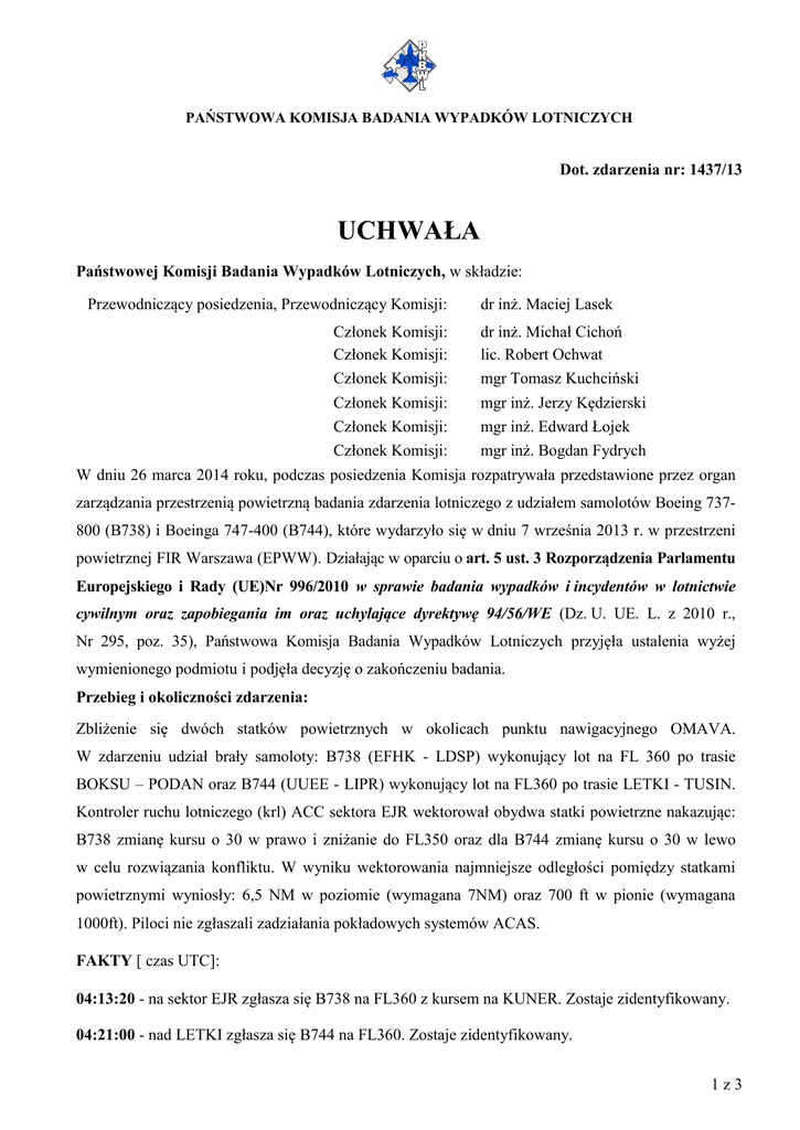 PAŃSTWOWA KOMISJA BADANIA WYPADKÓW LOTNICZYCH Dot. zdarzenia nr: 1437/13 UCHWAŁA Państwowej Komisji Badania Wypadków Lotniczych, w składzie: Przewodniczący posiedzenia, Przewodniczący Komisji: Członek Komisji: Członek Komisji: Członek Komisji: Członek Komisji: Członek Komisji: Członek Komisji: W dniu 26 marca 2014 roku, podczas posiedzenia Komisja dr inż. Maciej Lasek dr inż. Michał Cichoń lic. Robert Ochwat mgr Tomasz Kuchciński mgr inż. Jerzy Kędzierski mgr inż. Edward Łojek mgr inż. Bogdan Fydrych rozpatrywała przedstawione przez organ zarządzania przestrzenią powietrzną badania zdarzenia lotniczego z udziałem samolotów Boeing 737800 (B738) i Boeinga 747-400 (B744), które wydarzyło się w dniu 7 września 2013 r. w przestrzeni powietrznej FIR Warszawa (EPWW). Działając w oparciu o art. 5 ust. 3 Rozporządzenia Parlamentu Europejskiego i Rady (UE)Nr 996/2010 w sprawie badania wypadków i incydentów w lotnictwie cywilnym oraz zapobiegania im oraz uchylające dyrektywę 94/56/WE (Dz. U. UE. L. z 2010 r., Nr 295, poz. 35), Państwowa Komisja Badania Wypadków Lotniczych przyjęła ustalenia wyżej wymienionego podmiotu i podjęła decyzję o zakończeniu badania. Przebieg i okoliczności zdarzenia: Zbliżenie się dwóch statków powietrznych w okolicach punktu nawigacyjnego OMAVA. W zdarzeniu udział brały samoloty: B738 (EFHK - LDSP) wykonujący lot na FL 360 po trasie BOKSU – PODAN oraz B744 (UUEE - LIPR) wykonujący lot na FL360 po trasie LETKI - TUSIN. Kontroler ruchu lotniczego (krl) ACC sektora EJR wektorował obydwa statki powietrzne nakazując: B738 zmianę kursu o 30 w prawo i zniżanie do FL350 oraz dla B744 zmianę kursu o 30 w lewo w celu rozwiązania konfliktu. W wyniku wektorowania najmniejsze odległości pomiędzy statkami powietrznymi wyniosły: 6,5 NM w poziomie (wymagana 7NM) oraz 700 ft w pionie (wymagana 1000ft). Piloci nie zgłaszali zadziałania pokładowych systemów ACAS. FAKTY [ czas UTC]: 04:13:20 - na sektor EJR zgłasza się B738 na FL360 z kursem na KUNER. Zostaje zidentyfikowany. 04:21:00 - nad LETKI zgłasza się B744 na FL360. Zostaje zidentyfikowany. 1z3 04:28:38 - nad punktem GORAT zgłasza się SVR759 i podczas składania meldunku pozycyjnego na wskaźniku radarowym zapala się ostrzeżenie CAW (04:28:43). Ostrzeżenie dotyczy B738 i B744. 04:28:47 - koniec transmisji SVR759. Krl EJR nie potwierdza odebrania transmisji SVR759. 04:28:48 - krl EJR nakazuje B744 natychmiastową zmianę kursu w lewo o 30 stopni. Brak reakcji ze strony B744. 04:28:55 - zgłasza się PGT2552, informuje o wznoszeniu do FL270 na JAB. Krl EJR nie potwierdza odebrania transmisji od PGT2552. 04:29:01 - krl EJR nakazuje B738 zmianę kursu w prawo o 30 stopni. Brak potwierdzenia ze strony B738. 04:29:10 - krl EJR ponowne wywołuje B738 i poleca zmianę kursu w prawo o 30 stopni. B738 potwierdza przyjęcie polecenia. 04:29:16 - krl EJR ponownie wywołuje B744 i poleca zmianę kursu w lewo o 30 stopni. B744 potwierdza odbiór wykonania zmiany kursu. 04:29: 20 - krl nakazuje B738 zajęcie FL350 ze względu na ruch lotniczy. B738 potwierdza odbiór polecenia. 04:29:38 - na wskaźniku radarowym zapala się CA informując o konflikcie. 04:30:12 - gaśnie na wskaźniku ostrzeżenie CA. 04:30:45 - krl poleca B738 przyjąć kurs na PTS, a B744 kurs na BABKO. Obie załogi samolotów potwierdzają przyjęcie polecenia. 04:35:40 - B738 otrzymuje zezwolenie na ponowne zajęcie FL360. B738 potwierdza. USTALENIA 1. Zbliżanie się samolotów do momentu wygenerowania STCA CAW nie było nadzorowane przez krl. 2. Zadziałanie ostrzeżenia CAW systemu AMS2000+ zwróciło uwagę krl na sytuację. Jego natychmiastowe zareagowanie zostało opóźnione zablokowaniem nadajnika transmisją radiową trwającą do 04:28:47 (SVR759). 3. Polecenia wykonania zmian kursów dla B738 i B744 (po niepotwierdzaniu przez krl wcześniejszych transmisji od SVR759 i PGT2552) nie zostają powtórzone przez B738 i B744. Przyczyną tego mogło być "brzmieniowo" połączenie się w jeden ciąg transmisji np. zgłoszenia się SVR759 i polecenie krl dla B744. Mogło temu zapobiec zastosowanie następującej frazeologii po zgłoszeniu się SVR759: "SVR standby. Break, break. B744 immediately turn left 3-0 degrees". Identyczna sytuacja dotyczy PGT2552 i B738. 4. Brak ww. potwierdzeń odbioru poleceń ze strony B738 i B744 potęgują dyskomfort krl, któremu 2z3 w końcu udaje się (04:29:12) przekazać polecenia zmian kursów dla załóg samolotów oraz polecenie zniżania do FL350 dla B738. 5. Z analizy zrzutów trajektorii lotu obu samolotów (04:29:12 - 04:30:10) wynika, że zapobieżenie zaniżeniu separacji było spóźnione, tak jak i spóźnione było nakazanie B738 opuszczenie FL360. 6. W zastosowanej przez krl frazeologii zabrakło: a) wzmocnienia „immediately” w powtórzonych (transmisje o 04:29:10 0 04:29:16) poleceniach zmiany kurów dla B738 i B744. Pierwsza transmisja skierowana do B744 zawiera tę frazę, ale polecenie nie zostaje powtórzone przez załogę samolotu. b) informacji o zasadniczym ruchu lotniczym odpowiednio dla B738 i B744. WNIOSKI WYNIKAJĄCE ZE ZDARZENIA 1. Praca 3-sektorowa (BGS, DTC i EJR) - brak możliwości uruchomienia dodatkowych sektorów z uwagi na grafikowo określoną obsadę stanowisk operacyjnych. 2. W rozpatrywanym przedziale czasowym (20 minut) w sektorze stale na łączności było ok. 18 samolotów o różnych trajektoriach lotu, duża ilość transmisji radiowych. Złożoność sytuacji ruchowych w różnych częściach sektora EJR i nałożenie się - w opisywanym zdarzeniu nieprzewidywalnych zakłóceń w korespondencji z kolidującym samolotami oraz brak wcześniejszej analizy potencjalnego konfliktu są czynnikami zaistniałej sytuacji. 3. Z wywiadu przeprowadzonego z krl EJR wynika, że Planning krl również nie zauważył możliwości konfliktu. Przyczyna incydentu lotniczego: Błędy w pracy ATM. Działania podjęte przez podmiot 