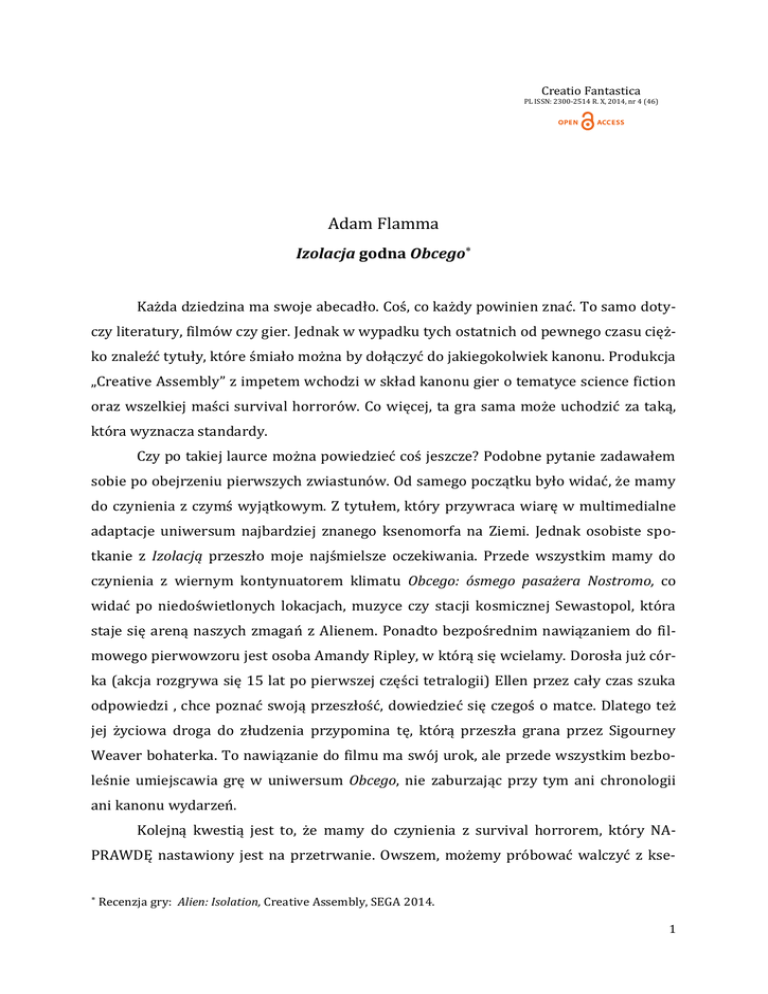 Creatio Fantastica PL ISSN: 2300-2514 R. X, 2014, nr 4 (46) Adam Flamma Izolacja godna Obcego Każda dziedzina ma swoje abecadło. Coś, co każdy powinien znać. To samo dotyczy literatury, filmów czy gier. Jednak w wypadku tych ostatnich od pewnego czasu ciężko znaleźć tytuły, które śmiało można by dołączyć do jakiegokolwiek kanonu. Produkcja „Creative Assembly” z impetem wchodzi w skład kanonu gier o tematyce science fiction oraz wszelkiej maści survival horrorów. Co więcej, ta gra sama może uchodzić za taką, która wyznacza standardy. Czy po takiej laurce można powiedzieć coś jeszcze? Podobne pytanie zadawałem sobie po obejrzeniu pierwszych zwiastunów. Od samego początku było widać, że mamy do czynienia z czymś wyjątkowym. Z tytułem, który przywraca wiarę w multimedialne adaptacje uniwersum najbardziej znanego ksenomorfa na Ziemi. Jednak osobiste spotkanie z Izolacją przeszło moje najśmielsze oczekiwania. Przede wszystkim mamy do czynienia z wiernym kontynuatorem klimatu Obcego: ósmego pasażera Nostromo, co widać po niedoświetlonych lokacjach, muzyce czy stacji kosmicznej Sewastopol, która staje się areną naszych zmagań z Alienem. Ponadto bezpośrednim nawiązaniem do filmowego pierwowzoru jest osoba Amandy Ripley, w którą się wcielamy. Dorosła już córka (akcja rozgrywa się 15 lat po pierwszej części tetralogii) Ellen przez cały czas szuka odpowiedzi , chce poznać swoją przeszłość, dowiedzieć się czegoś o matce. Dlatego też jej życiowa droga do złudzenia przypomina tę, którą przeszła grana przez Sigourney Weaver bohaterka. To nawiązanie do filmu ma swój urok, ale przede wszystkim bezboleśnie umiejscawia grę w uniwersum Obcego, nie zaburzając przy tym ani chronologii ani kanonu wydarzeń. Kolejną kwestią jest to, że mamy do czynienia z survival horrorem, który NAPRAWDĘ nastawiony jest na przetrwanie. Owszem, możemy próbować walczyć z kse Recenzja gry: Alien: Isolation, Creative Assembly, SEGA 2014. 1 nomorfem, ale to walka z wiatrakami. Poza tym – zupełnie szczerze – szkoda amunicji. Bestia jest naprawdę trudnym wyzwaniem, w dodatku jest nieoskryptowana, czyli za każdym razem zachowuje się i reaguje inaczej. I tu dochodzimy do sedna sprawy. Mianowicie jeszcze w żadnej z gier nasz ksenomorf nie był tak… irytujący, wredny, nachalny, wścibski, nieoczekiwany czy po prostu straszny. Wzorowany w zupełności na wizerunku stworzonym przez Hansa Rudolfa Gigera potwór potrafi nam uprzykrzyć życie. W praktyce okazuje się zatem, że lepiej poruszać się w kucki, czasem najlepiej schować się w szafie i nie wychodzić z niej przez dłuższy czas (najdłużej wysiedziałem tam półtorej godziny, po czym Obcy mnie zaatakował i… no, sami wiecie). Co więcej, monstrum jest piekielnie inteligentne, bystre, szybkie i wyjątkowo spostrzegawcze (ma wyostrzone zmysły słuchu, węchu i wzroku). Wszelkiego rodzaju hałasy powodują, że zaczyna biec szybciej w naszą stronę i wtedy możemy liczyć albo na łut szczęścia, albo na własny refleks. Z reguły jednak zawodzi jedno i drugie. Oprócz tego nasz prześladowca potrafi wynurzyć się z kanału wentylacyjnego bądź zaskoczyć nas w trakcie zapisywania gry (i nie ma wtedy dla nas szans). W dodatku, przemykając zaciemnionymi korytarzami i kanałami wentylacyjnymi Sewastopola, co chwilę mamy wrażenie, że każdy następny krok będzie ostatnim. Trochę pomaga znany z filmów wykrywacz ruchu, ale nawet to nie zmienia faktu, że Obcy: Izolacja to jeden z najtrudniejszych survival horrorów ostatnich lat. 2 Skoncentrowana na oddaniu klimatu gra charakteryzuje się przede wszystkim olbrzymim szacunkiem do filmowych pierwowzorów. Twórcy od samego początku podkreślali, że to produkcja od fanów serii dla fanów serii. Nawiązania do filmu, podobna scenografia, itd. to gratka dla prawdziwych miłośników Obcego, ale też scenografia tworząca fascynujący klimat (ukłony dla grafików za cudowne odwzorowanie future retro!), od którego – mimo niesamowicie trudnych i z czasem nużących (ile razy można wytrzymać bycie pożeranym?) momentów – ciężko się oderwać. To przyjemna odmiana po wpadce, jaką był Alien: colonial marines. Nie ma tutaj także mowy o masowym zabijaniu (nie, masakra ksenomorfów nie wchodzi w grę). Wszystko oddane jest na tyle wiernie, że śmiało mogę powiedzieć: gra wbija w fotel i trzyma w niesamowitym napięciu od początku do końca. Potęguje to fakt, iż Obcy nie ma powtarzalnego schematu zachowań. Co prawda boi się ognia, ale często nie zda nam się to na wiele. Wszystko dlatego – i to jest prawdziwe novum – że nasz milusiński posiada szereg tajemnych korytarzy i przejść dostępnych tylko jemu. Skutkuje to nieustannym poczuciem strachu, które intensyfikowane jest pikaniem wspominanego wykrywacza ruchu. Niby proste środki, ale efekt piorunujący, działający na wyobraźnie wyjątkowo sugestywnie. Podobnie rzecz ma się z ludźmi i androidami, których spotykamy w trakcie gry. Nikomu nie można ufać, musimy być ciągle czujni. Relacje interpersonalne w chwili zagrożenia ze strony ksenomorfa stają się naprawdę interesującym studium psychologicznym, potęgującym (o ile to jeszcze możliwe) uczucie strachu. 3 Czy w takim wypadku ta gra może mieć jakieś wady? Dla wielu może być zbyt długa – to ewidentnie blisko 30 godzin strachu. Ponadto nie rozkręca się zbyt szybko. Napięcie budowane jest powoli, co niektórych może irytować. W dodatku fabuła ma drugie dno odkrywane w strzępach rozmów, różnych zapiskach itd. Dzięki nim dowiadujemy się, analogicznie jak w filmie, kto naprawdę jest bestią. I wierzcie mi, niekoniecznie musi to być Alien. Jeśli miałbym jednym zdaniem określić Alien: Isolation, powiedziałbym, że to gra, która zmienia dotychczasowe pojęcie o horrorze i może być traktowana na równi z filmową tetralogią. Ale nawet to nie odda ani krzty 