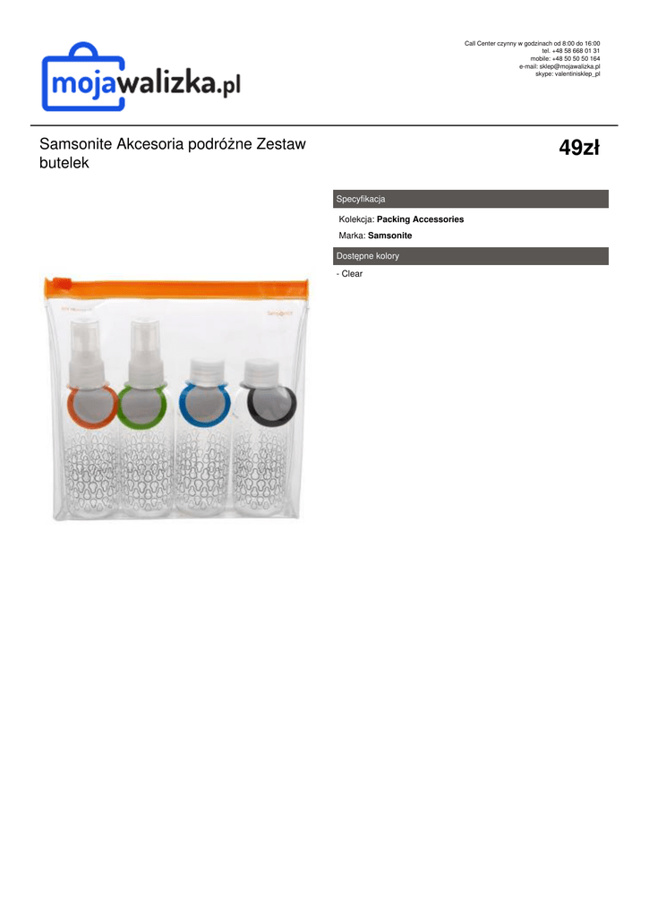 Call Center czynny w godzinach od 8:00 do 16:00 tel. +48 58 668 01 31 mobile: +48 50 50 50 164 e-mail: [email protected] skype: valentinisklep_pl 49zł Samsonite Akcesoria podróżne Zestaw butelek Specyfikacja Kolekcja: Packing Accessories Marka: Samsonite Dostępne kolory - Clear Powered by TCPDF (www.tcpdf.org)