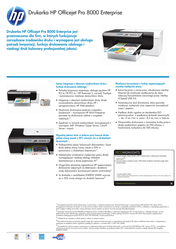 Drukarka HP Officejet Pro 8000 Enterprise Drukarka HP Officejet Pro 8000 Enterprise jest przeznaczona dla firm, w których funkcjonuje zarządzane środowisko druku i wymagana jest obsługa potrzeb korporacji, funkcja drukowania zdalnego i niedrogi druk kolorowy profesjonalnej jakości. Łatwa integracja z obecnym środowiskiem druku i funkcja drukowania zdalnego.2 ● Potrzeby korporacji zaspokoją: obsługa języków HP PCL 6, HP PCL 5c i HP Postscript 3, czcionki TrueType i automatyczna instalacja sterowników druku. ● Integracja z obecnym środowiskiem druku dzięki uniwersalnemu sterownikowi druku HP i oprogramowaniu HP Web Jetadmin. ● Możliwość drukowania podczas wyjazdów służbowych – rozwiązanie HP ePrint Enterprise pozwala na drukowanie zdalne z urządzeń mobilnych.2 ● Zgodność w różnych środowiskach, korzystających z rozwiązań SAP, Windows Cluster Server, Citrix® Server i innych. Możliwość korzystania z funkcji zapewniających wysoką wydajność pracy. ● Łatwe łączenie z siecią przez wbudowany interfejs Ethernet lub możliwość podłączenia do stacji roboczej/koncentratora sieciowego przez interfejs Hi-Speed USB 2.0. ● Automatyczny druk dwustronny, który pozwala zwiększyć wydajność oraz zapewnia oszczędność czasu i papieru. ● Prędkość druku zgodna ze standardem ISO (porównywalna z prędkością drukarek laserowych) — do 13 str./min w czerni i 8,5 str./min w kolorze. ● Niezawodne drukowanie z minimalną liczbą przerw dzięki podajnikowi papieru na 250 arkuszy, z możliwością rozbudowy do 500 arkuszy. Wysokiej jakości druk w kolorze przy koszcie druku jednej strony nawet o 50% niższym niż w drukarkach laserowych1. ● Profesjonalna jakość kolorowych dokumentów i koszt druku jednej strony niższy nawet o 50% w porównaniu z drukarkami laserowymi1. ● Maksymalne zwiększenie wydajności pracy dzięki wymagającym rzadszej obsługi wkładom atramentowym o dużej pojemności XL3. ● Oryginalne atramenty pigmentowe HP zapewniające drukowanie odpornych na blaknięcie i działanie wody dokumentów biznesowych jakości archiwalnej4. ● Ta drukarka z certyfikatem ENERGY STAR® zużywa aż o 50% mniej energii niż drukarki laserowe5. ● Zużycie energii niższe nawet o 50% w porównaniu z kolorowymi drukarkami 5 laserowymi . ● Zużycie papieru mniejsze nawet o 50% dzięki modułowi automatycznego druku dwustronnego. Certyfikat ENERGY STAR® Prosimy o oddawanie do recyklingu drukarek i materiałów eksploatacyjnych. Informacje na ten temat znajdują się na naszej stronie internetowej. 1 Na podstawie kosztów druku jednej strony w porównaniu z większością kolorowych drukarek laserowych w cenie poniżej 200 EUR bez VAT, lipiec 2010 r.; Szczegółowe informacje na stronie: www.hp.com/eur/ojfacts. Koszt w przeliczeniu na stronę w przypadku produktów OJ Pro z wkładami o największej pojemności w druku ciągłym według normy ISO; więcej informacji można znaleźć na stronie www.hp.com/go/learnaboutsupplies. 2 Wymaga wdrożenia serwera BlackBerry Enterprise Server, smartfonu BlackBerry z systemem operacyjnym OS 4.5 lub nowszym, z obsługą Internetu i poczty elektronicznej oraz oddzielnego wykupienia usługi Internetu bezprzewodowego, a także aplikacji HP ePrint i serwera HP ePrint. Rozwiązanie współpracuje z drukarkami obsługującymi języki PCL5/6, PCL3, PCL3GUI (HP i innych producentów). 3 4 Wkłady XL nie wchodzą w skład zestawu, należy je zakupić osobno. Na podstawie prognoz przemysłu papierniczego dot. papierów bezkwasowych, z oryginalnymi atramentami HP; dane o stabilności barwników w temperaturze pokojowej na podstawie testów zgodności podobnych systemów z normami ISO 11798 i ISO 18909. 5 Na podstawie zużycia energii w porównaniu z większością kolorowych drukarek laserowych w cenie poniżej 200 EUR bez VAT, marzec 2010 r.; szczegółowe informacje na stronie www.hp.com/eur/ojfacts. Zużycie energii określane na podstawie testów HP z wykorzystaniem kryteriów metody testowej TEC programu ENERGY STAR®. Drukarka HP Officejet Pro 8000 Enterprise DANE TECHNICZNE Technologia druku Technologia termiczna HP Inkjet Rozdzielczość druku W czerni (best): Do 600 x 600 dpi; Kolor (best): Do 600 x 600 dpi Prędkość druku Czarny (tryb roboczy): Do 15 str./min; Kolorowy (tryb roboczy): Do 14 str./min W czerni (best): Do 3,5 str./min; Czarny (ISO): Do 13 str./min; Kolorowy (ISO): Do 8,5 str./min Możliwości drukarki Druk bez marginesów: Brak Czujnik automatycznie rozpoznający rodzaj papieru: Brak; Obsługiwane drukowanie bezpośrednie: Brak Standardowe języki drukarki HP PCL 6, PCL 5, emulacja HP Postscript Level 3 Zgodne typy atramentu Pigmentowy Standardowe podłączenia 1 port Hi-Speed USB 2.0; 1 port Ethernet (obsługuje protokoły sieciowe IPv4, IPv6) Przygotowany do pracy w sieci Standardowy (wbudowana karta Ethernet) Możliwości pracy w sieci Wbudowany Możliwość pracy bezprzewodowej Opcjonalny, dostępny wraz z zakupem akcesorium sprzętowego Panel sterowania 8 przycisków sterowania na panelu przednim (Power (Zasilanie), Resume (Wznów), Cancel (Anuluj), Help (Pomoc), Left navigation (W lewo), Right navigation (W prawo), OK, Back (Wstecz)); 3 diody LED (1 dioda przyciągająca uwagę (Attention), 1 dioda zalecająca wznowienie druku (Resume), 1 dioda sygnalizująca stan zasilania (Power) Normatywny cykl pracy (miesięcznie, format A4) Zalecana ilość stron drukowanych miesięcznie Nośniki Do 15000 stron Obsługiwane formaty nośników A4; A5; A6; B5 (JIS); 10 x 15 cm; koperty (DL, C6, C5) Własne wymiary nośników Od 76 x 127 do 216 x 356 mm Obsługiwana gramatura nośników Od 60 do 250 g/m2 Obsługa papieru Podajnik papieru na 250 arkuszy, odbiornik wydruków na 150 arkuszy, automatyczny druk dwustronny, opcjonalny drugi podajnik na 250 arkuszy Opcja druku dwustronnego: Automatyczny (standardowo) Pamięć standardowa 256 MB prędkość procesora 360 MHz Zgodne systemy operacy